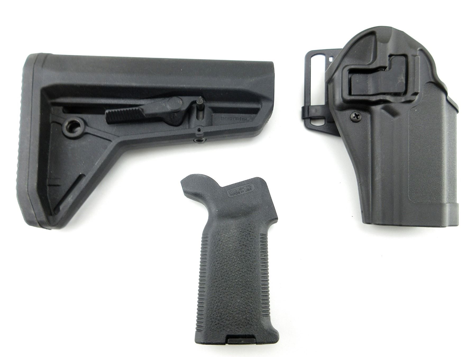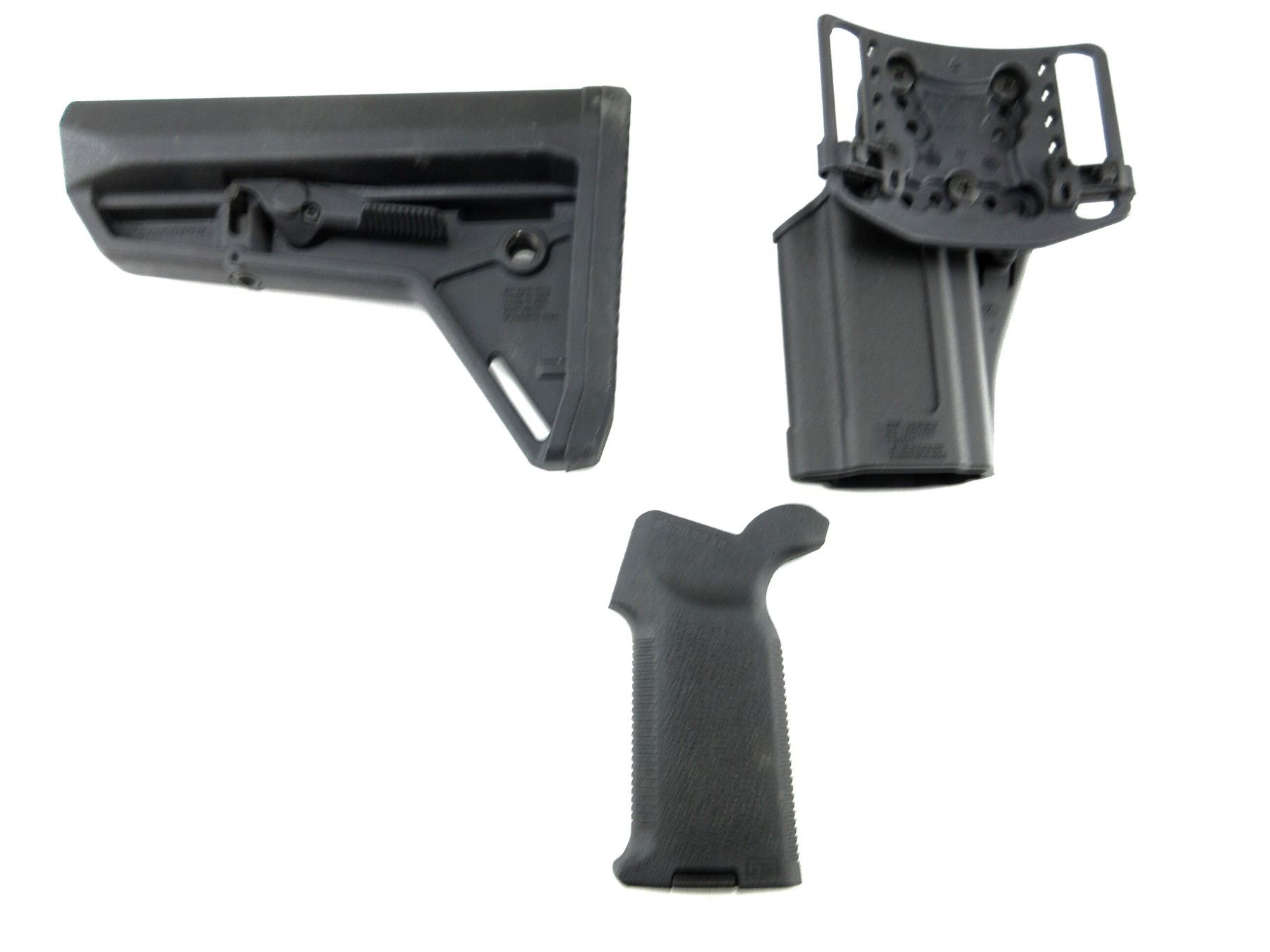 LOT INCLUDES; (1) MAGPUL MOE SL M4 BUTT STOCK, BLACK POLYMER CONSTRUCTION, OVERALL LENGTH APPROX. 7.25", (1) MAGPUL MOE K2 PISTOL GRIP, BLACK POLYMER CONSTRUCTION, WITH SCREW & (1) BLACKHAWK CQC SIG P250 / 320 HOLSTER, BLACK POLYMER. MAY REQUIRE FITTING. SEE PHOTOS.