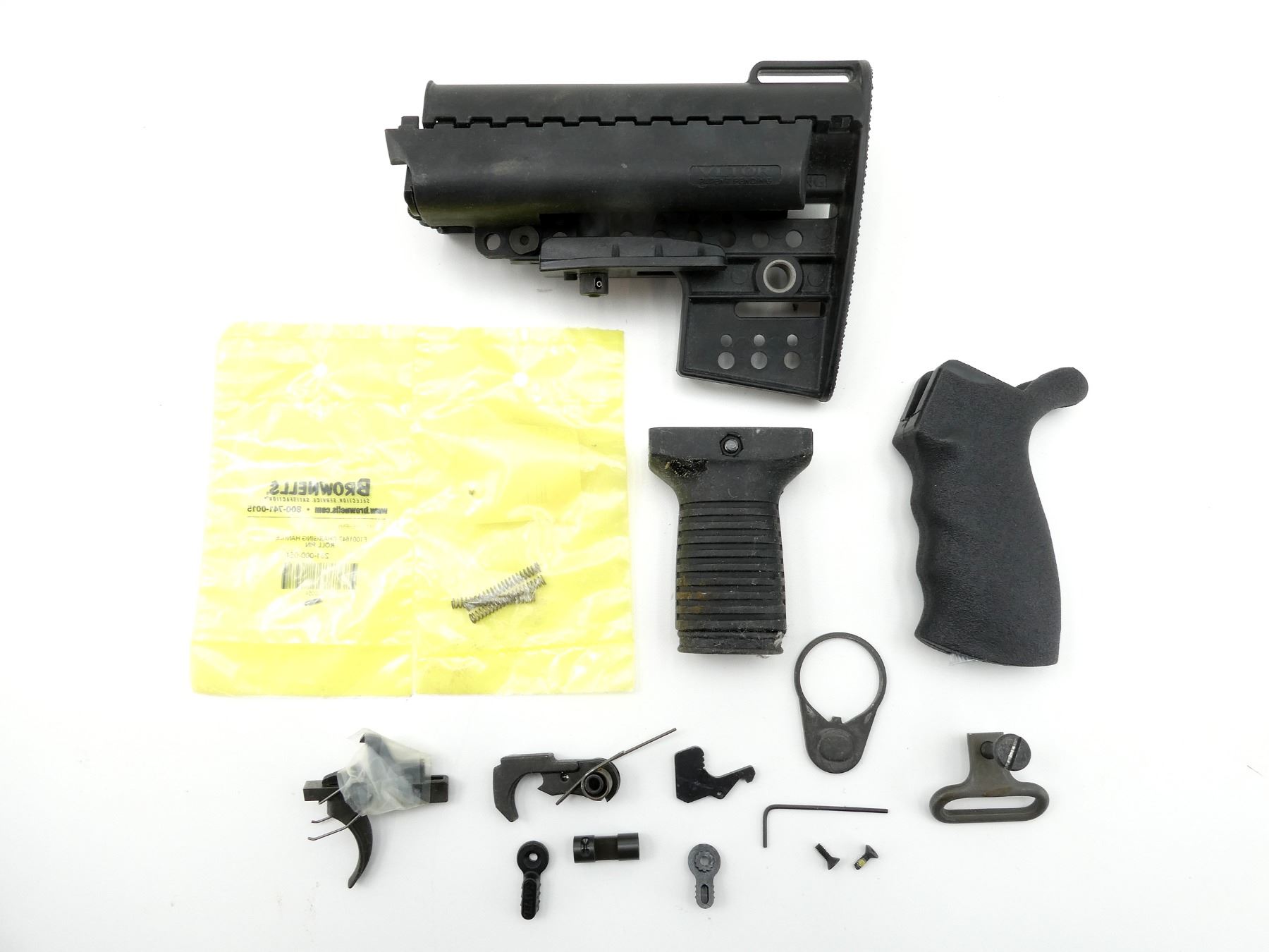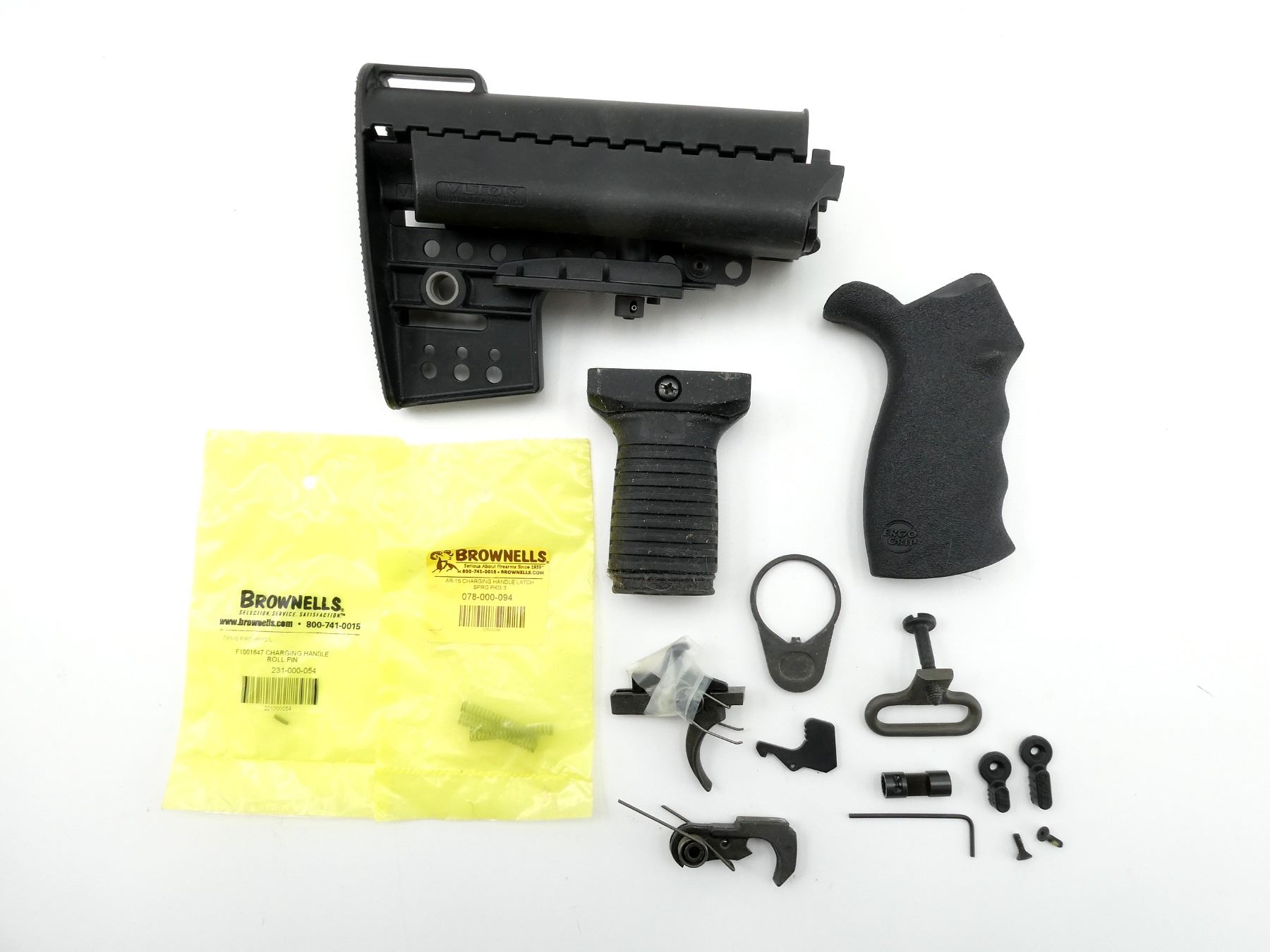 LOT INCLUDES; VLTOR M4 STYLE COLLAPSIBLE BUTT STOCK, ERGO PISTOL GRIP, STOCK PLATE, SWIVEL, AMBIDEXTROUS SAFETY, CHARGING HANDLE ROLL PIN / SPRING / LATCH, TRIGGER MECH. PARTS, SHORT VERTICAL GRIP, ETC. MAY REQUIRE FITTING. SEE PHOTOS.