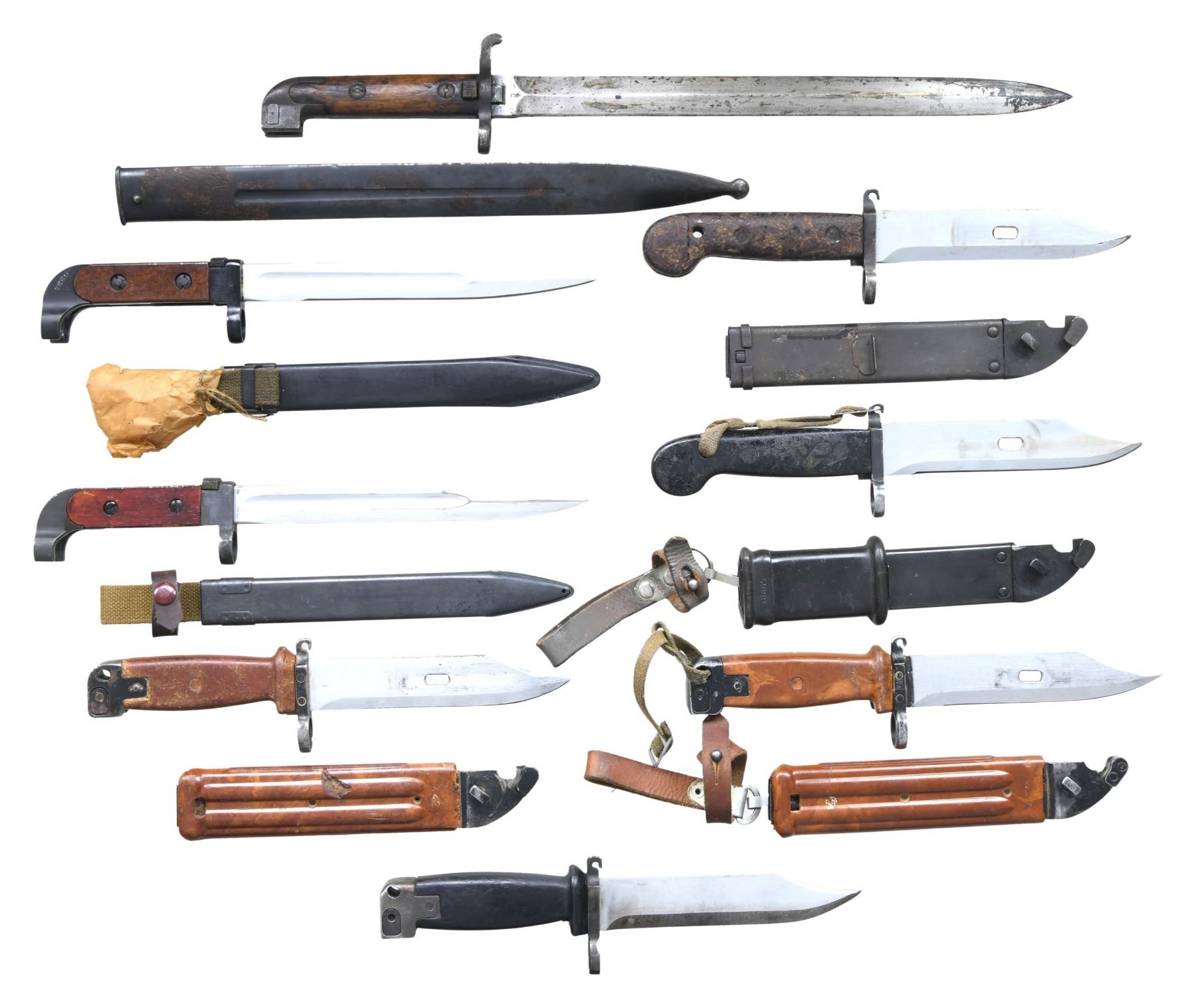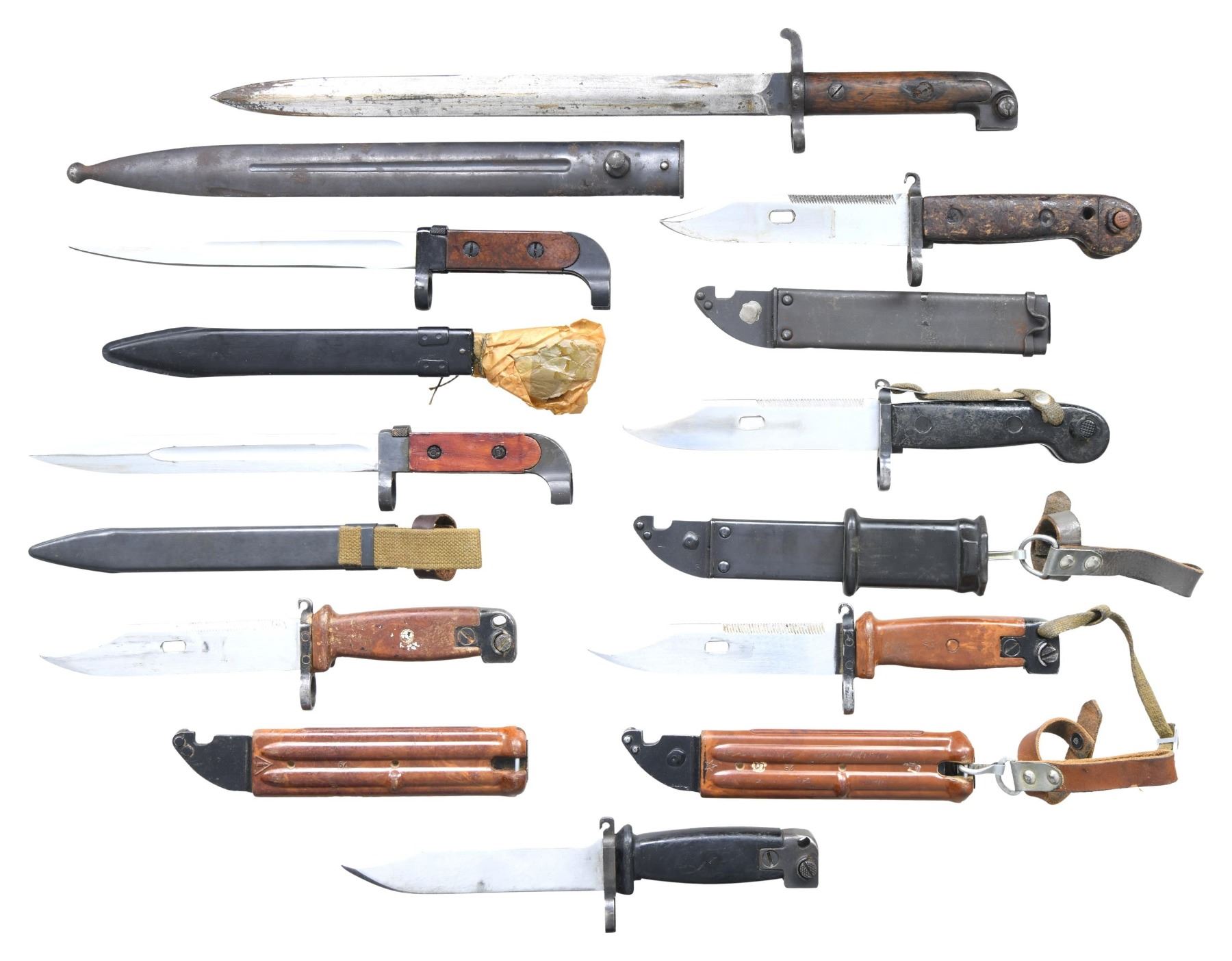 This lot consists of the following: 1) Swedish M94/14 Bayonet with scabbard. Blade has crown "C" Carl Gustaf proof. CONDITION: wooden handles show scattered dings & staining. Metal parts of bayonet show scattered oxidation, areas turning gray & some pitting most notably on one of the grip screws. Scabbard turning gray with scattered oxidation patches, a heavy patch toward bottom & some pitting. 2) Unmarked AK-47 Bayonet. Type 1 AK-47 bayonet with scabbard. Red hardwood grip panels. CONDITION: good to very good with some storage & age related wear. 3) Type II AKM Bayonet. Bayonet appears to be of Soviet mfr. with "105" marking on orange handle & Izhevsk marking on scabbard. CONDITION: bayonet & scabbard show scattered scratches, flaking & light oxidation. 4) Tula Type II AKM Bayonet. Scabbard & handle both marked with Tula star marking. CONDITION: scabbard shows a couple cracks, scattered dings & some flaking. Blade shows light oxidation. Bayonet otherwise shows scattered flaking & handling wear. 5) Izhevsk  AK-47 Bayonet. Izhevsk marked bayonet with scabbard. CONDITION: very good with some cosmoline. 6) Type II AKM bayonet. Black handles. No visible markings. No scabbard present. CONDITION: blade shows scattered light oxidation. Other metal parts of bayonet are a gray patina with oxidation & some pitting. Handles show scattered handling marks. 7) Unmarked AKM bayonet. Brown bakelite handles. CONDITION: handles show some chipping & flaking. Metal parts of bayonet show some oxidation. Scabbard shows oxidation & flaking paint. 8) Unmarked AKM bayonet. Black bakelite handles. CONDITION: grips show scattered flaking & dings. Metal shows scattered light oxidation & handling wear. Scabbard shows light flaking. (02-24116/MJC). $300-500 for lot.