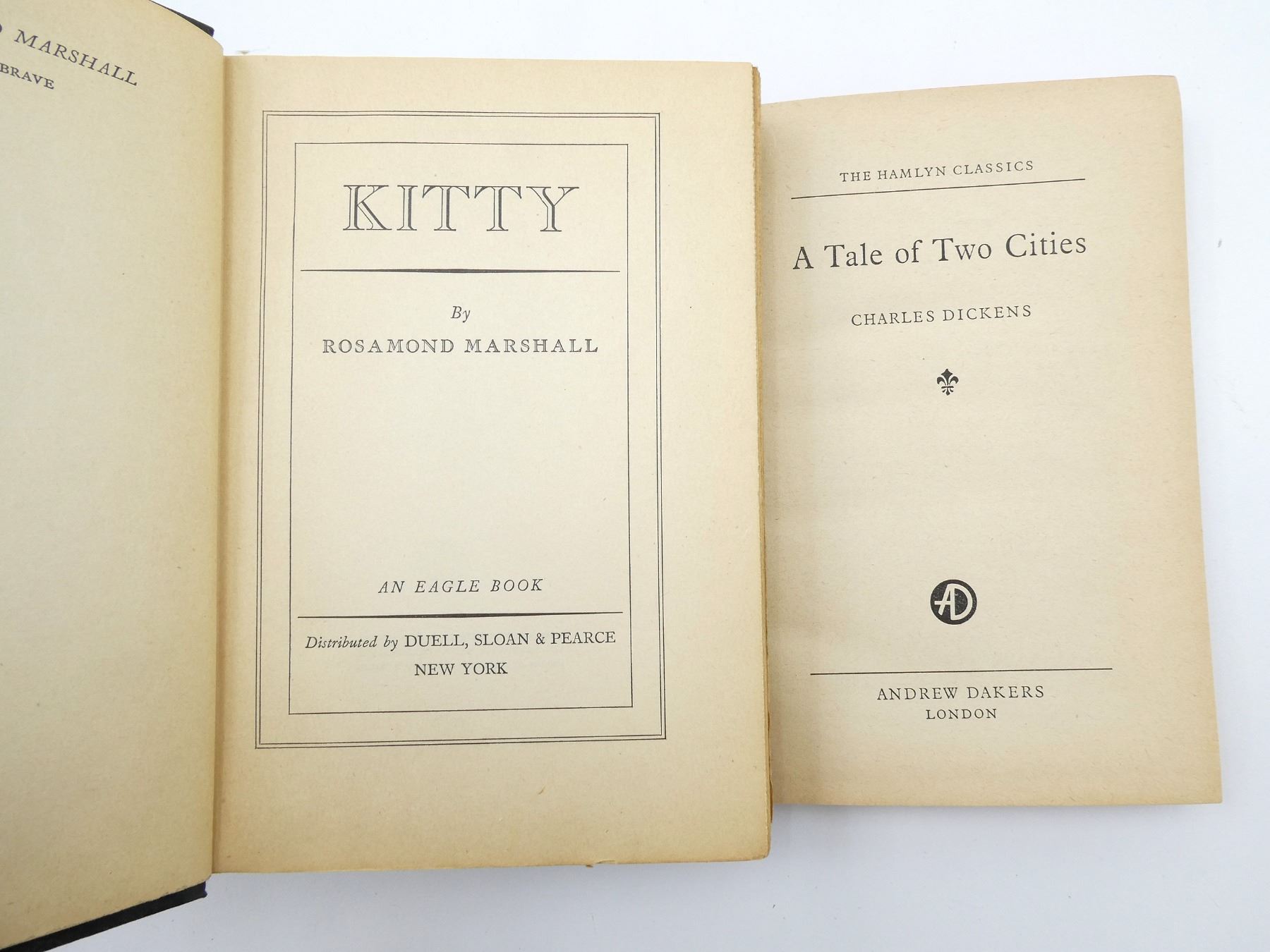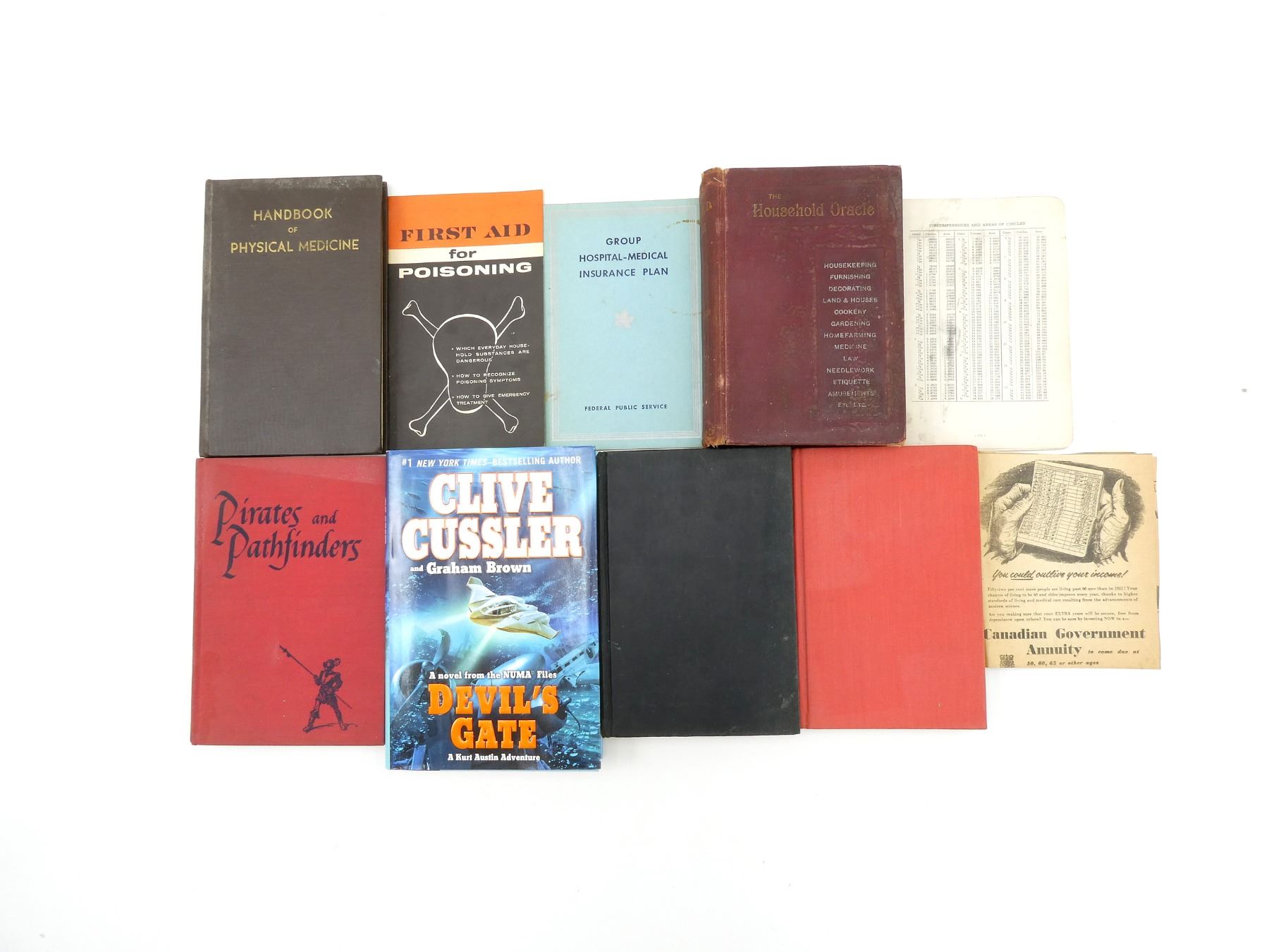 LOT INCLUDES; (1) "PIRATES AND PATHFINDERS" BOOK BY MAJORIE W. HAMILTON, HARD COVER, COPYRIGHT 1957, (1) "A TALE OF TWO CITIES" BOOK BY CHARLES DICKENS, HARD COVER, (1) "KITTY" BOOK BY ROSAMOND MARSHALL, HARD COVER, COPYRIGHT 1943 , (1) "DEVIL'S GATE" BOOK BY CLIVE CUSSLER & GRAHAM BROWN, HARD COVER WITH DUST COVER, ISBN: 978-0-399-15782-0, (1) "THE HOUSEHOLD ORACLE" BOOK EDITED BY ALFRED H. MILES, HARD COVER, ETC. SEE PHOTOS.