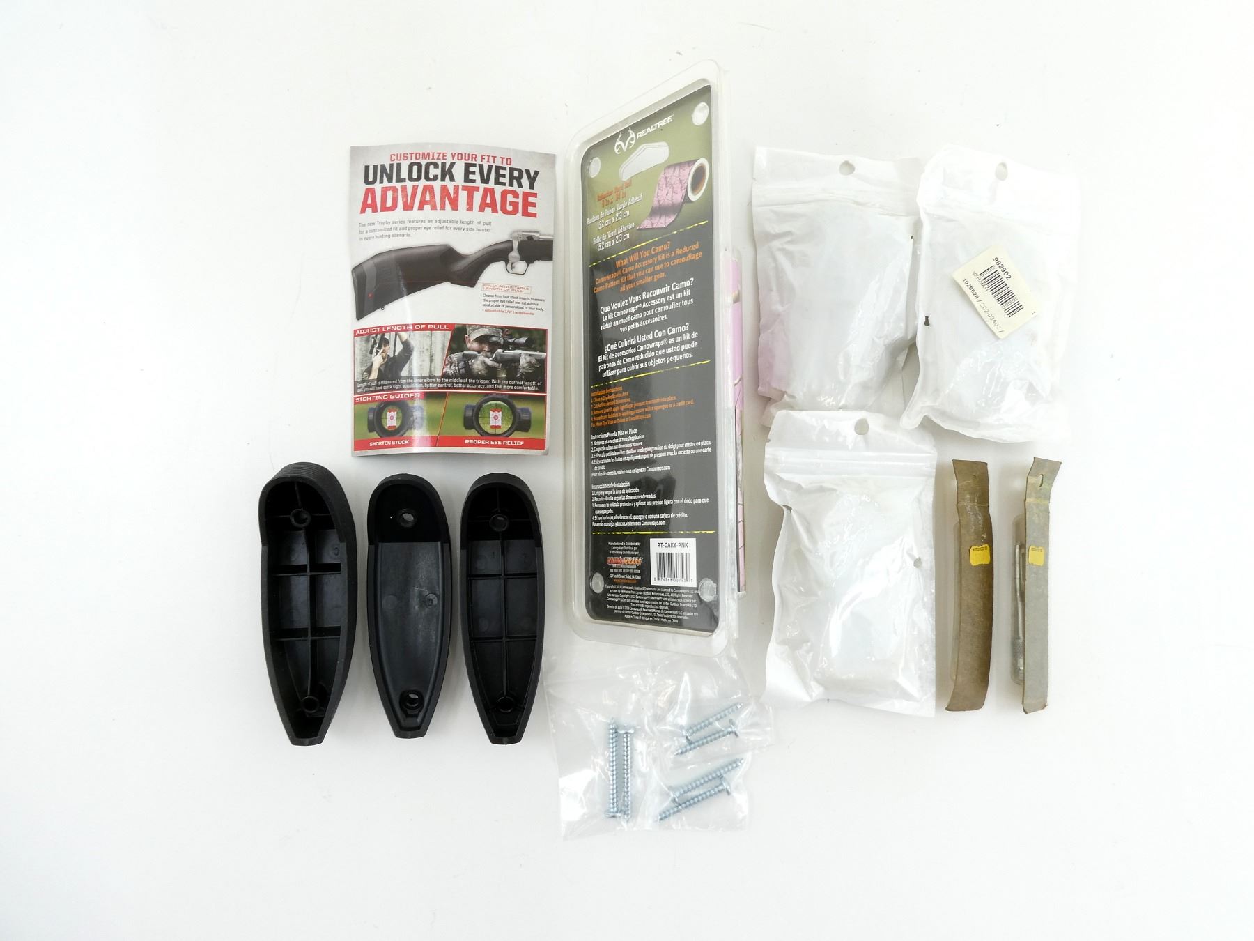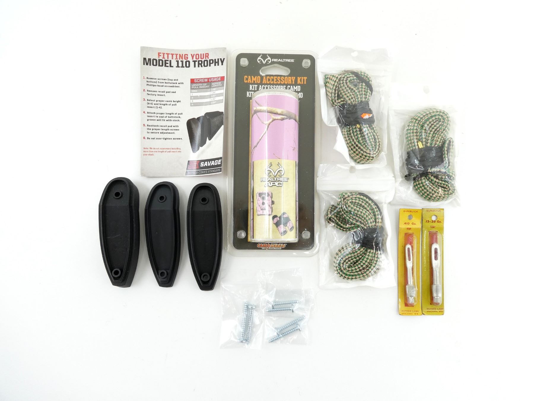 LOT INCLUDES; (3) UNKNOWN BORE SNAKES, APPEARS NEW OLD STOCK, (1) SAVAGE 110 ACCESSORY KIT RECOIL STYLE PADS, MAY NOT BE COMPLETE, (1) "REALTREE CAMO ACCESSORY KIT", PINK CAMOUFLAGE ADHESIVE VINYL ROLL, APPROX. 84" X 6", APPEARS NEW OLD STOCK, (1) GUNSLICK .410 G. CLEANING TIP, NEW OLD STOCK IN ORIGINAL SEALED PACKAGING, (1) GUNSLICK 12-20 G. CLEANING TIP, NEW OLD STOCK IN ORIGINAL SEALED PACKAGING. MAY REQUIRE FITTING. SEE PHOTOS.