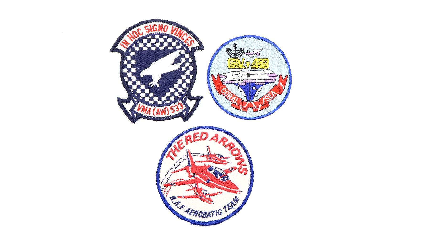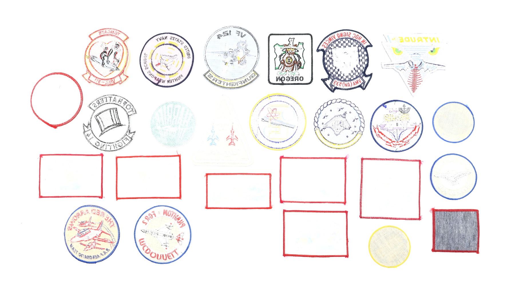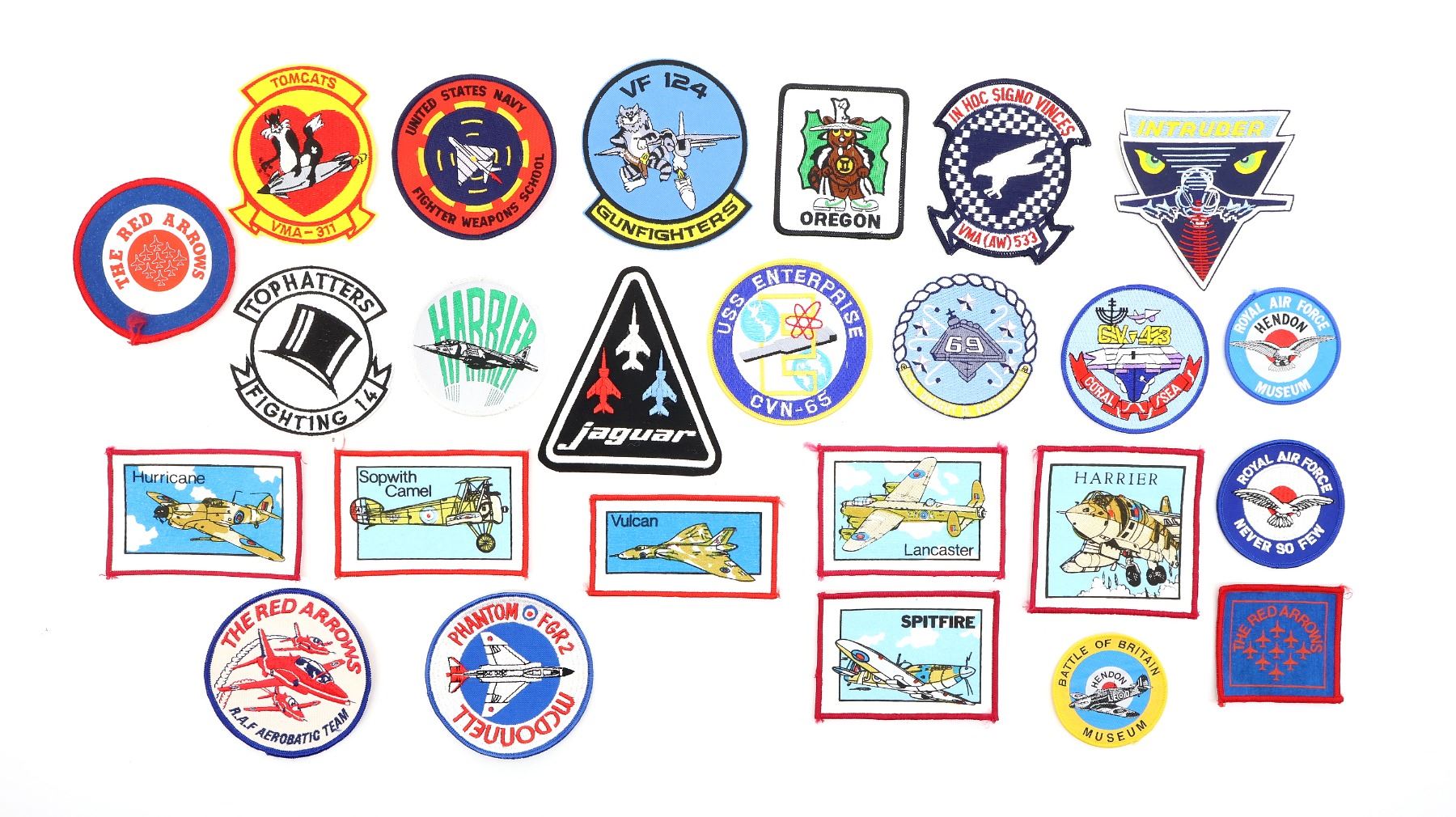 APPROX. (25) PIECES, VARIOUS SIZES / STYLES / COLOURS / MATERIALS, INCLUDES; THE RED ARROWS, MCDONNELL PHANTOM FGR2, BATTLE OF BRITAIN HENDON MUSEUM, RAF NEVER SO FEW, SPITFIRE, SOPWITH CAMEL, HURRICANE, VULCAN, LANCASTER, VF 124 GUNFIGHTERS, U.S. NAVY FIGHTER WEAPONS SCHOOL, ETC. SEE PHOTOS.