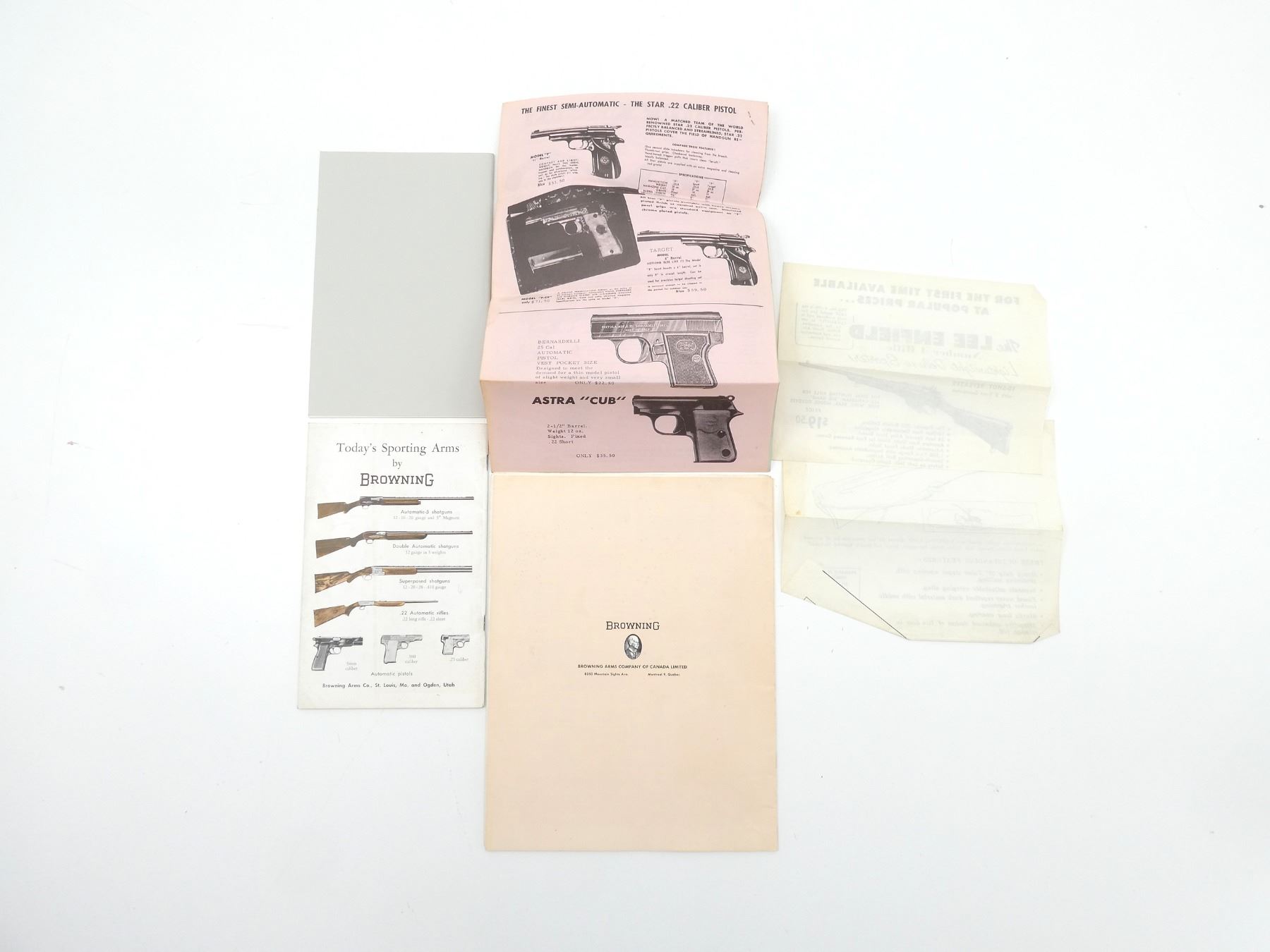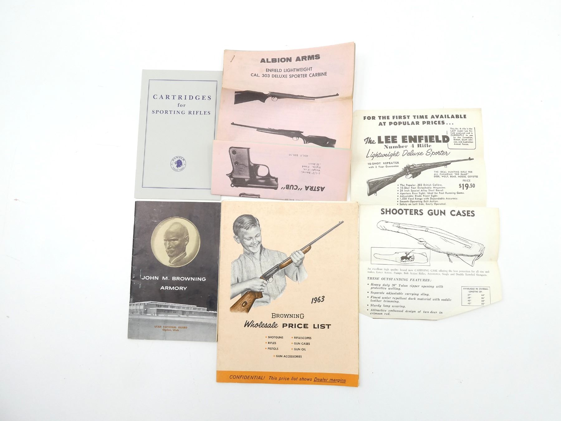 LOT INCLUDES; (1) "BROWNING 1963 WHOLESALE PRICE LIST", SOFT COVER, (1) "JOHN M. BROWNING ARMORY", BY BROWNING ARMS CO., SOFT COVER, (1) "CARTRIDGES FOR SPORTING RIFLES", BY G. BURRARD, SOFT COVER & (1) "ALBION ARMS ENFIELD LIGHTWEIGHT CAL. 303 DELUXE SPORTER CARBINE", SOFT COVER. SEE PHOTOS.