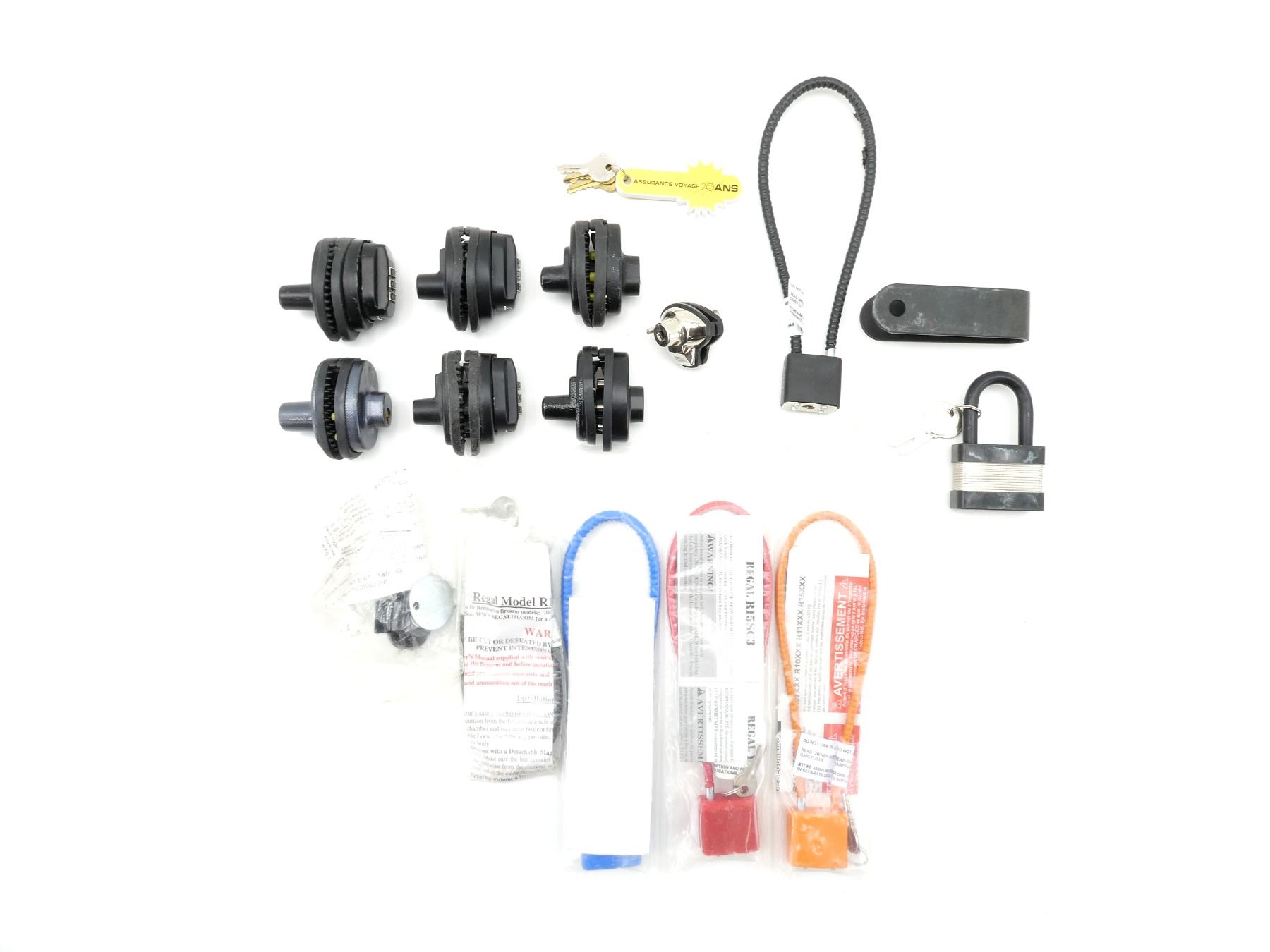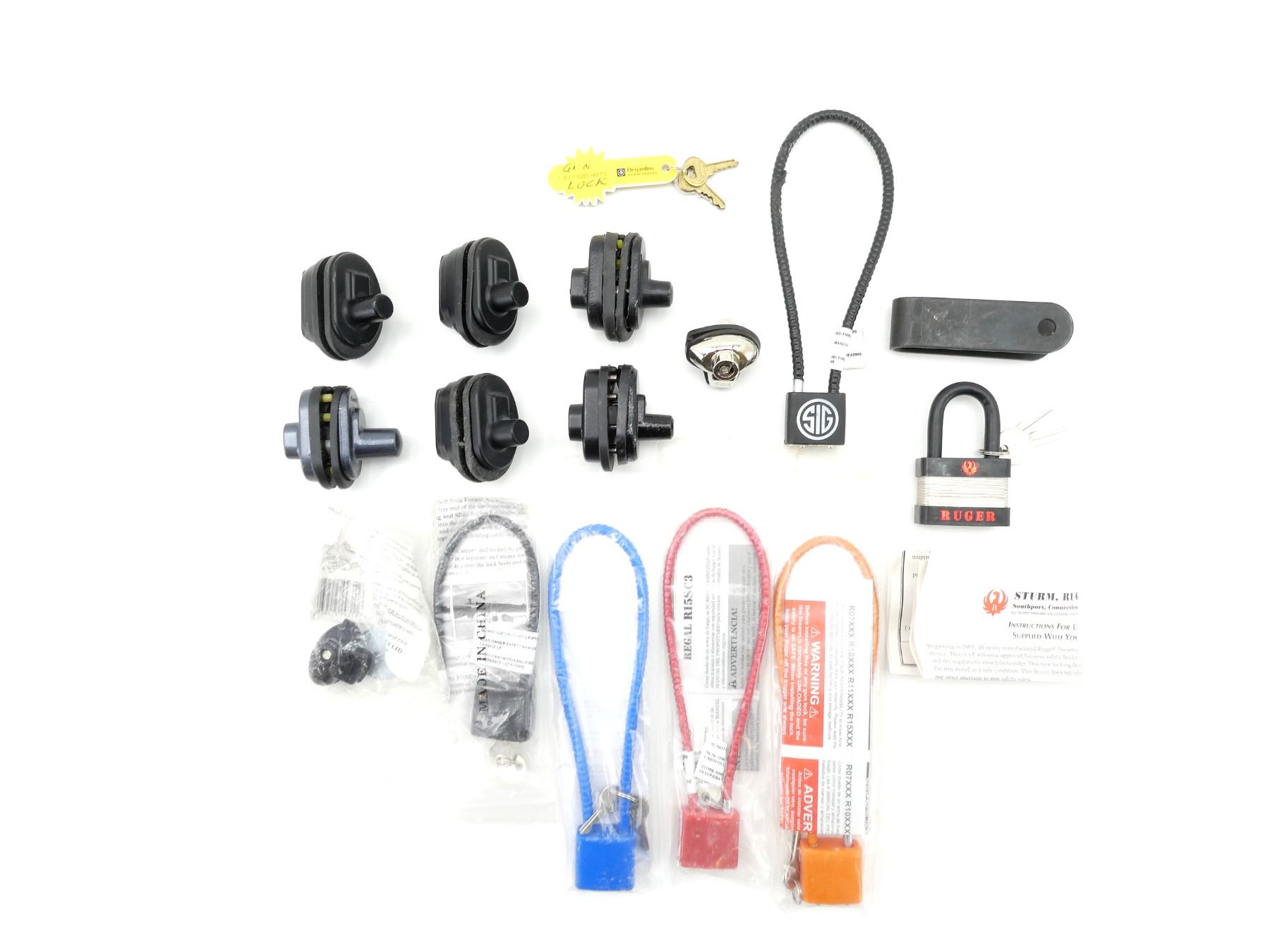 LOT INCLUDES; (5) CABLE LOCKS, 1 KEY MISSING, 4 APPEAR NEW OLD STOCK WITH KEYS AND INSTRUCTIONS, (1) TRIGGER LOCK WITH KEY, NEW OLD STOCK, SEALED IN ORIGINAL PACKAGING, (3) BLACK FRANZEN COMBINATION TRIGGER LOCKS, (1) BLACK ARROW TRIGGER LOCK WITH KEY, (1) MASTER TRIGGER LOCK WITH KEY, (1) BUCKNER TRIGGER LOCK WITH KEY & (1) RUGER PADLOCK WITH KEYS, APPEARS NEW OLD STOCK, ETC. SEE PHOTOS.