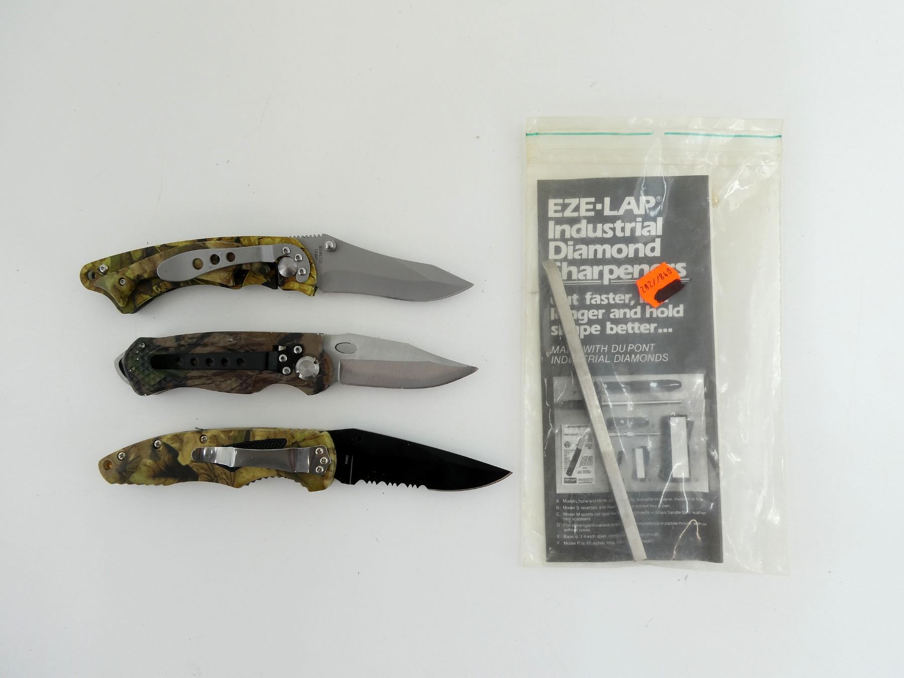 ASSORTED CAMO FOLDING KNIVES AND EZE-LAP INDUSTRIAL DIAMOND SHARPENER LOT