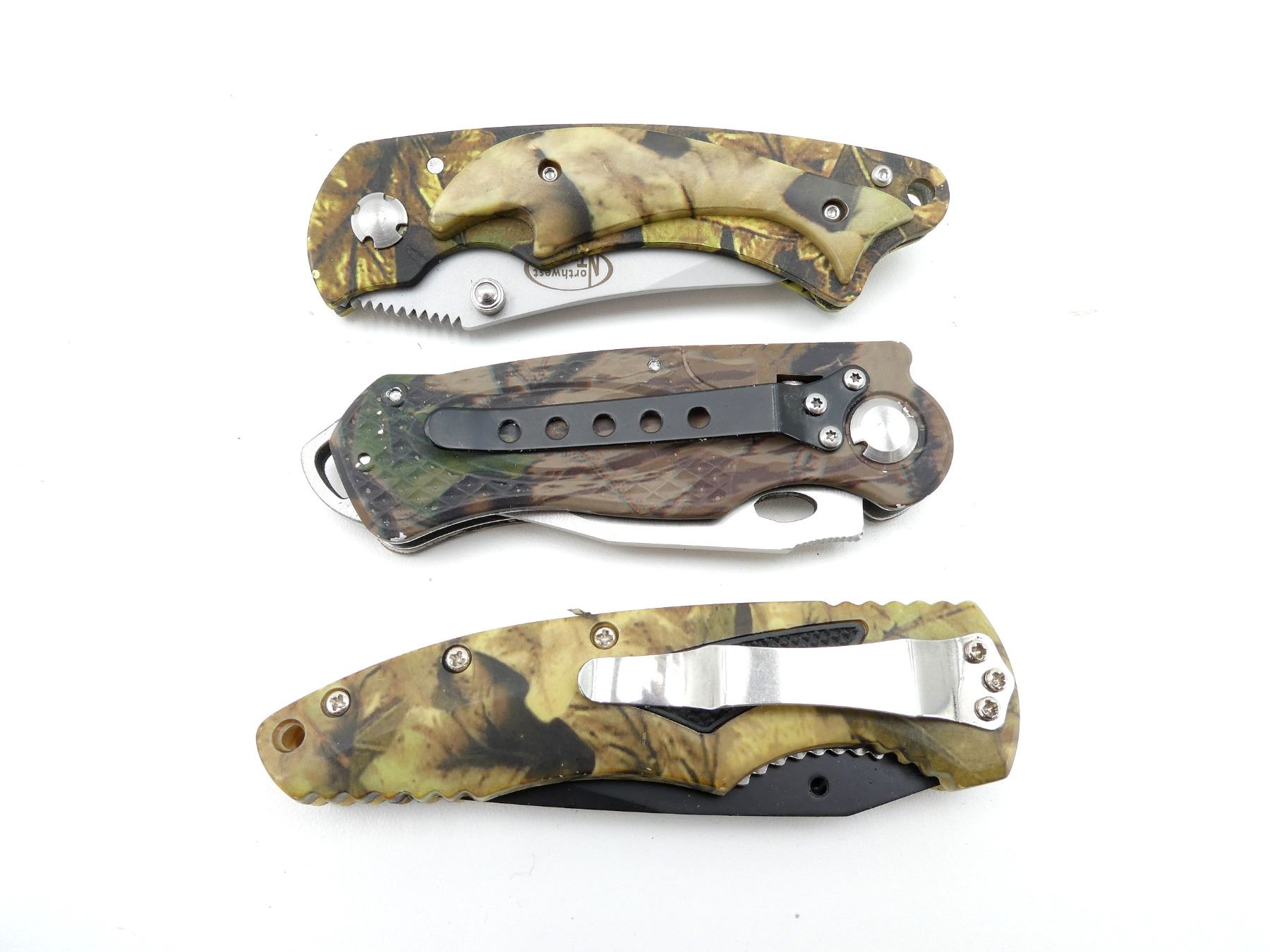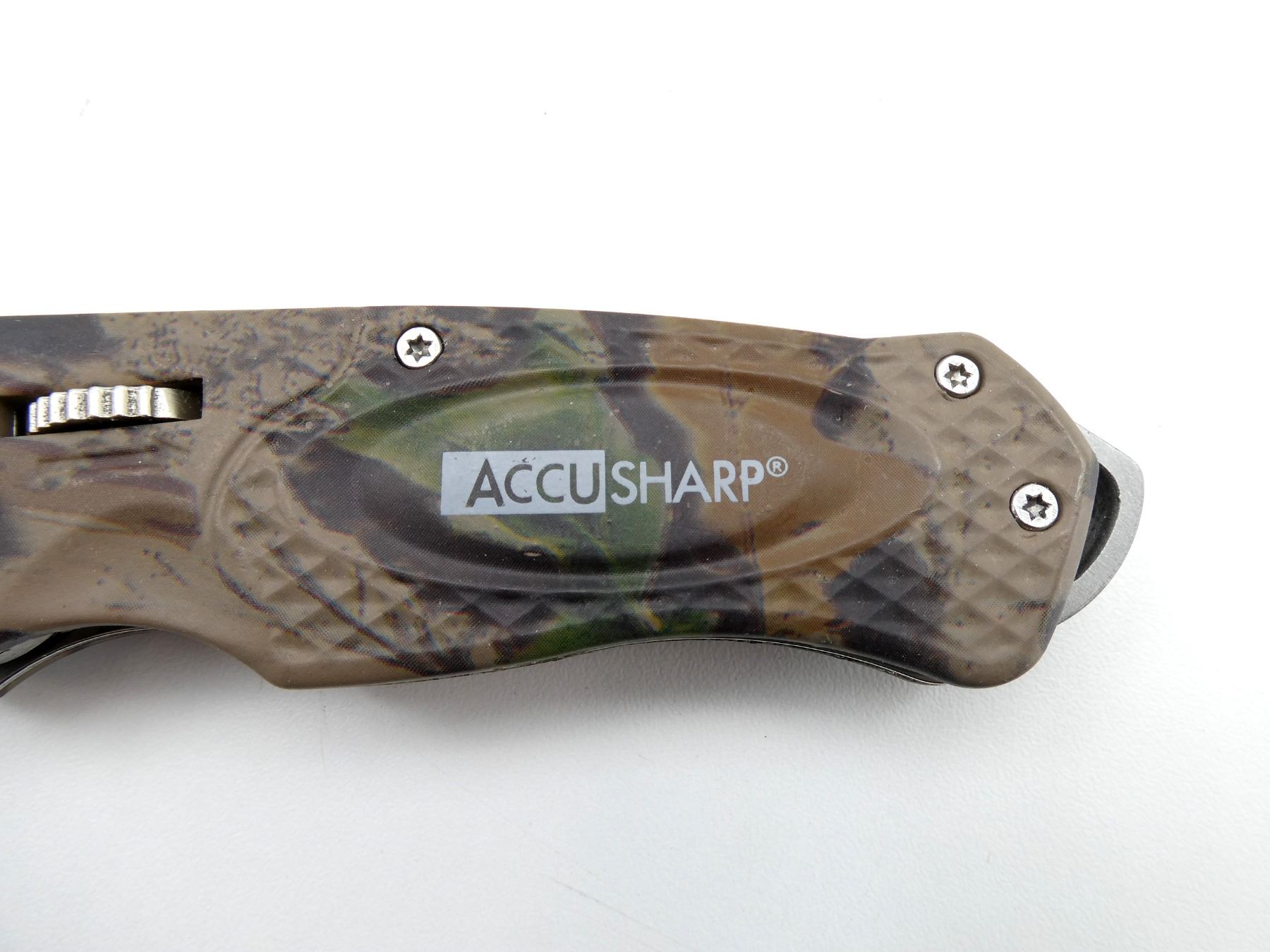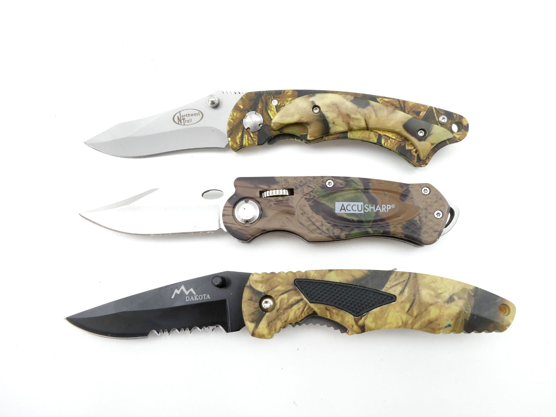 LOT INCLUDES; (1) NORTHWEST TRAIL FOLDING KNIFE, STEEL BLADE, BLADE MARKED "NORTHWEST TRAIL", ETC., CAMO METAL & POLYMER HANDLE, UNMARKED, SHOWS LIGHT WEAR & TEAR / USE MARKS, BLADE OVERALL LENGTH APPROX. 3.5", OVERALL LENGTH APPROX. 7.5", (1) ACCUSHARP FOLDING KNIFE, STEEL BLADE, UNMARKED, CAMO METAL HANDLE, MARKED "ACCUSHARP", SHOWS LIGHT WEAR & TEAR / USE MARKS, BLADE OVERALL LENGTH APPROX. 3", OVERALL LENGTH APPROX. 7", (1) DAKOTA FOLDING KNIFE, STEEL BLADE, MARKED "DAKOTA", ETC., CAMO POLYMER HANDLE, UNMARKED, SHOWS LIGHT WEAR & TEAR / USE MARKS, BLADE OVERALL LENGTH APPROX. 4", OVERALL LENGTH APPROX. 8" & (1) EZE-LAP INDUSTRIAL DIAMOND SHARPENER, SHOWS WEAR & TEAR / USE MARKS, IN ORIGINAL PACKAGING. SEE PHOTOS.