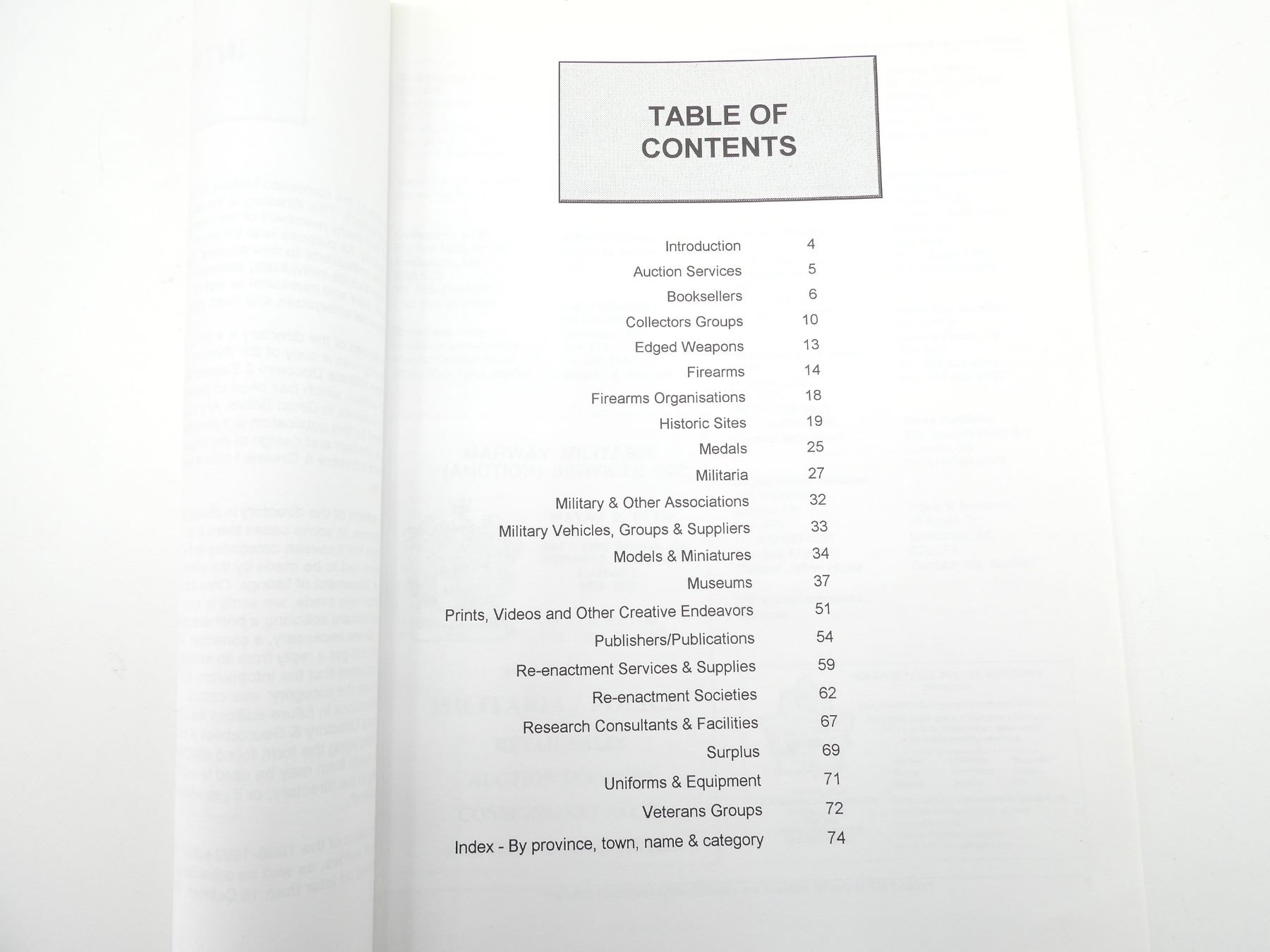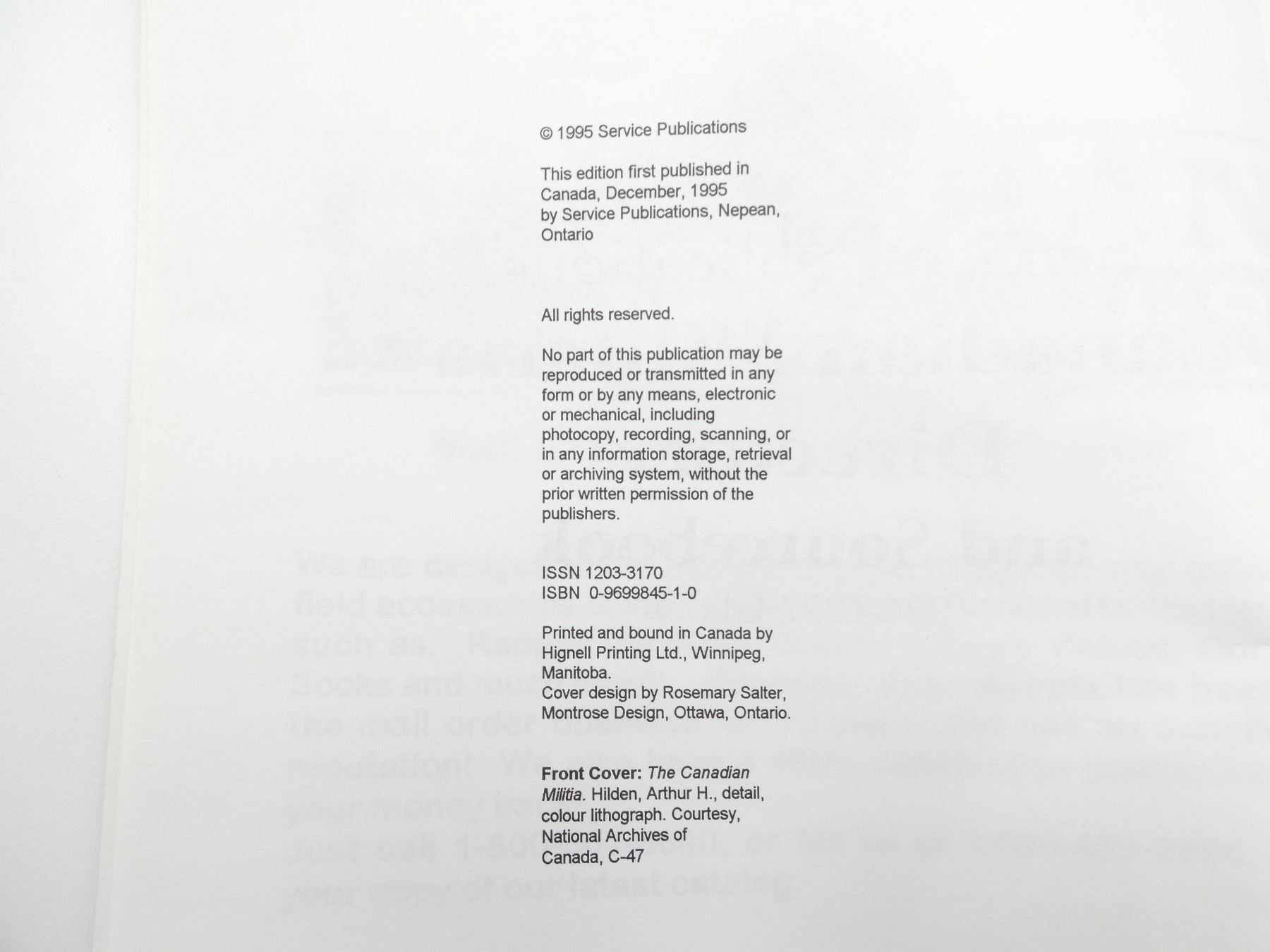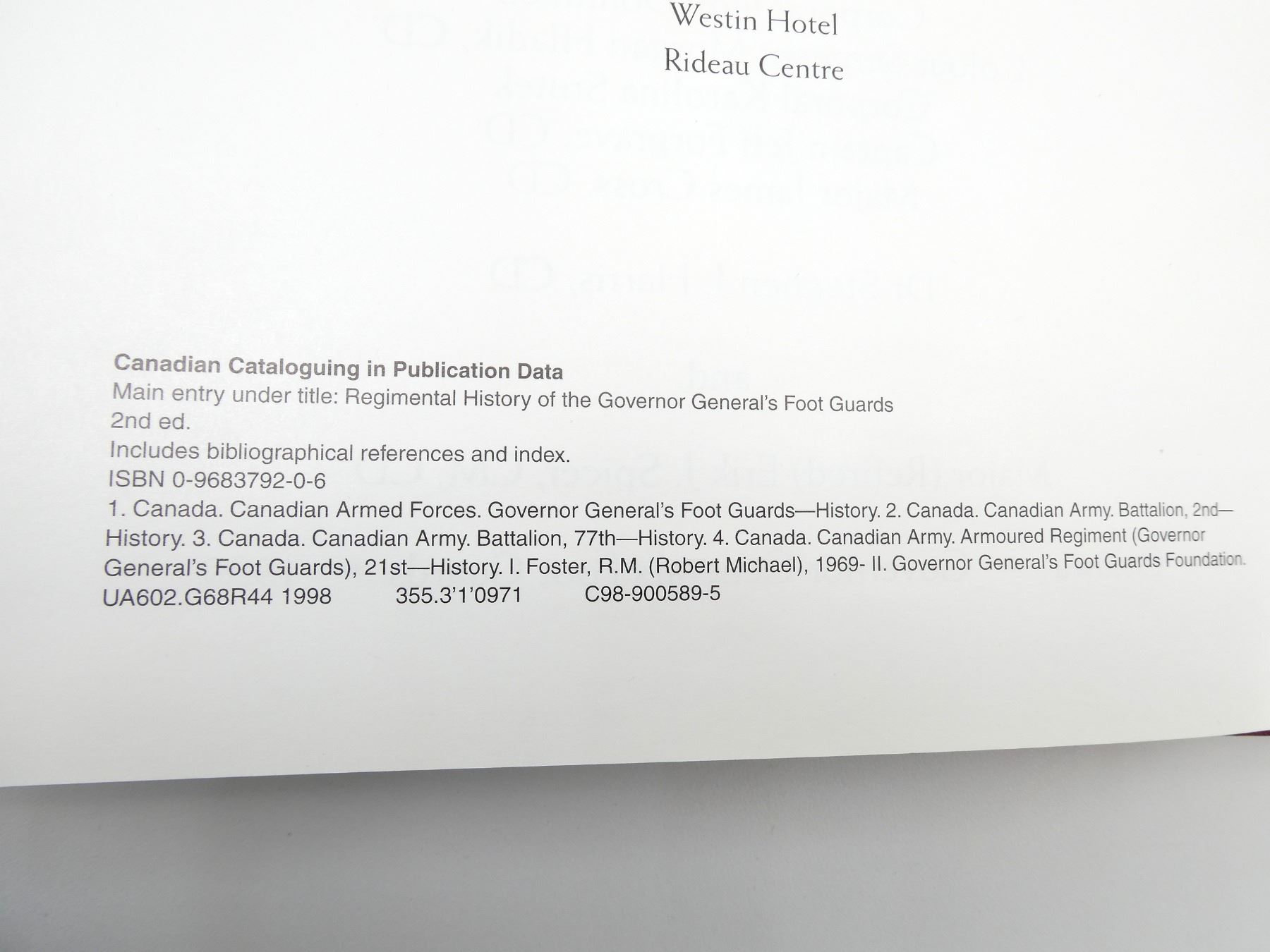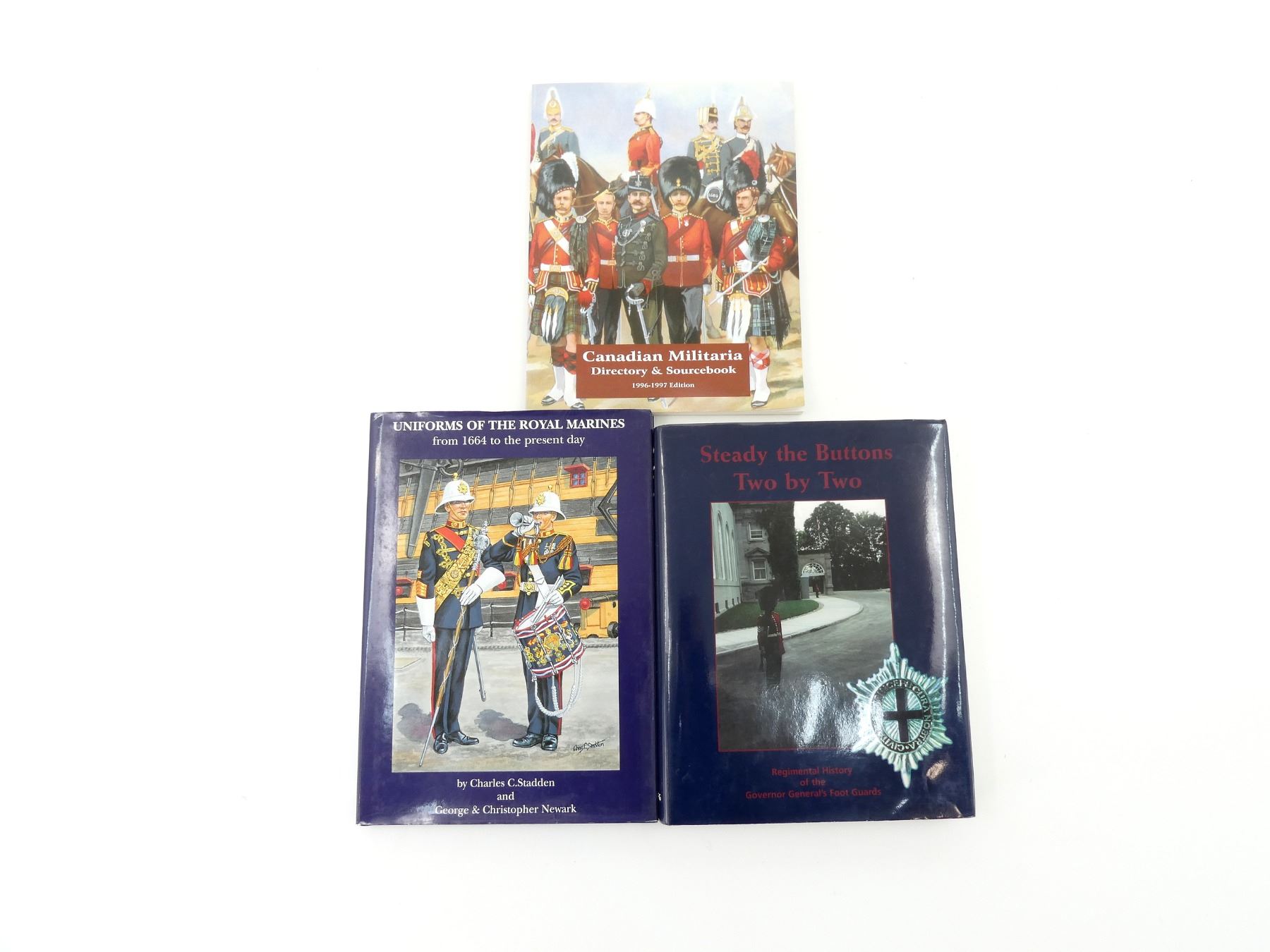 LOT INCLUDES; (1) "UNIFORMS OF THE ROYAL MARINES FROM 1664 TO THE PRESENT DAY" BOOK BY CHARLES C. STADDEN & GEORGE / CHRISTOPHER NEWARK, HARD COVER WITH DUST COVER, ISBN: 0-9519342-2-8, (1) "STEADY THE BUTTONS, TWO BY TWO, REGIMENTAL HISTORY OF THE GOVERNOR GENERAL'S FOOT GUARDS" BOOK BY CAPTAIN ROBERT M. FOSTER, CD, HARD COVER WITH DUST COVER, ISBN: 0-9683792-0-6 & (1) "CANADIAN MILITARIA DIRECTORY & SOURCEBOOK, 1996-1997 EDITION" BOOK, SOFT COVER, ISBN: 0-9699845-1-0. SEE PHOTOS.
