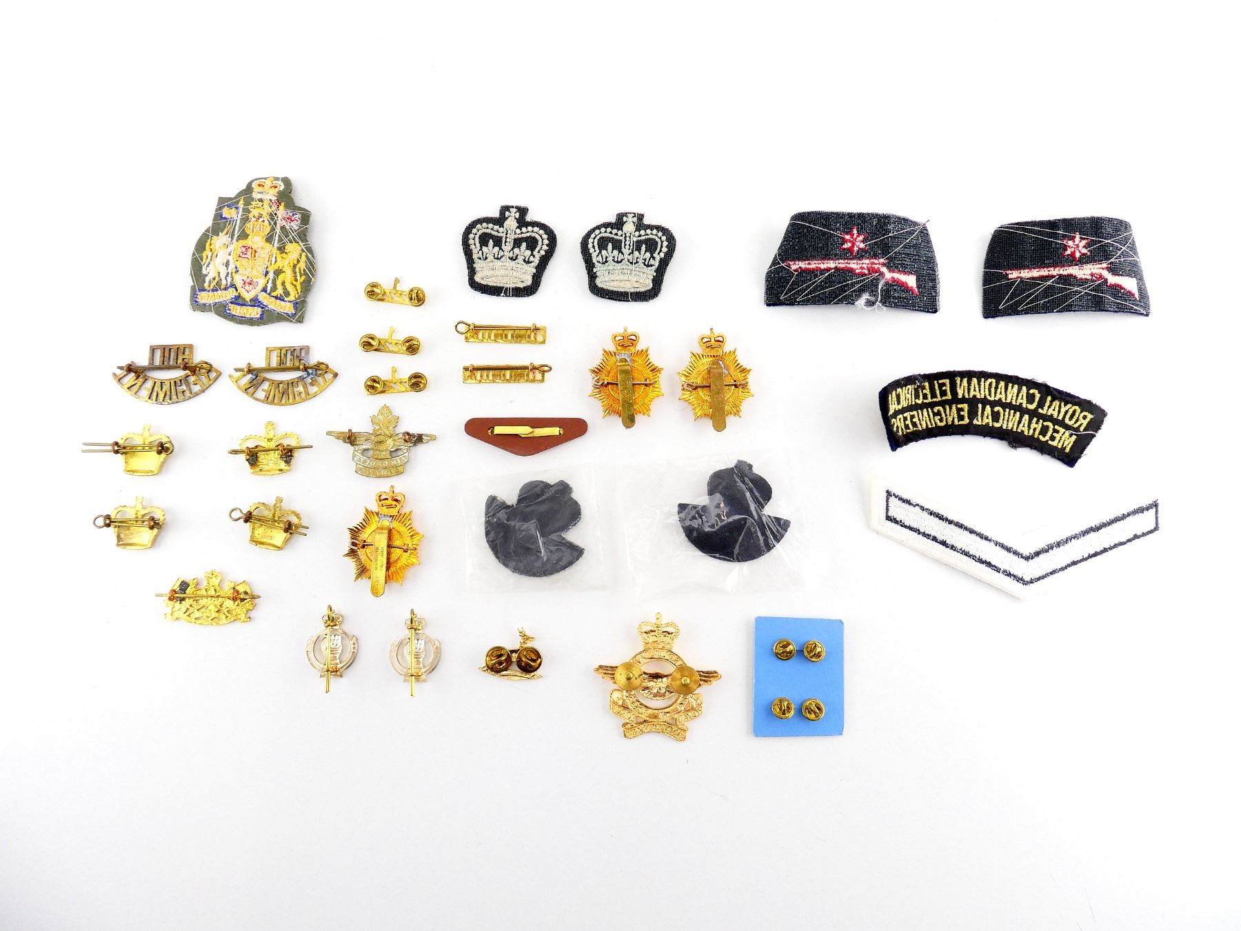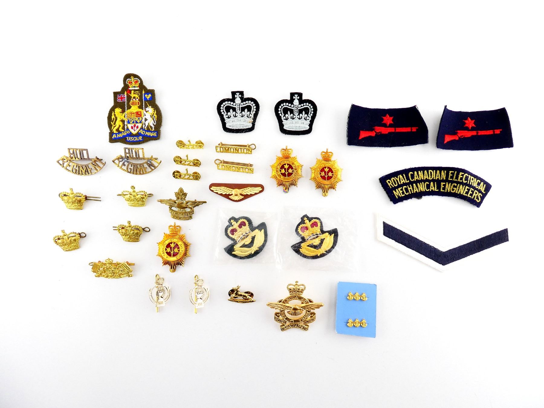 APPROX. (32) PIECES, QUEEN'S CROWNS, VARIOUS SIZES / COLOURS / MATERIALS, INCLUDES; QUEEN'S CROWN BRASS BADGES, QUEEN'S CROWN EMBROIDERED BADGES, RANK CHEVRON, EDMONTON SHOULDER FLASHES, HULL REGIMENT SHOULDER FLASHES, AIR CADETS CANADA CAP BADGE, VARIOUS RCAF BADGES, ANCHOR PINS, ROYAL CANADIAN ELECTRICAL MECHANICAL ENGINEERS BADGE, ROYAL CANADIAN ARMOUR CORPS BADGES, ETC. SEE PHOTOS.