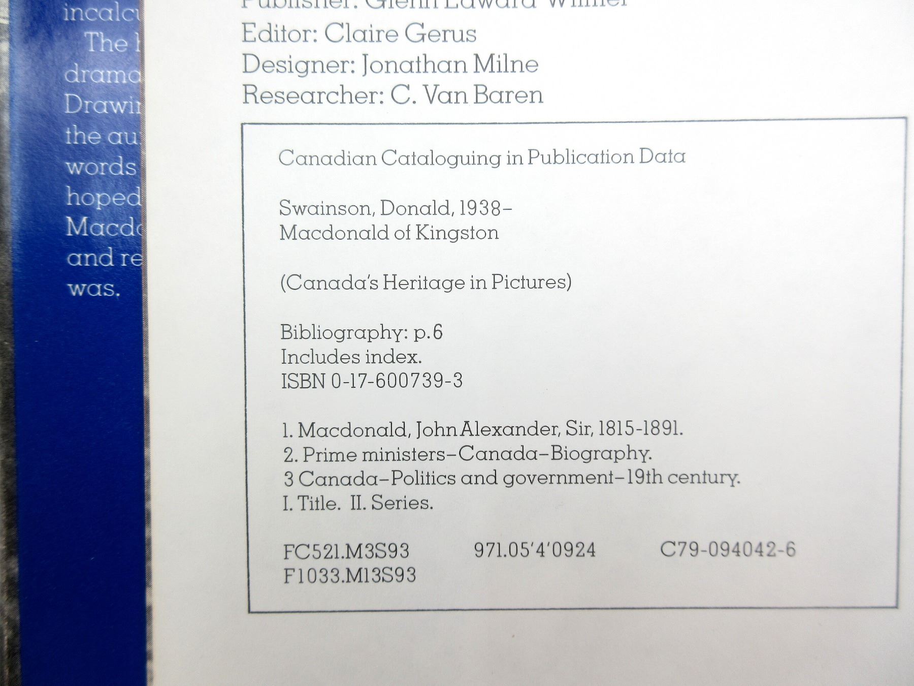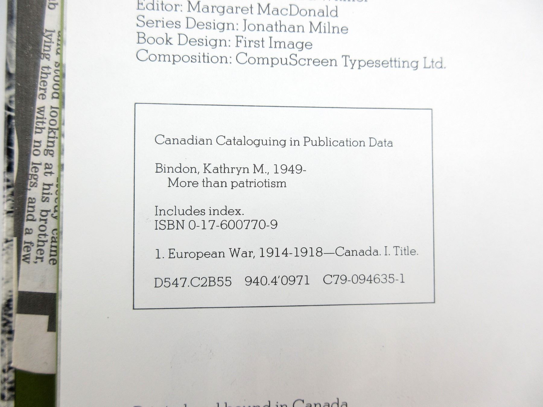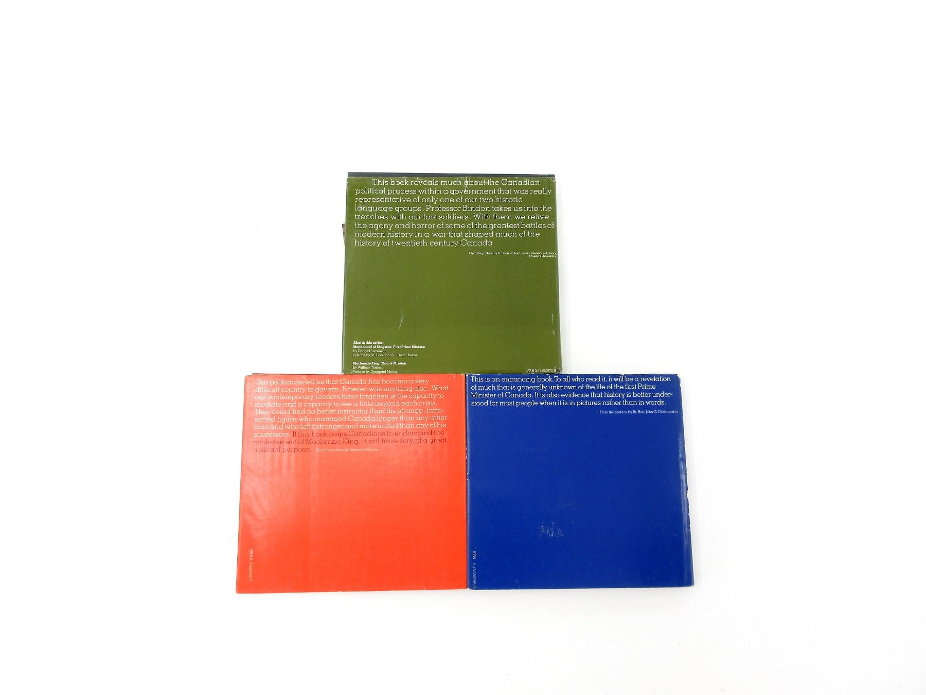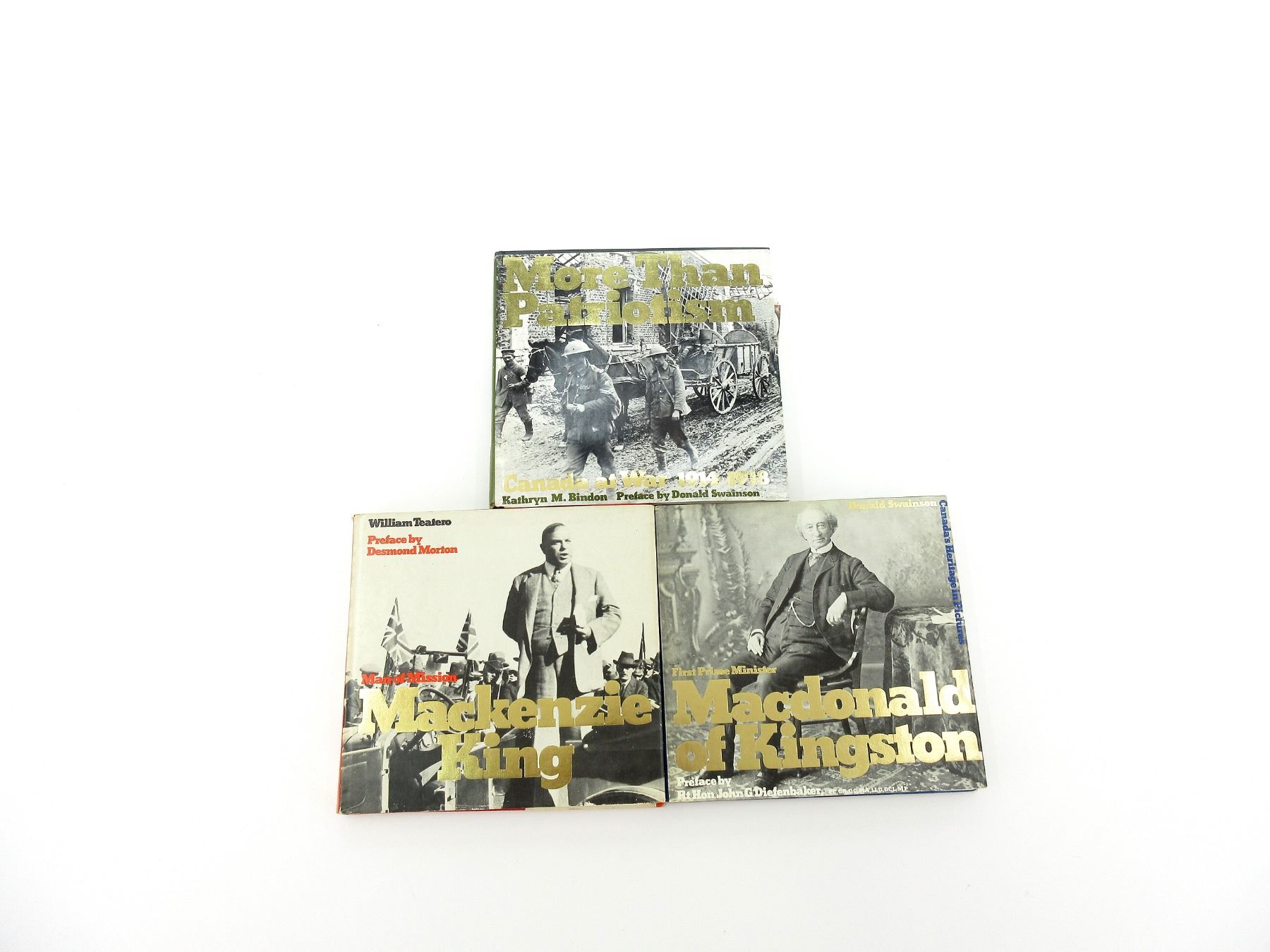 LOT INCLUDES; (1) "MORE THAN PATRIOTISM, CANADA AT WAR 1914-1918" BOOK BY KATHRYN M. BINDON, HARD COVER WITH DUST COVER, ISBN: 0-17-600770-9, (1) "MAN OF MISSION, MACKENZIE KING" BOOK BY WILLIAM TEATERO, HARD COVER WITH DUST COVER, ISBN: 0-17-600740-7 & (1) "FIRST PRIME MINITER, MACDONALD OF KINGSTON" BOOK BY DONALD SWAINSON, HARD COVER WITH DUST COVER, ISBN: 0-17-600739-3. SEE PHOTOS.