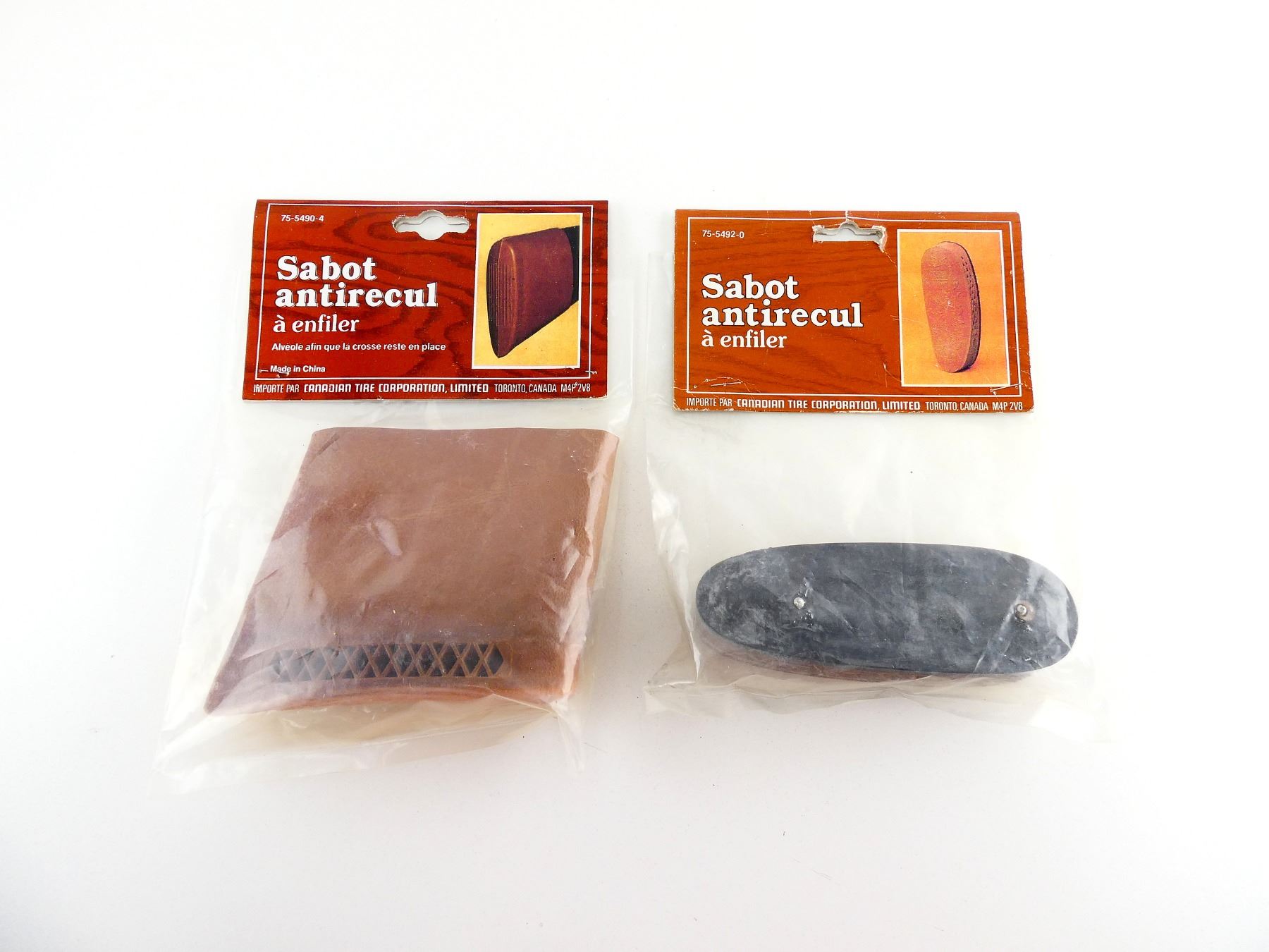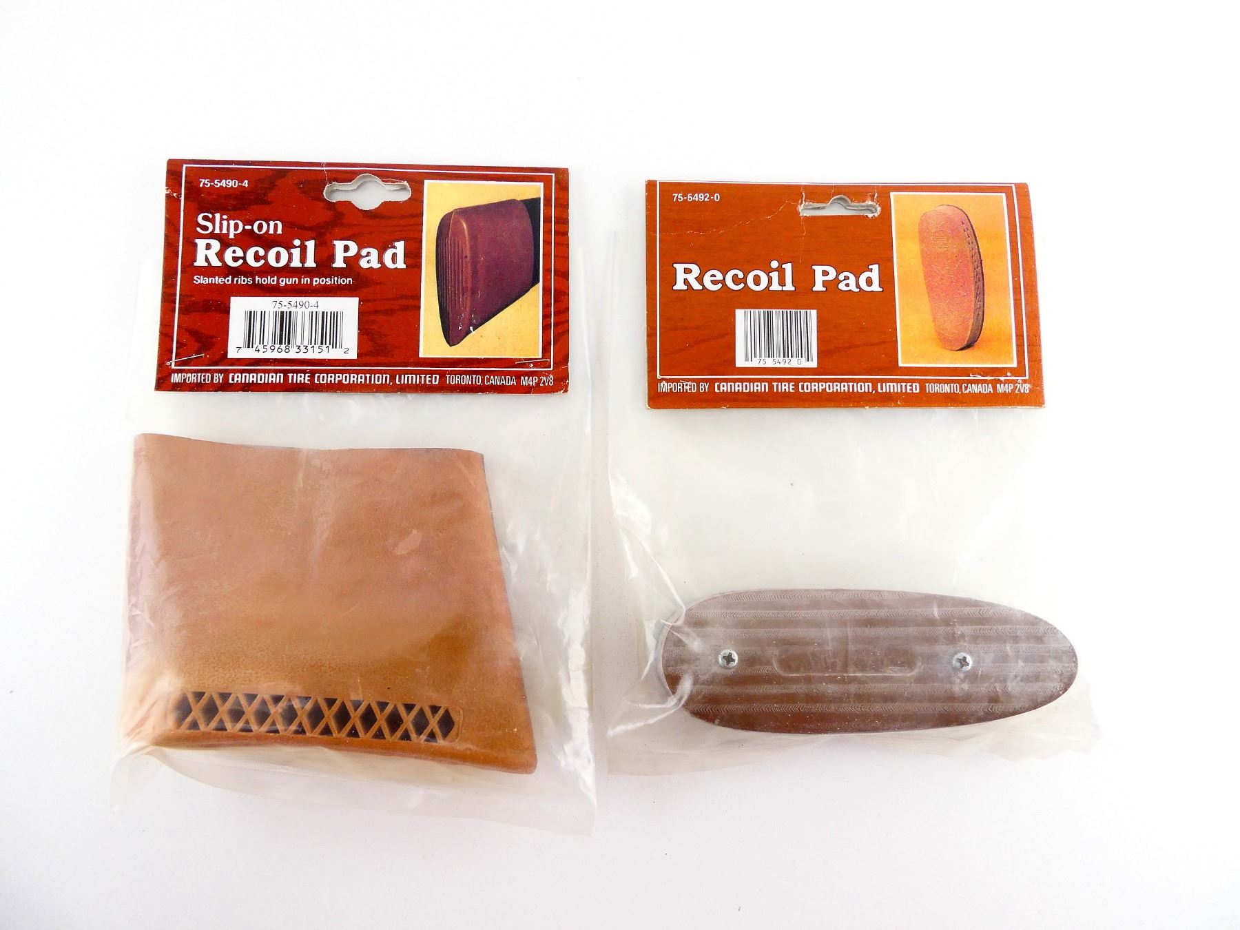 LOT INCLUDES; (1) SLIP-ON RECOIL PAD, BROWN LEATHER, PART #: 75-5490-4, APPEARS NEW OLD STOCK IN ORIGINAL PACKAGING & (1) RECOIL PAD, BROWN LEATHER, PART #: 75-5492-0, APPEARS NEW OLD STOCK IN ORIGINAL PACKAGING. MAY REQUIRE FITTING. SEE PHOTOS.