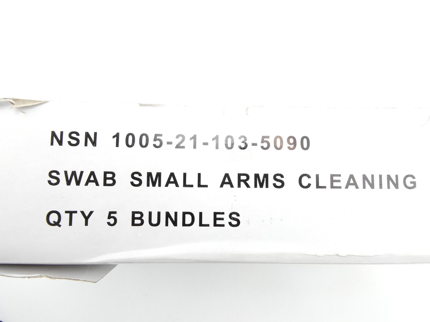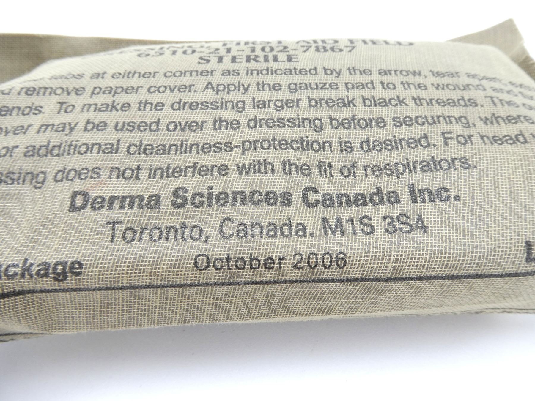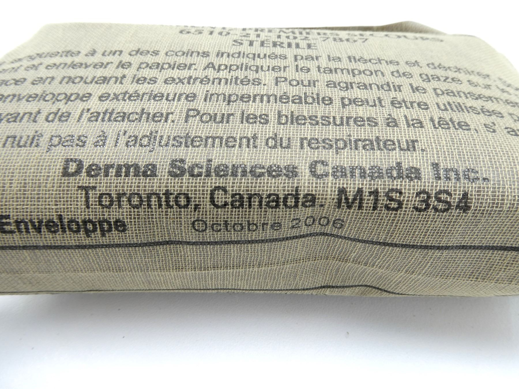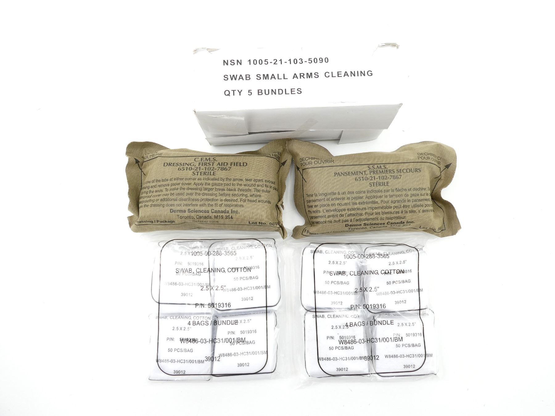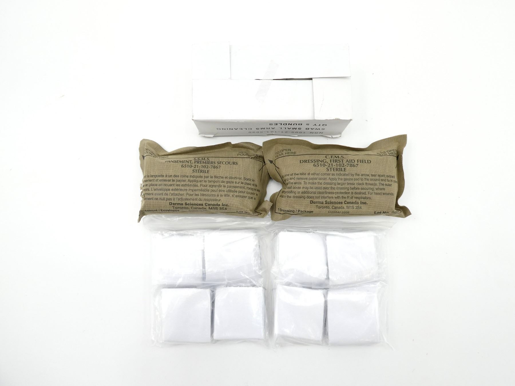 LOT INCLUDES; APPROX. (400) U.S. MILITARY COTTON CLEANING SWABS, PACKAGING MARKED: "1005-00-288-3565, SWAB, CLEANING, COTTON, 2.5" X 2.5", P/N: 5019316, 4 BAGS / BUNDLE" ETC., "50 PCS/BAG", APPEARS NEW OLD STOCK, (1) CANADIAN MILITARY CLEANING SWABS, BOX OF 5 BUNDLES, BOX MARKED: "NSN 1005-21-103-5090, SWAB SMALL ARMS CLEANING, QTY 5 BUNDLES", APPEARS NEW OLD STOCK & (2) CANADIAN MILITARY FIRST AID FIELD DRESSINGS, MARKED: "C.F.M.S., DRESSING, FIRST AID FIELD, 6510-21-102-7867, STERILE, OCTOBER 2006", NEW OLD STOCK. SEE PHOTOS.