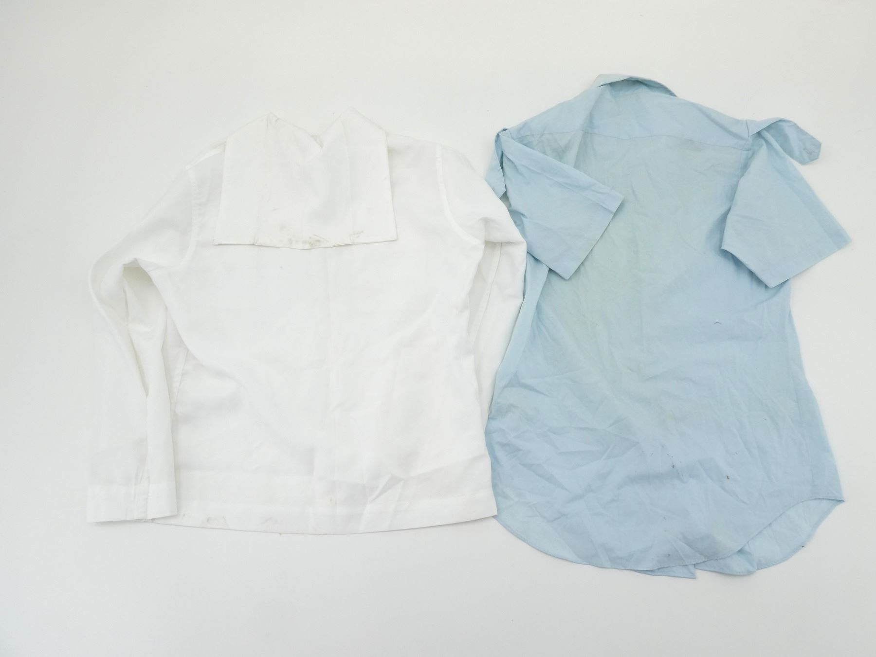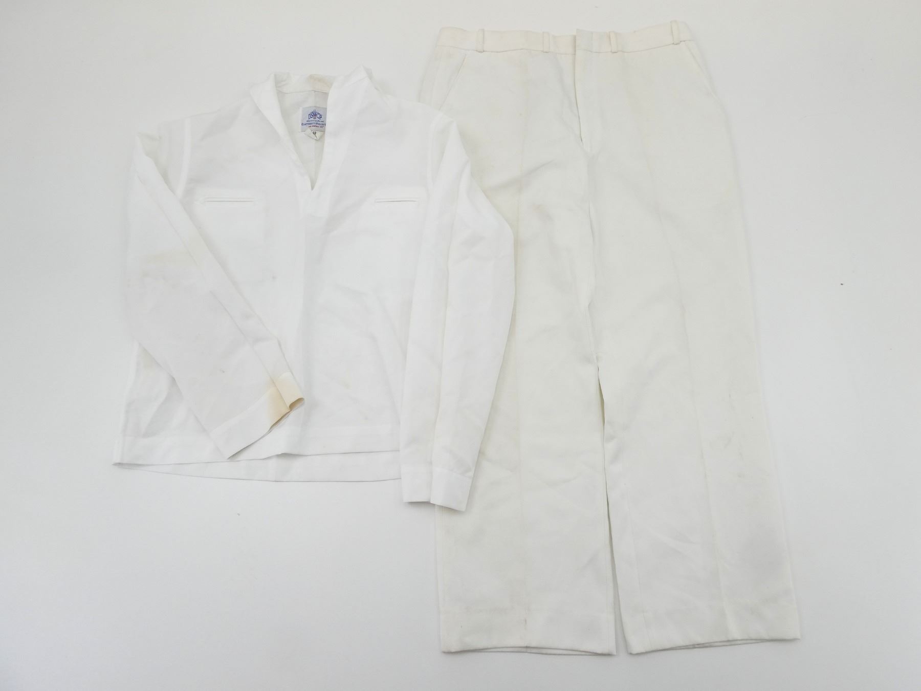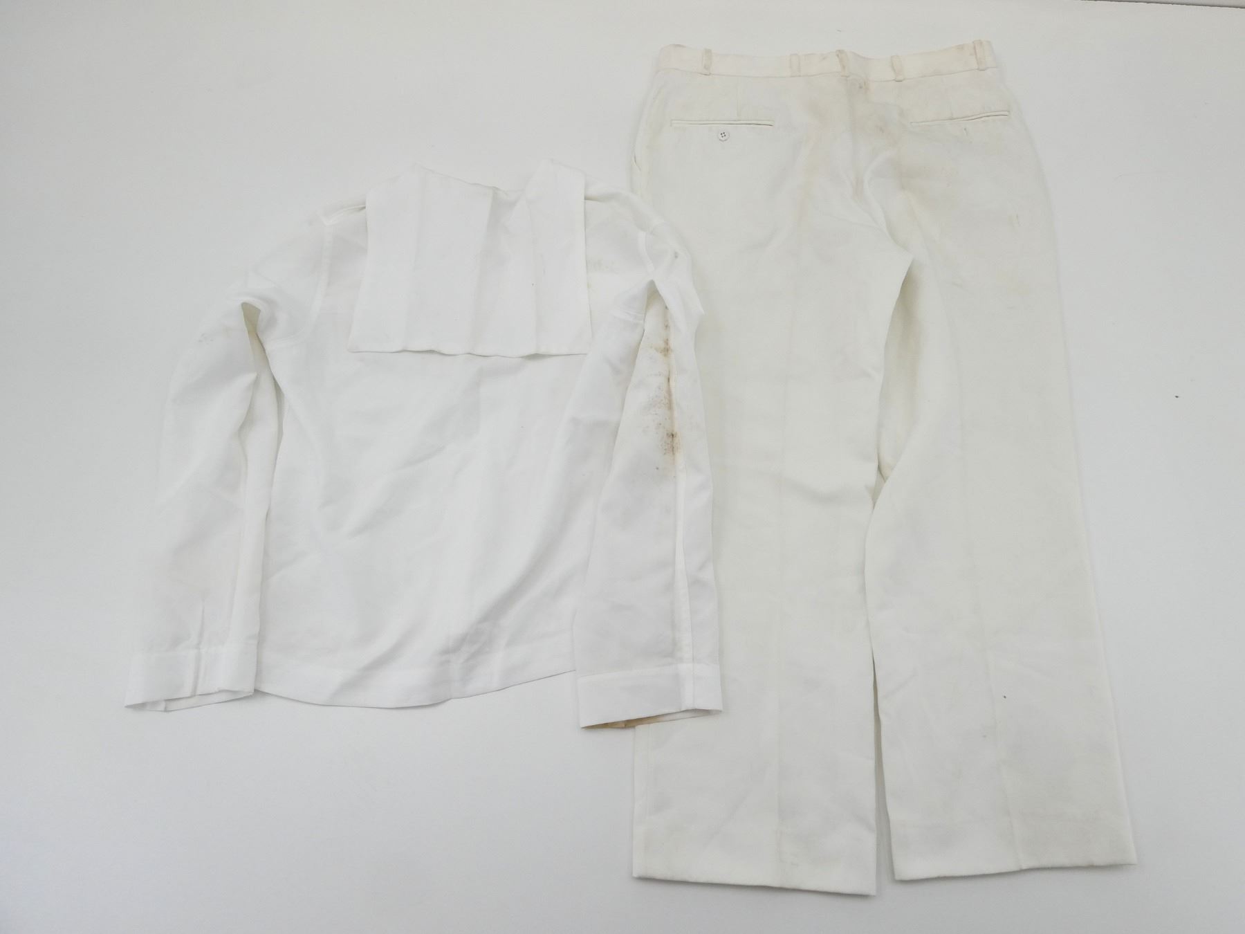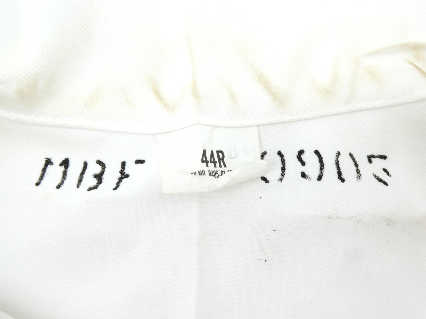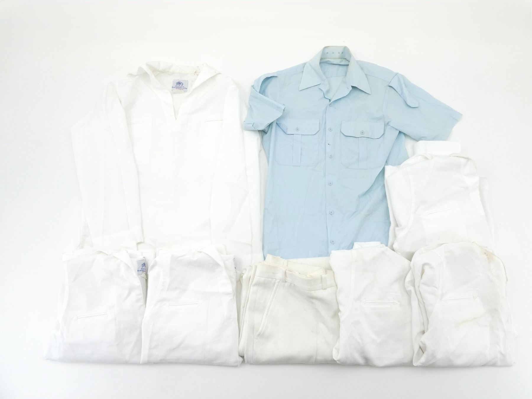 LOT INCLUDES; (1) CANADIAN MILITARY WHITE PANTS, SIZE 7338 LARGE-TALL, ZIPPERED-FLY (WORKS), VARIOUS LABELS / MARKINGS, SHOWS WEAR, (6) U.S. NAVAL WHITE JUMPERS, SIZES 44R & 44L (ONLY ONE), VARIOUS LABELS / MARKINGS, SHOWS WEAR / STAINING & (1) UNKNOWN MILITARY LIGHT BLUE SHORT-SLEEVED SHIRT, MARKED: "15, SS, 12 87", BUTTON FRONT, SHOWS WEAR, SHOULDER WIDTH APPROX. 16". SEE PHOTOS.