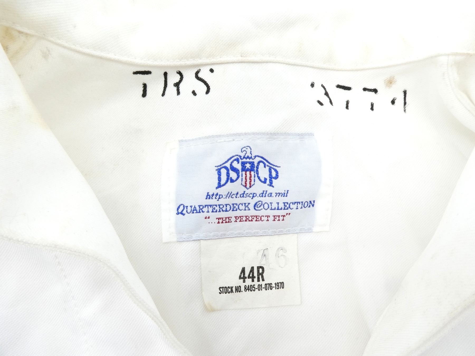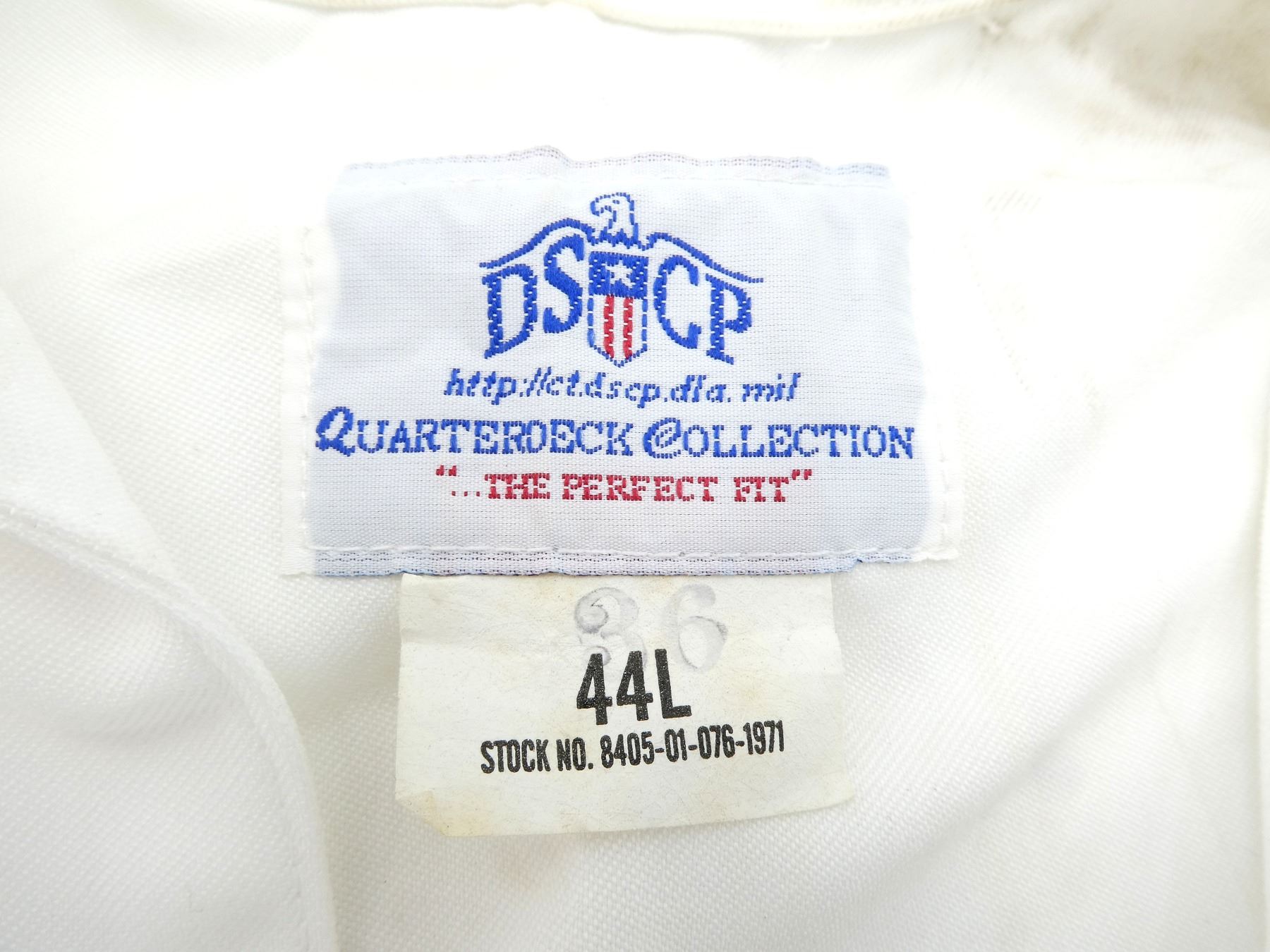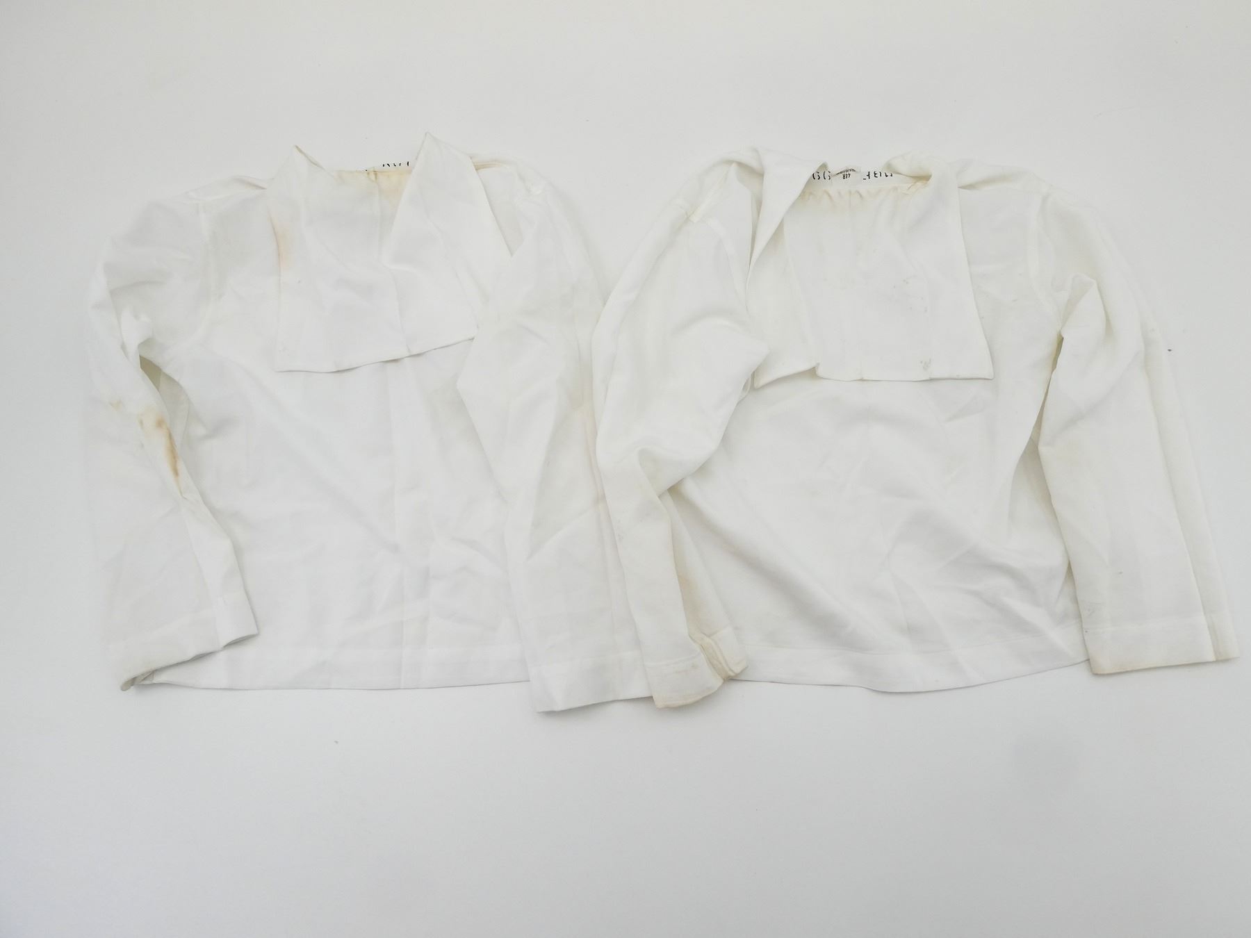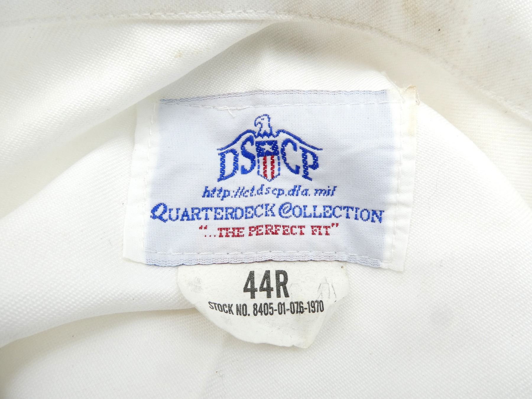 LOT INCLUDES; (1) CANADIAN MILITARY WHITE PANTS, SIZE 7338 LARGE-TALL, ZIPPERED-FLY (WORKS), VARIOUS LABELS / MARKINGS, SHOWS WEAR, (6) U.S. NAVAL WHITE JUMPERS, SIZES 44R & 44L (ONLY ONE), VARIOUS LABELS / MARKINGS, SHOWS WEAR / STAINING & (1) UNKNOWN MILITARY LIGHT BLUE SHORT-SLEEVED SHIRT, MARKED: "15, SS, 12 87", BUTTON FRONT, SHOWS WEAR, SHOULDER WIDTH APPROX. 16". SEE PHOTOS.