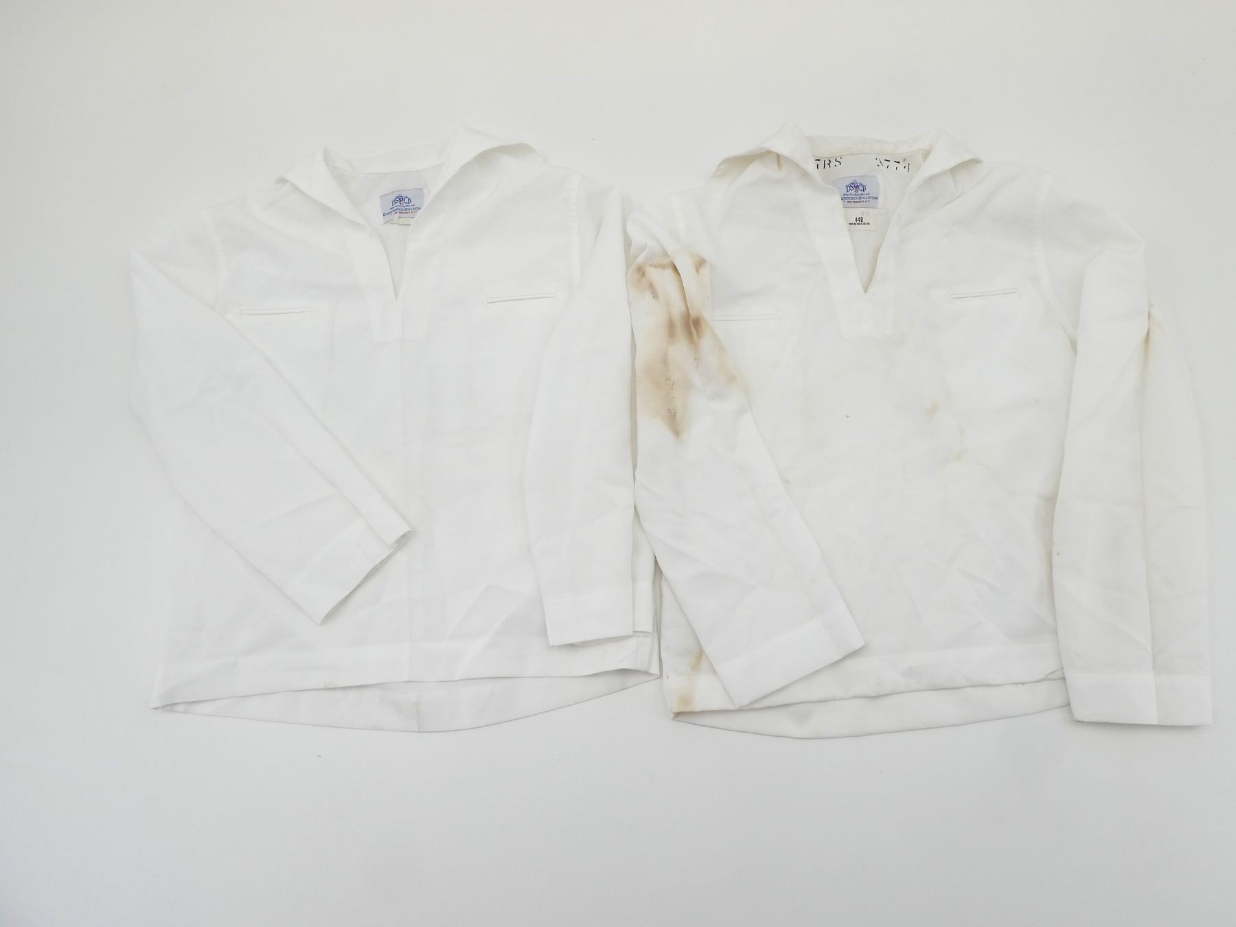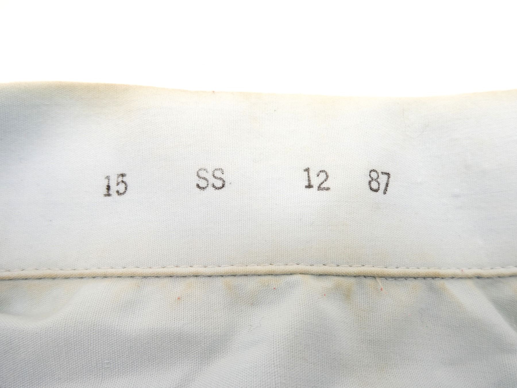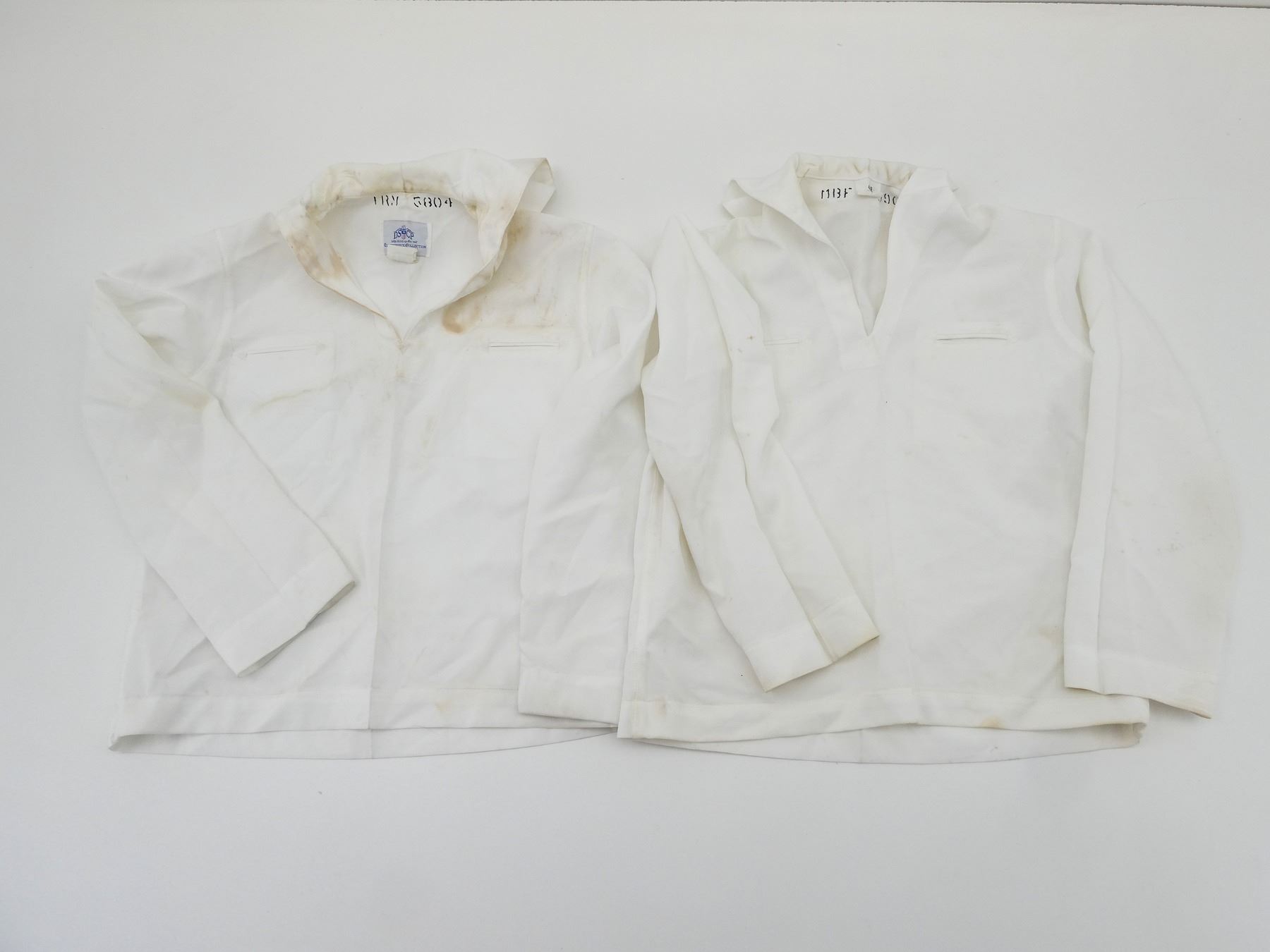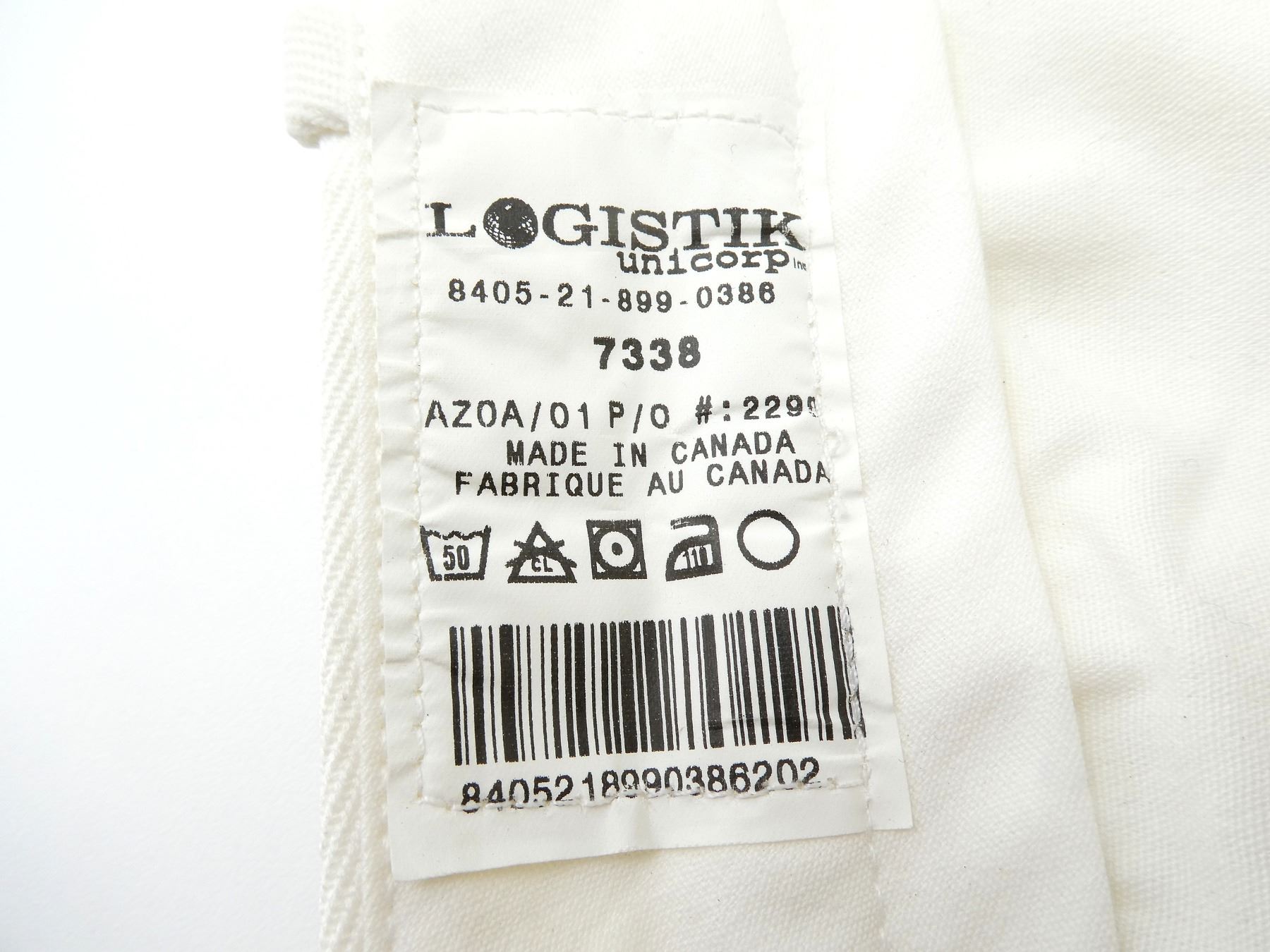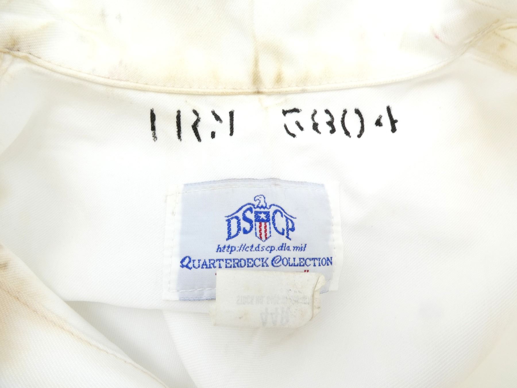 LOT INCLUDES; (1) CANADIAN MILITARY WHITE PANTS, SIZE 7338 LARGE-TALL, ZIPPERED-FLY (WORKS), VARIOUS LABELS / MARKINGS, SHOWS WEAR, (6) U.S. NAVAL WHITE JUMPERS, SIZES 44R & 44L (ONLY ONE), VARIOUS LABELS / MARKINGS, SHOWS WEAR / STAINING & (1) UNKNOWN MILITARY LIGHT BLUE SHORT-SLEEVED SHIRT, MARKED: "15, SS, 12 87", BUTTON FRONT, SHOWS WEAR, SHOULDER WIDTH APPROX. 16". SEE PHOTOS.