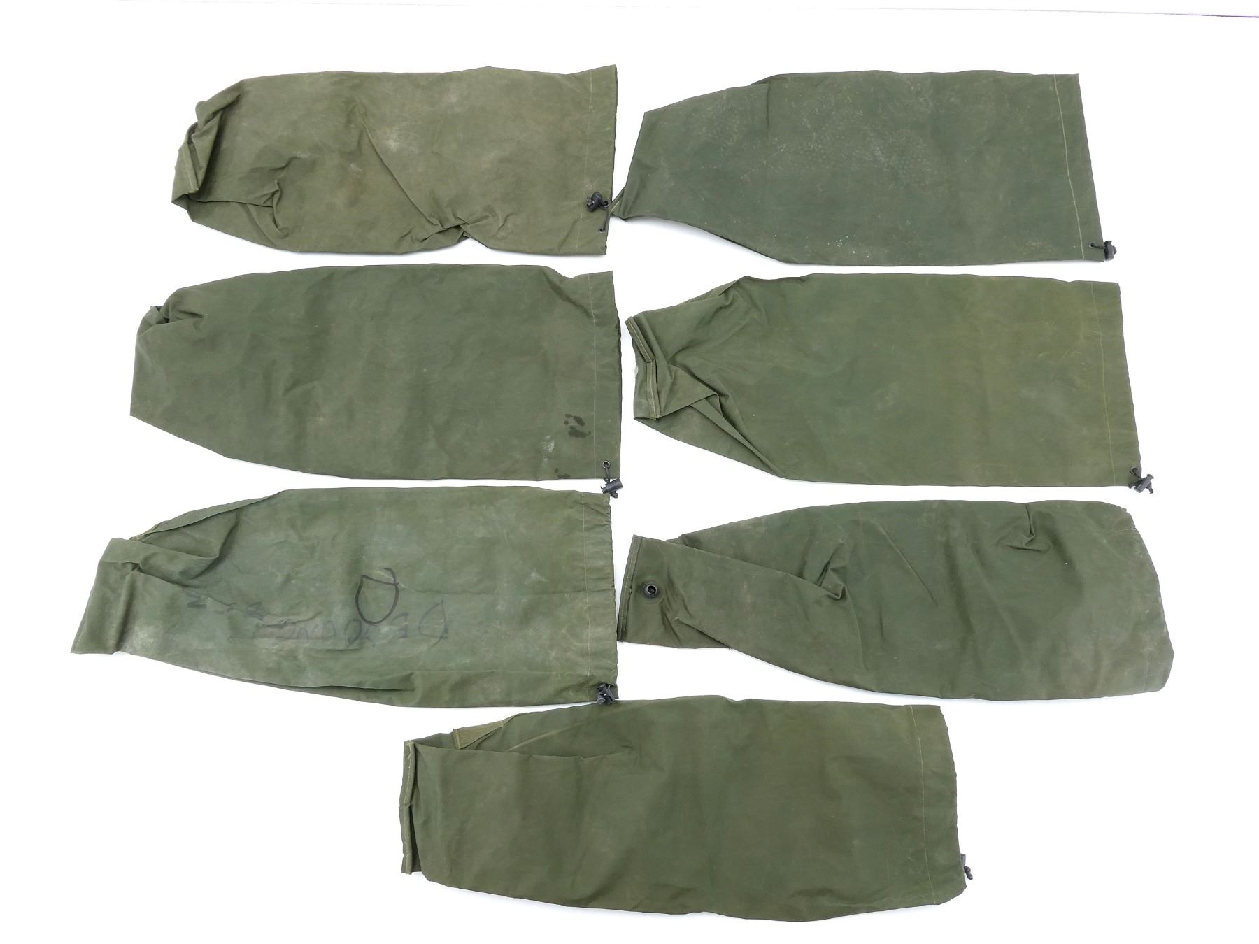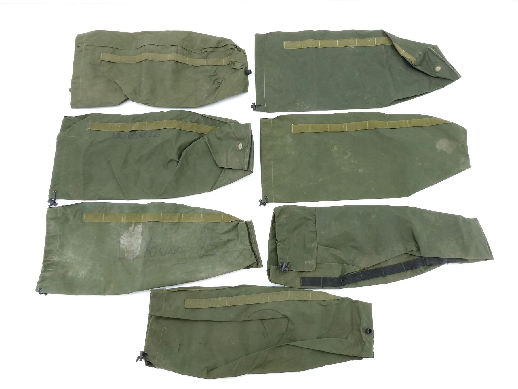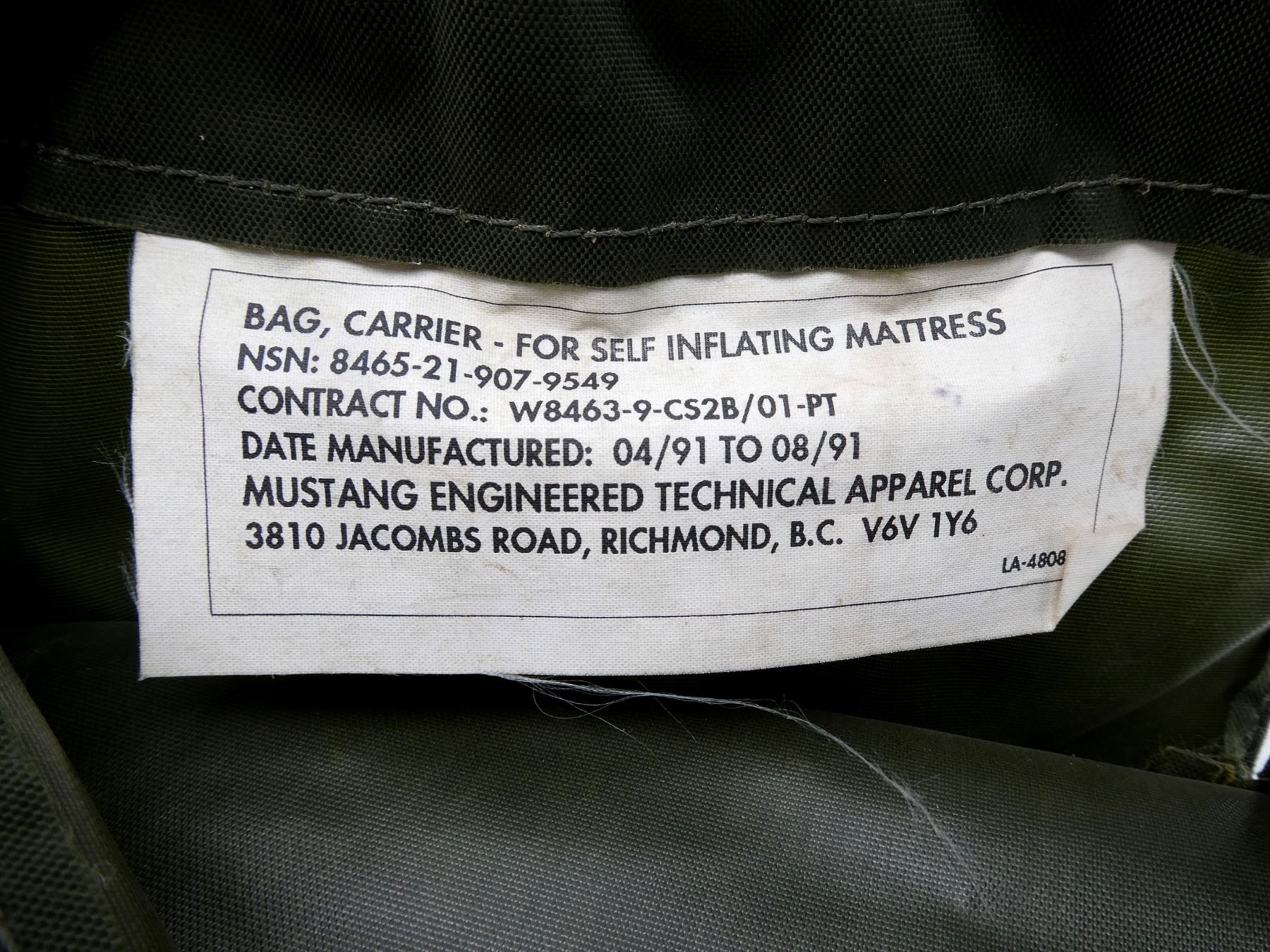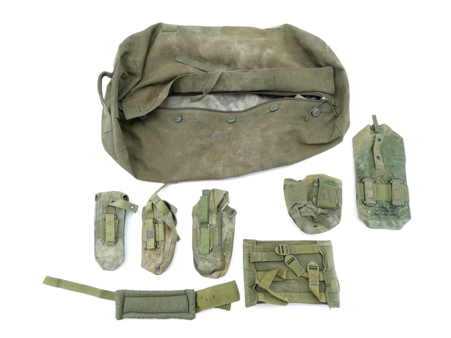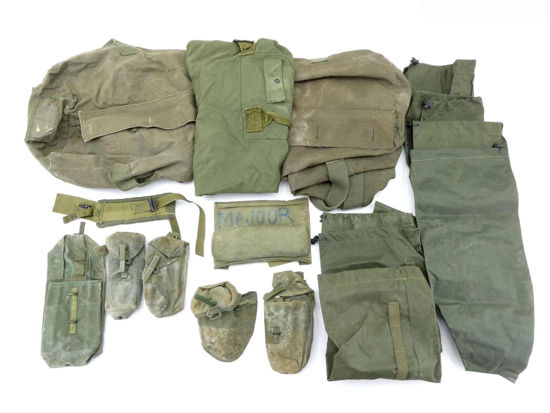 LOT INCLUDES; (1) U.S. MILITARY GREEN NYLON DUFFLE BAG, MARKED: "US" & VARIOUS OTHER MARKINGS, SHOULDER STRAPS / CARRY HANDLE, SHOWS AGE / WEAR, OVERALL LENGTH APPROX. 36", (2) CANADIAN / U.S. MILITARY STYLE GREEN CANVAS DUFFLE BAG, BUTTON / ZIPPERED CLOSURES, ONE HAS BROKEN ZIPPER, OTHER WORKS, CANVAS CARRY HANDLES, NO VISIBLE MARKINGS, SHOWS AGE / WEAR / TEAR, (7) CANADIAN MILITARY GREEN NYLON INFLATABLE MATTRESS CARRIER BAGS (NO MATTRESS), VARIOUS LABELS / MARKINGS, DRAWSTRING CLOSURE, SHOWS WEAR, (4) CANADIAN MILITARY GREEN NYLON MAG POUCHES, VARIOUS MARKINGS, VELCRO BELT LOOP / BELT HOOKS, SHOWS AGE / WEAR, (1) CANADIAN MILITARY GREEN NYLON CANTEEN POUCH, VARIOUS HAND-WRITTEN MARKINGS, VELCRO BELT LOOP / BELT HOOKS, SHOWS AGE / WEAR, ETC. SEE PHOTOS.