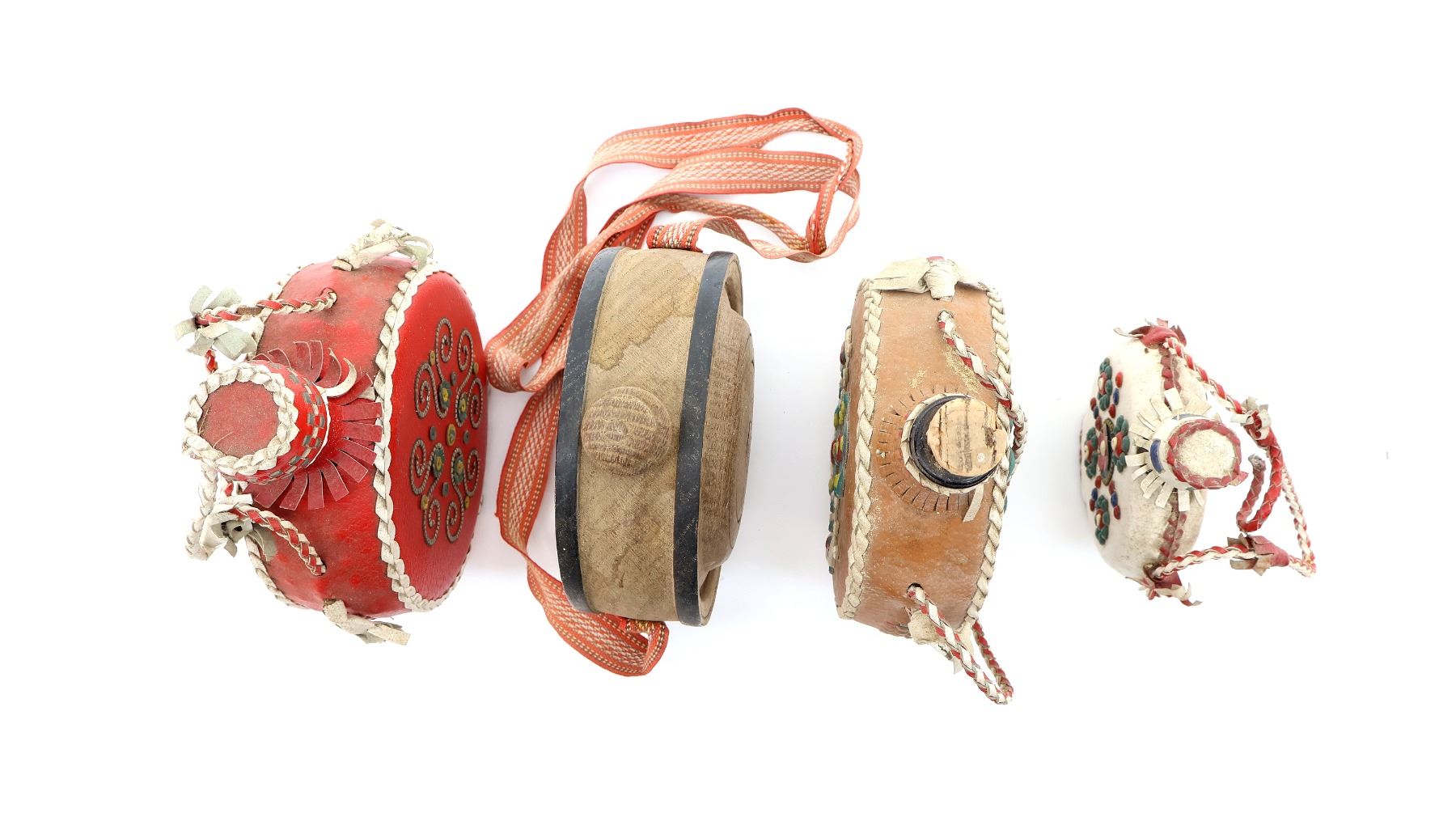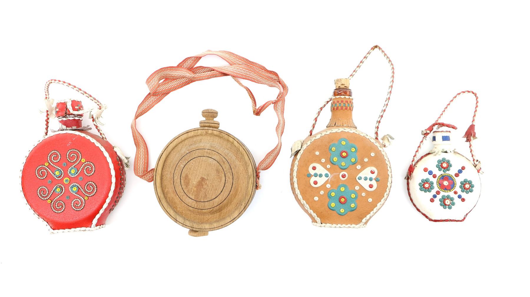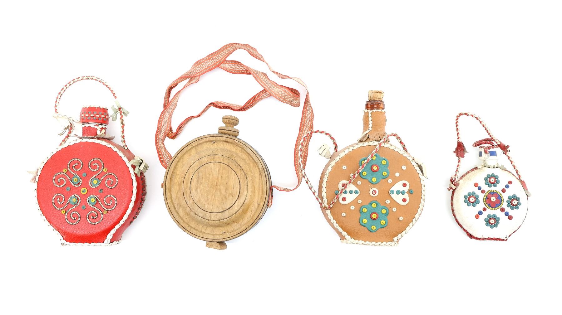 LOT INCLUDES; (1) BROWN CANTEEN, GLASS CONSTRUCTION WITH LEATHER ENCASING, CORK CLOSURE, BRAIDED CARRY HANDLE STRAP, (1) RED CANTEEN, GLASS CONSTRUCTION WITH LEATHER ENCASING, LEATHER CAP CLOSURE, BRAIDED CARRY HANDLE STRAP, (1) WHITE CANTEEN, GLASS CONSTRUCTION WITH LEATHER ENCASING, LEATHER CAP CLOSURE, BRAIDED CARRY HANDLE STRAP & (1) WOODEN CANTEEN, WOODEN CAP CLOSURE, SHOULDER CARRY STRAP. SEE PHOTOS.