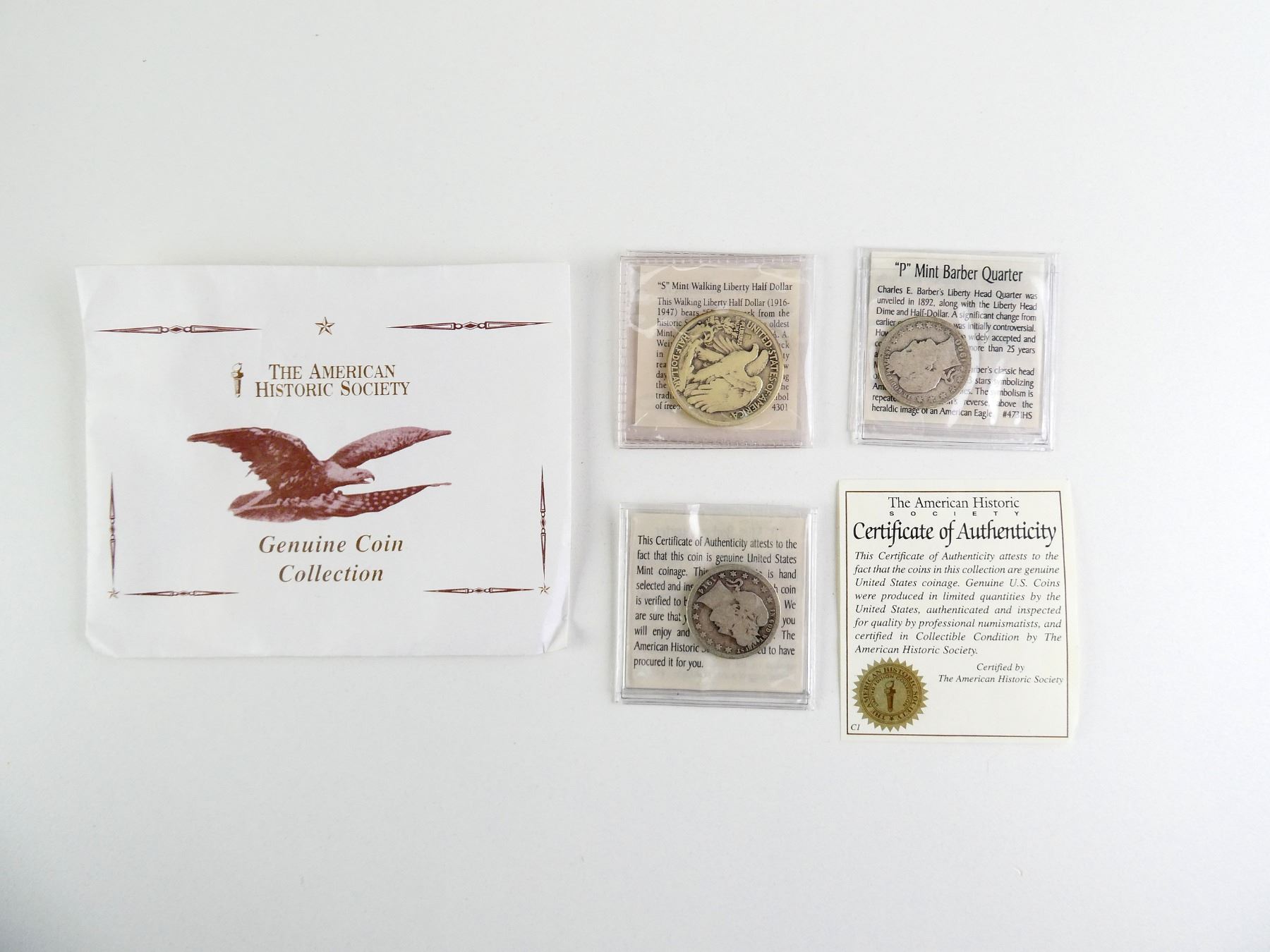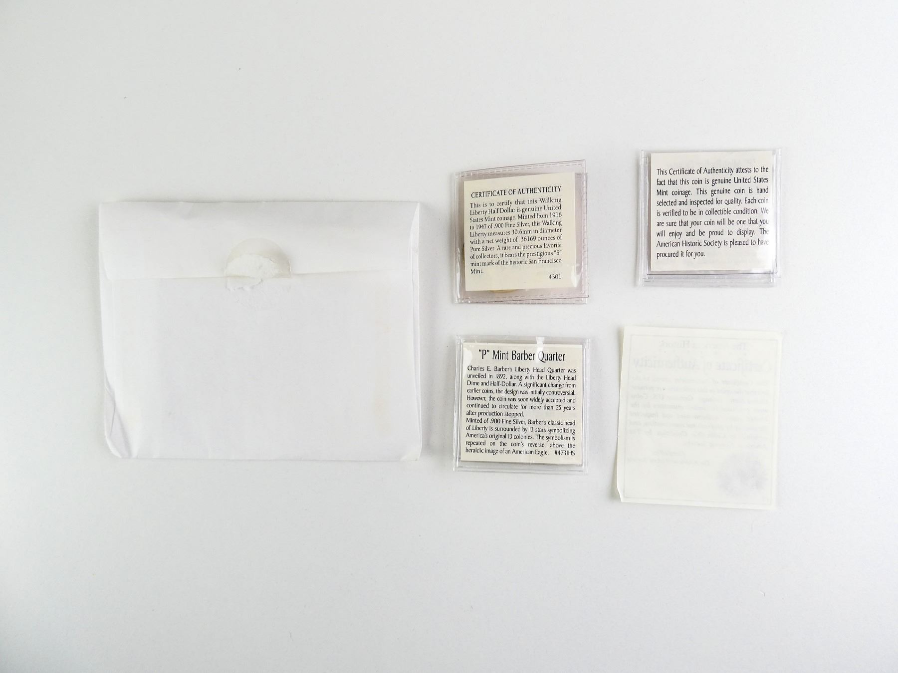 LOT INCLUDES; (1) "P" MINT BARBER QUARTER, DATED 1900, WITH INFORMATION SHEET, (1) "P" MINT BARBER QUARTER, DATED 1914, WITH INFORMATION SHEET, (1) "S" MINT WALKING LIBERTY HALF DOLLAR, DATED 1943, WITH INFORMATION SHEET & CERTIFICATE OF AUTHENTICITY. SEE PHOTOS.
