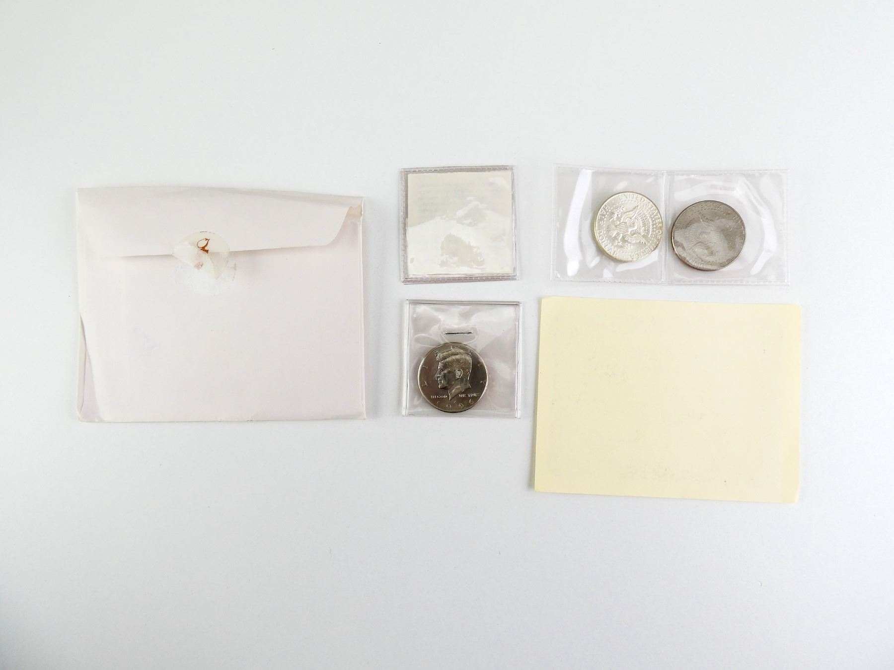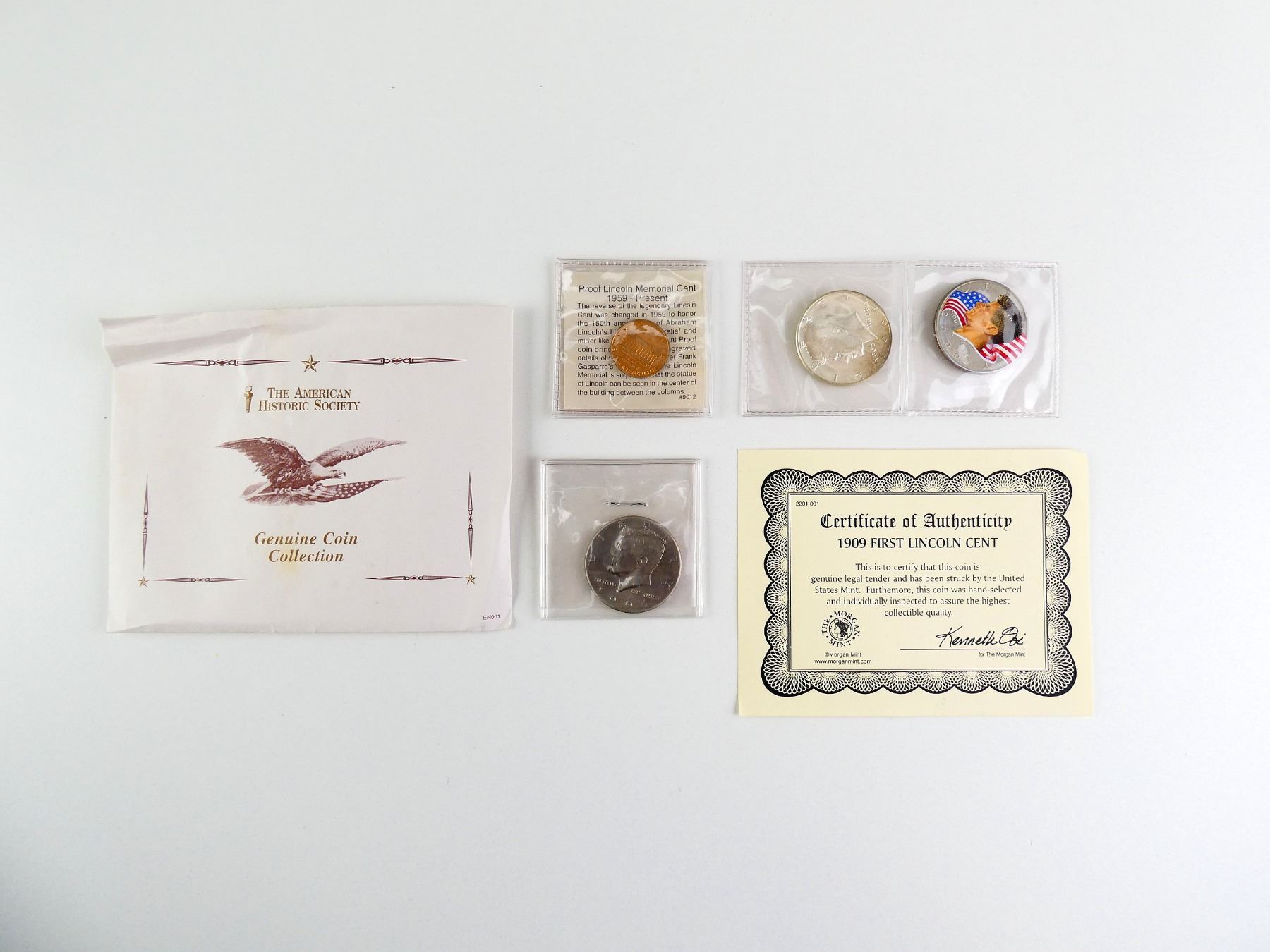LOT INCLUDES; (1) JOHN F. KENNEDY HALF DOLLAR WITH FAUX ERROR COIN HEADS ON BOTH SIDES, DATED 1996, DENVER MINTED ON ONE SIDE, PHILADELPHIA MINTED ON OTHER SIDE, (1) JOHN F. KENNEDY HALF DOLLAR, DATED 1964, (1) JOHN F. KENNEDY HALF DOLLAR, DATED 2000, IN COLOUR, (1) PROOF LINCOLN MEMORIAL PENNY, DATED 1978, WITH INFORMATION SHEET & (1) 1909 FIRST LINCOLN CENT CERTIFICATE OF AUTHENTICITY. SEE PHOTOS.