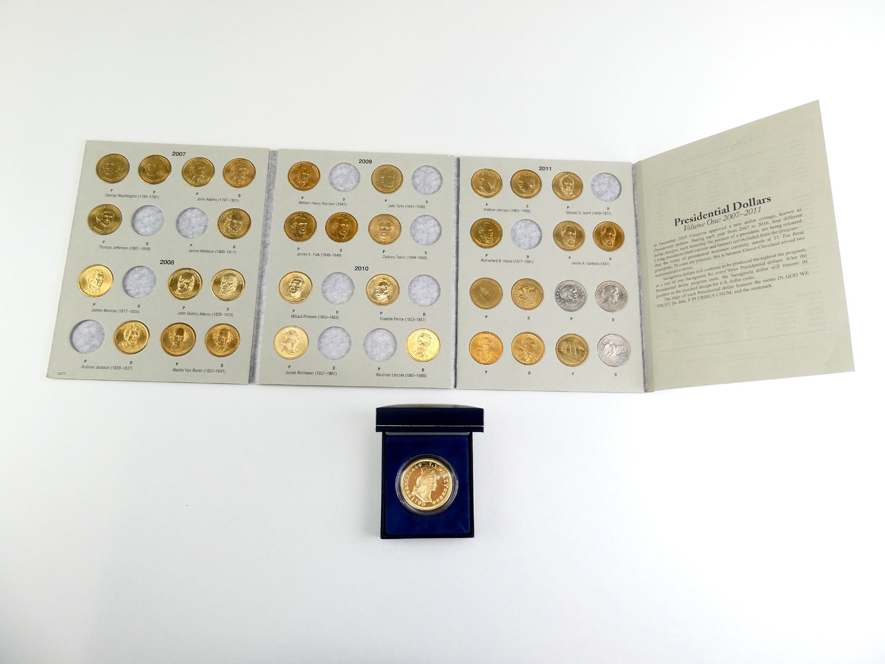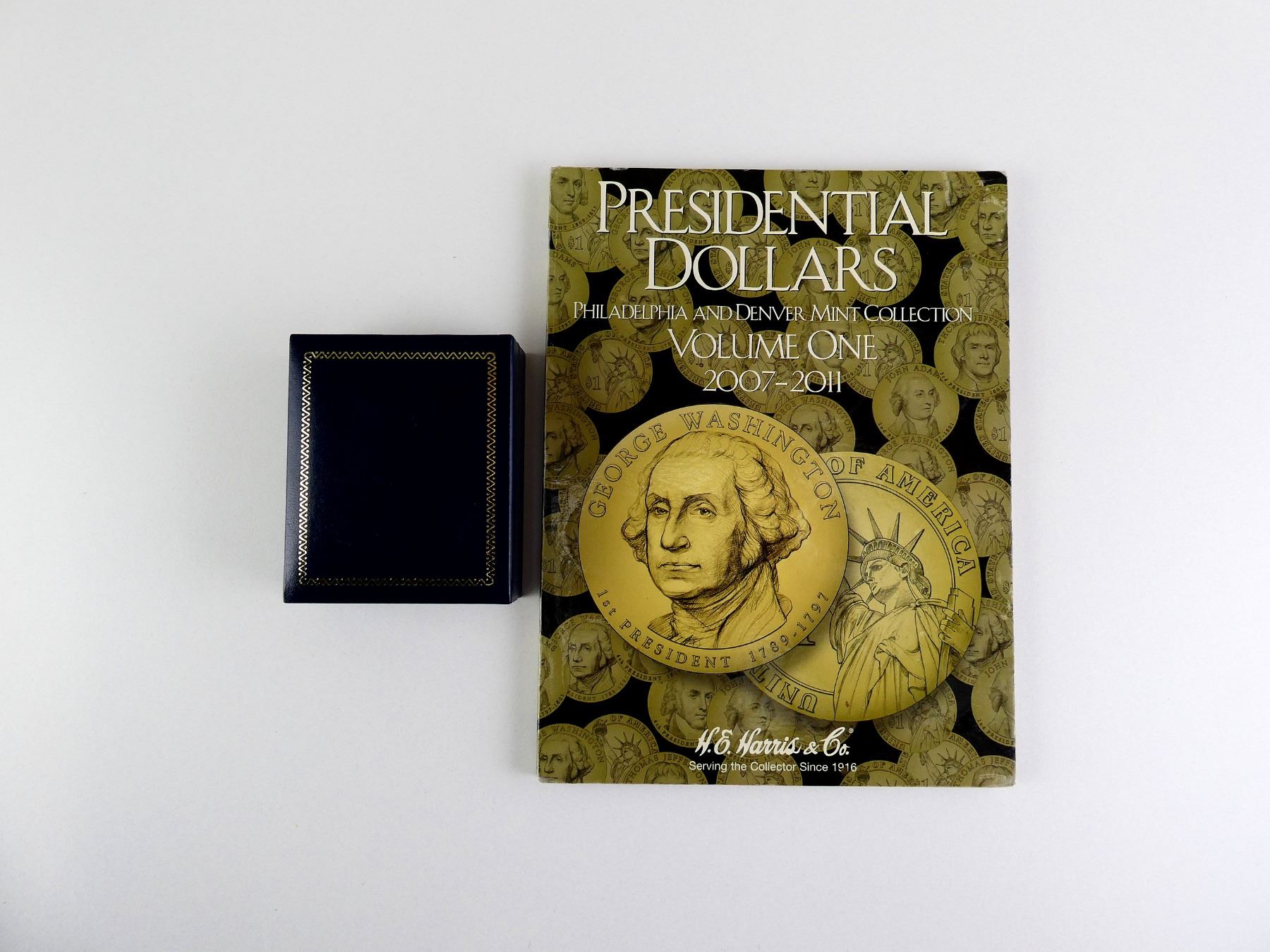 LOT INCLUDES; (1) 2007-2011 PRESIDENTIAL DOLLARS VOLUME ONE PARTIAL SET, APPROX. 35 DOLLAR COINS, PHILADELPHIA / DENVER MINT, INCOMPLETE SET, WITH SOME SACAGAWEA / SUSAN B. ANTHONY DOLLAR COINS, VARIOUS DATES & (1) COPY OF 1795 LIBERTY COIN WITH BLUE LEATHER BOX. SEE PHOTOS.