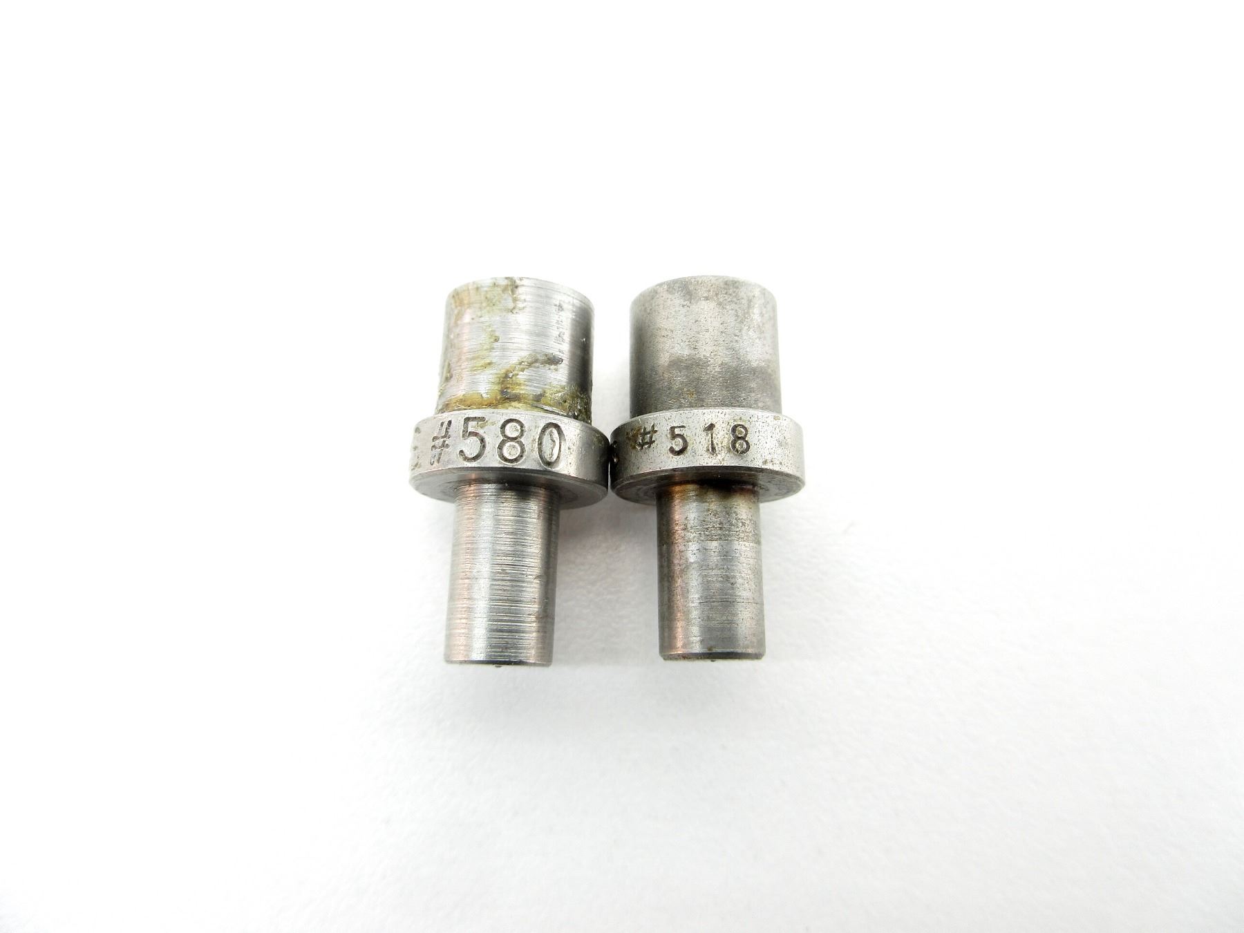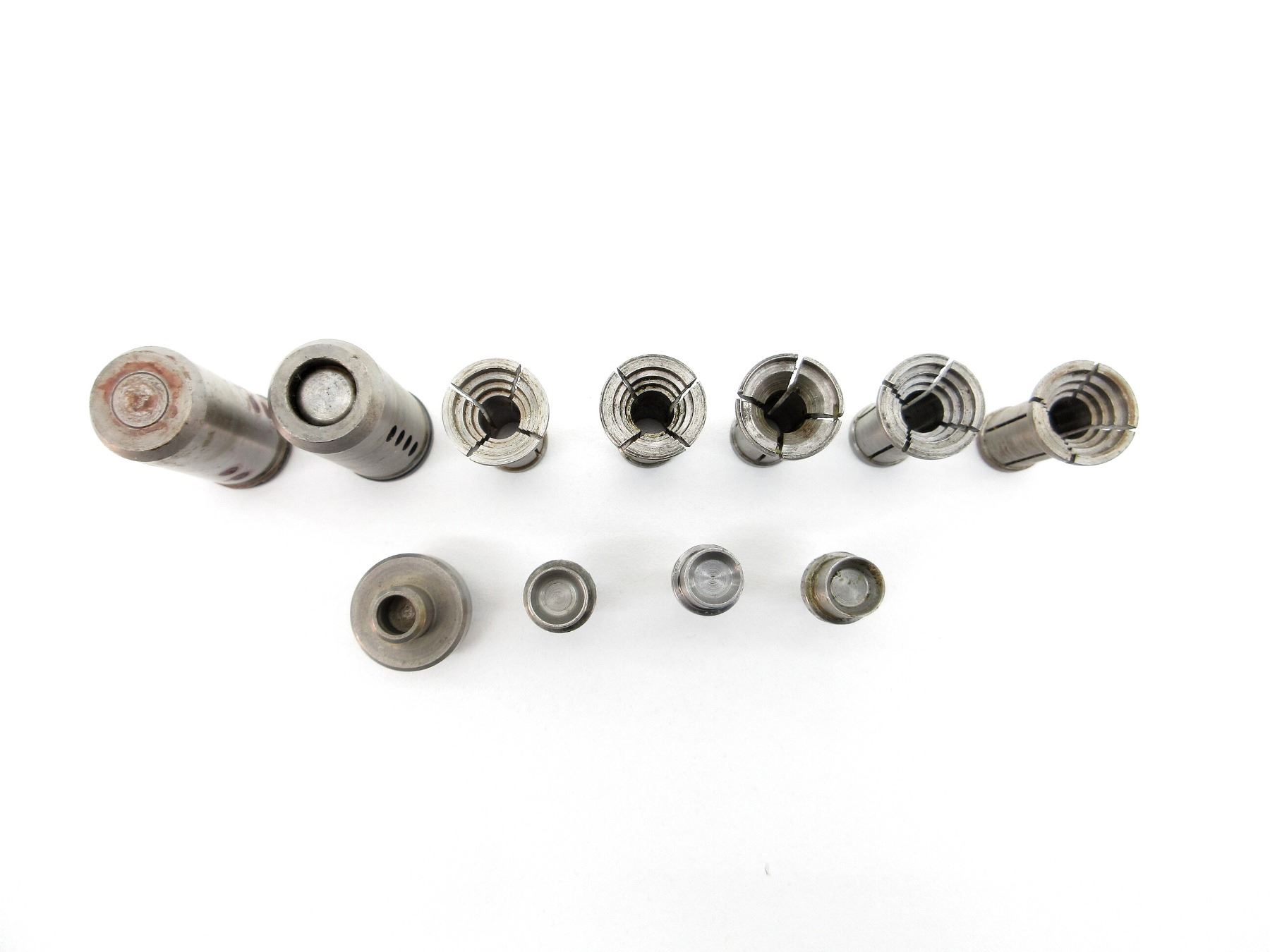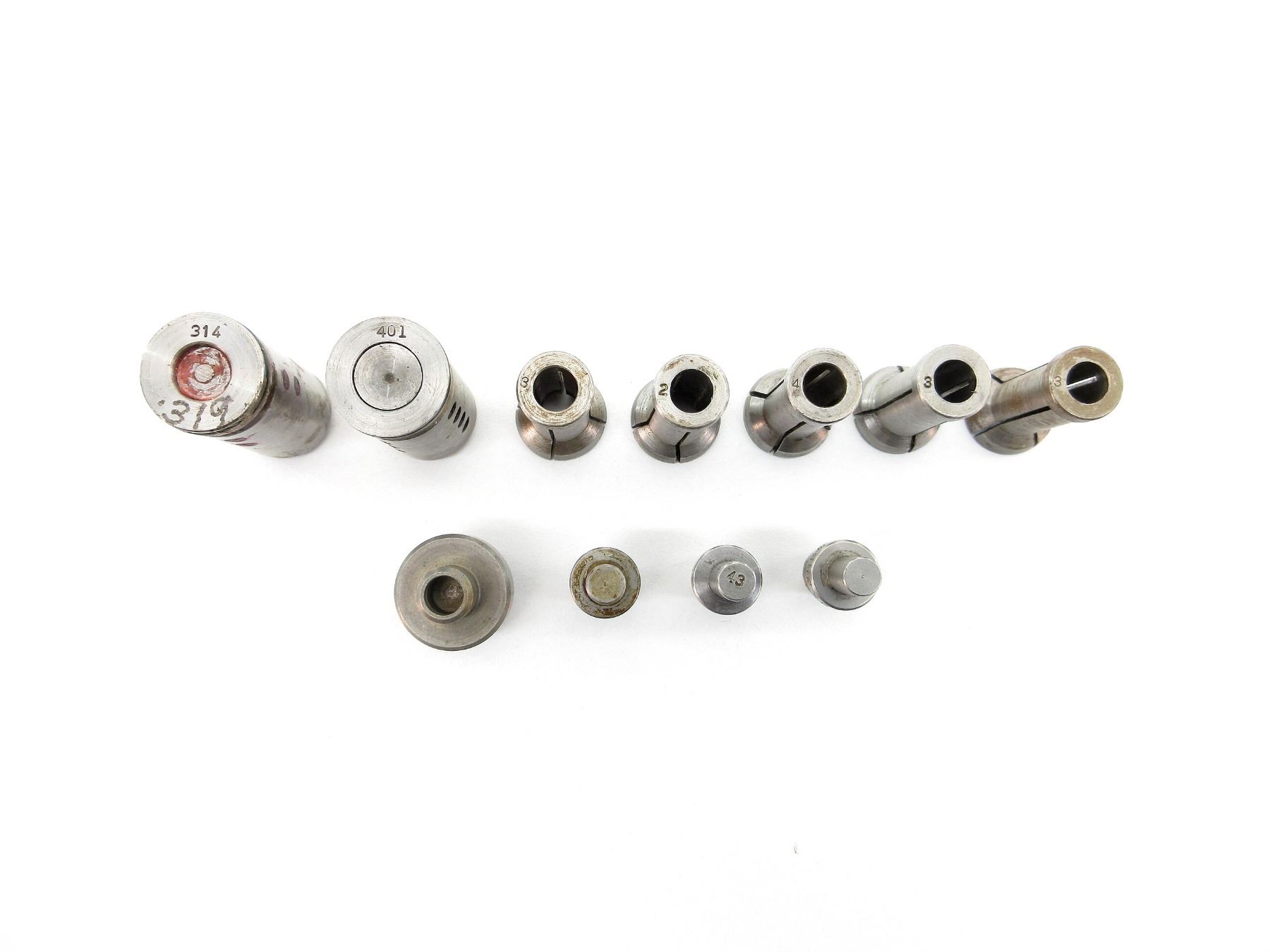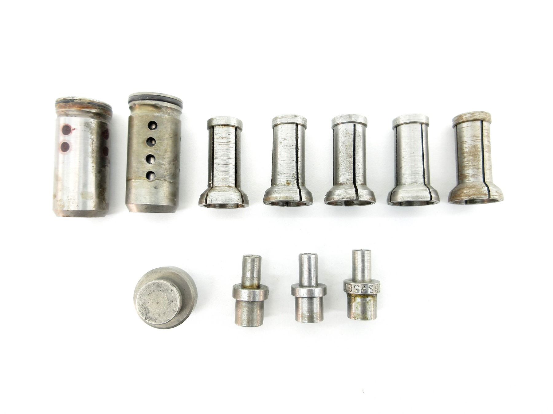 LOT INCLUDES; (2) LUBE SIZERS, ONE MARKED: "401", OTHER MARKED: "314, .319", (3) TOP PUNCHES, RCBS #518, RCBS #580, UNKNOWN #43, (5) COLLET SHELL HOLDERS, #2, THREE #3'S, #4, ETC. SEE PHOTOS.