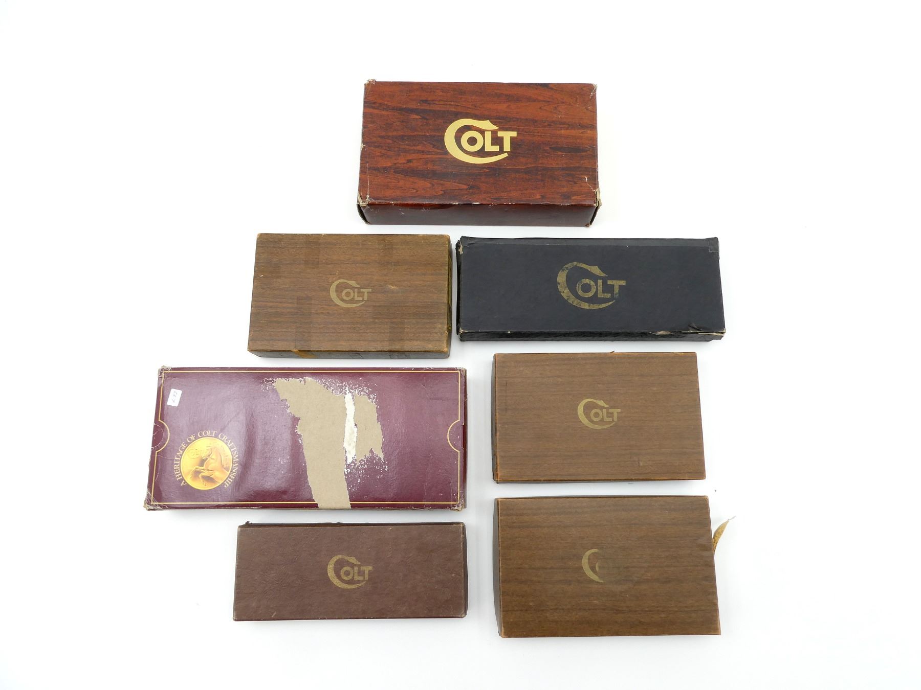 LOT INCLUDES; (7) ASSORTED COLT HAND GUN EMPTY BOXES, VARIOUS CALIBERS INCLUDING; .38 SPL 4" BARREL, .38 SPL 2" BARREL, .32 POLICE POSITIVE SPECIAL REVOLVER 4", SINGLE ACTION ARMY REVOLVER 5 1/2" BARREL, GOVERNMENT MODEL MARK IV / SERIES '70 5" BARREL, .45 LC SINGEL ACTION ARMY 7 1/2" BARREL, ETC., APPROX OAL9 1/2"-14", SHOWS WEAR AND TEAR FROM USAGE, SEE PHOTOS