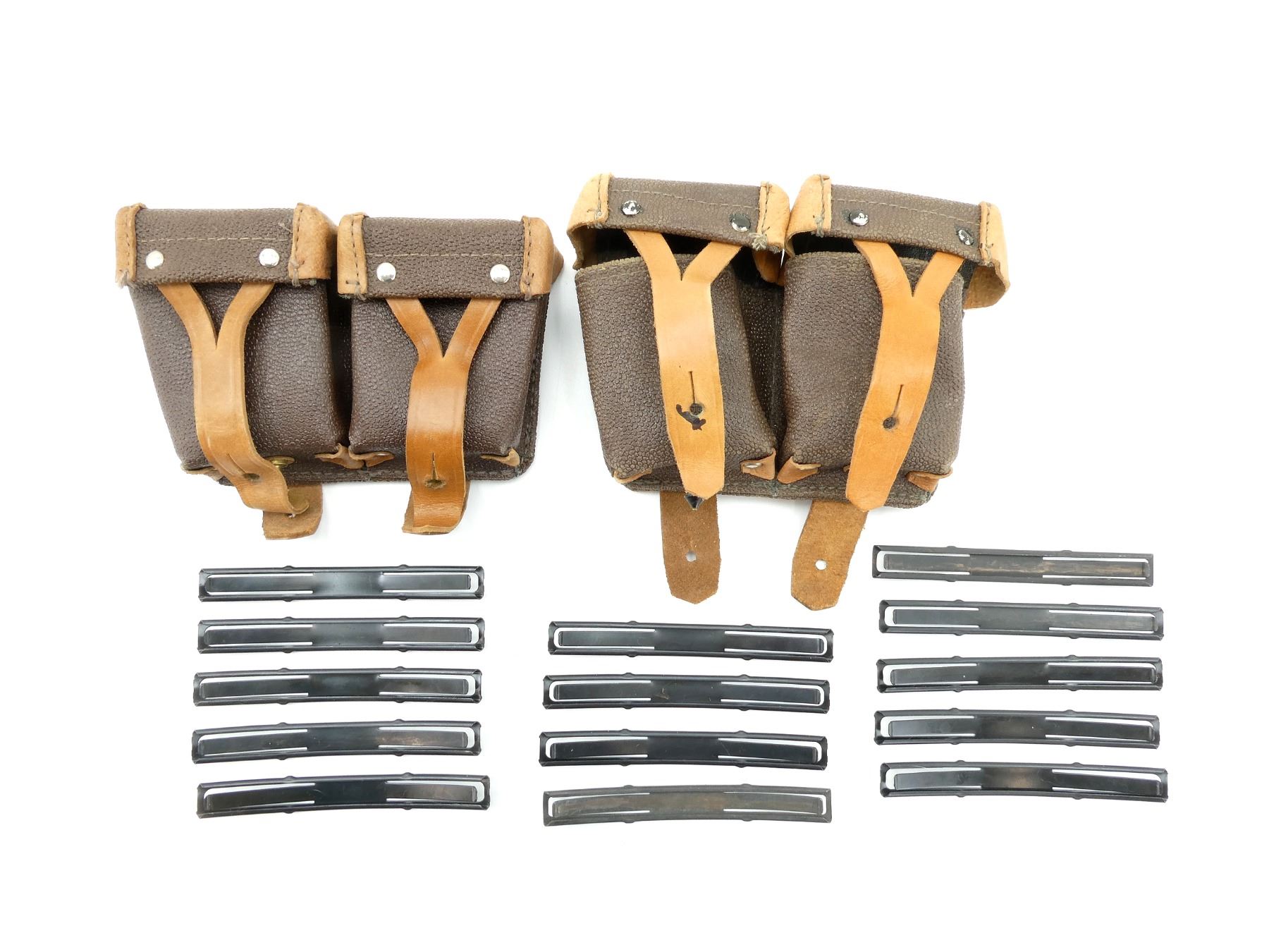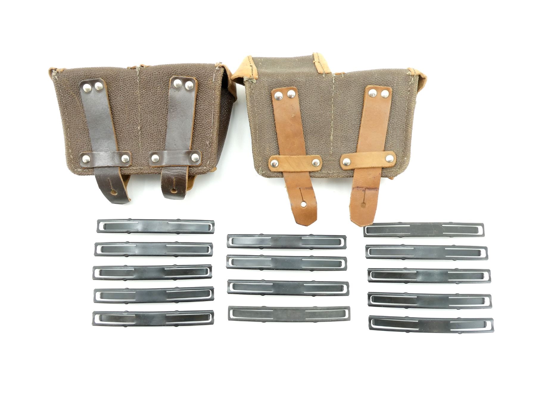 LOT INCLUDES; (2) MOSIN NAGANT BROWN LEATHER AMMO POUCHES, 2-POCKET, METAL / BRASS FITTINGS, VARIOUS INK STAMP MARKINGS, TWO LEATHER BELT LOOPS & APPROX. (14) SKS 7.62X39MM, 10-RND STRIPPER CLIPS, BLUED / BLACK PAINTED STEEL, TWO MARKED: "31" IN A CIRCLE PROOF MARK, OTHERS HAVE NO VISIBLE MARKINGS. SEE PHOTOS.