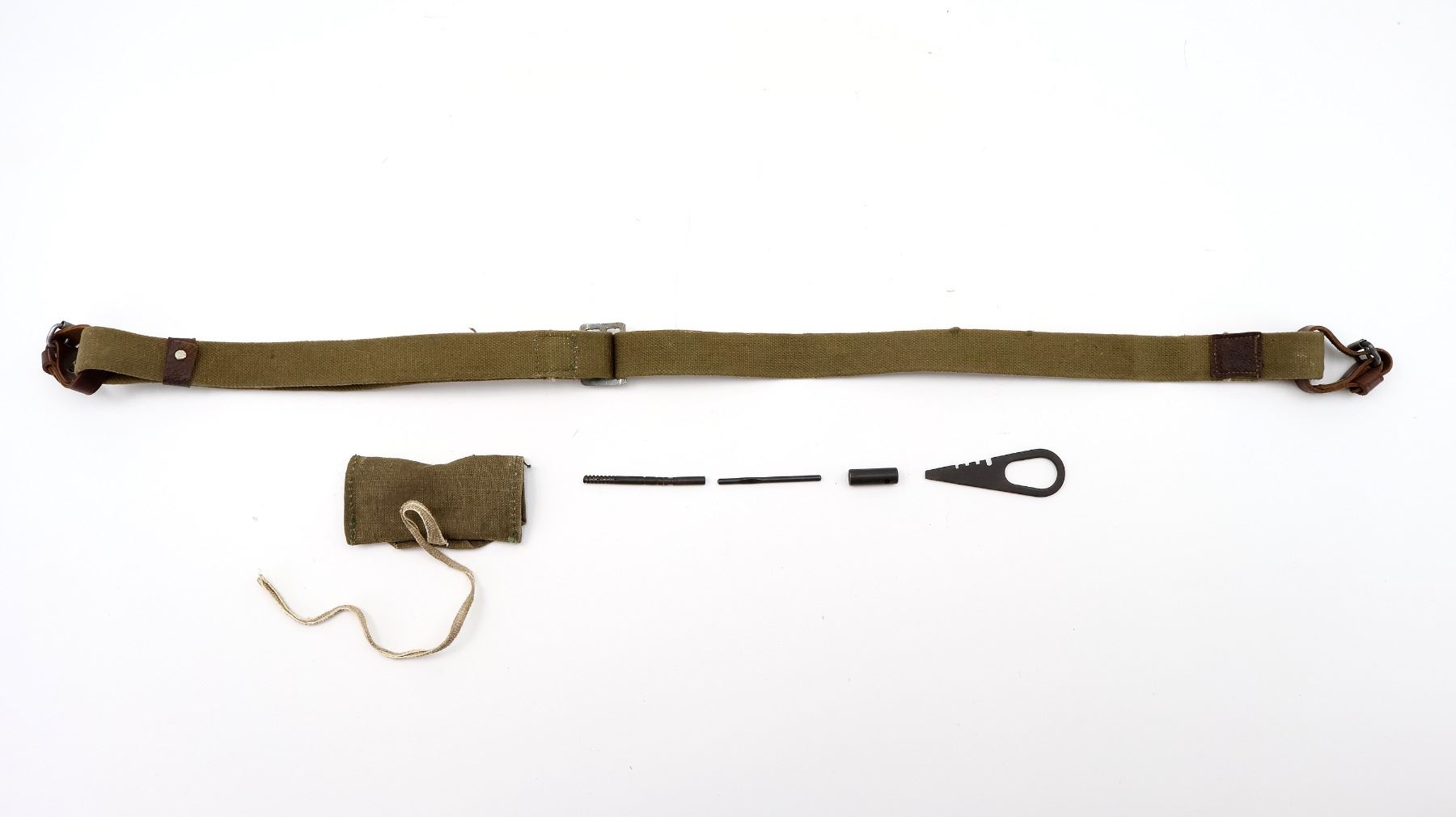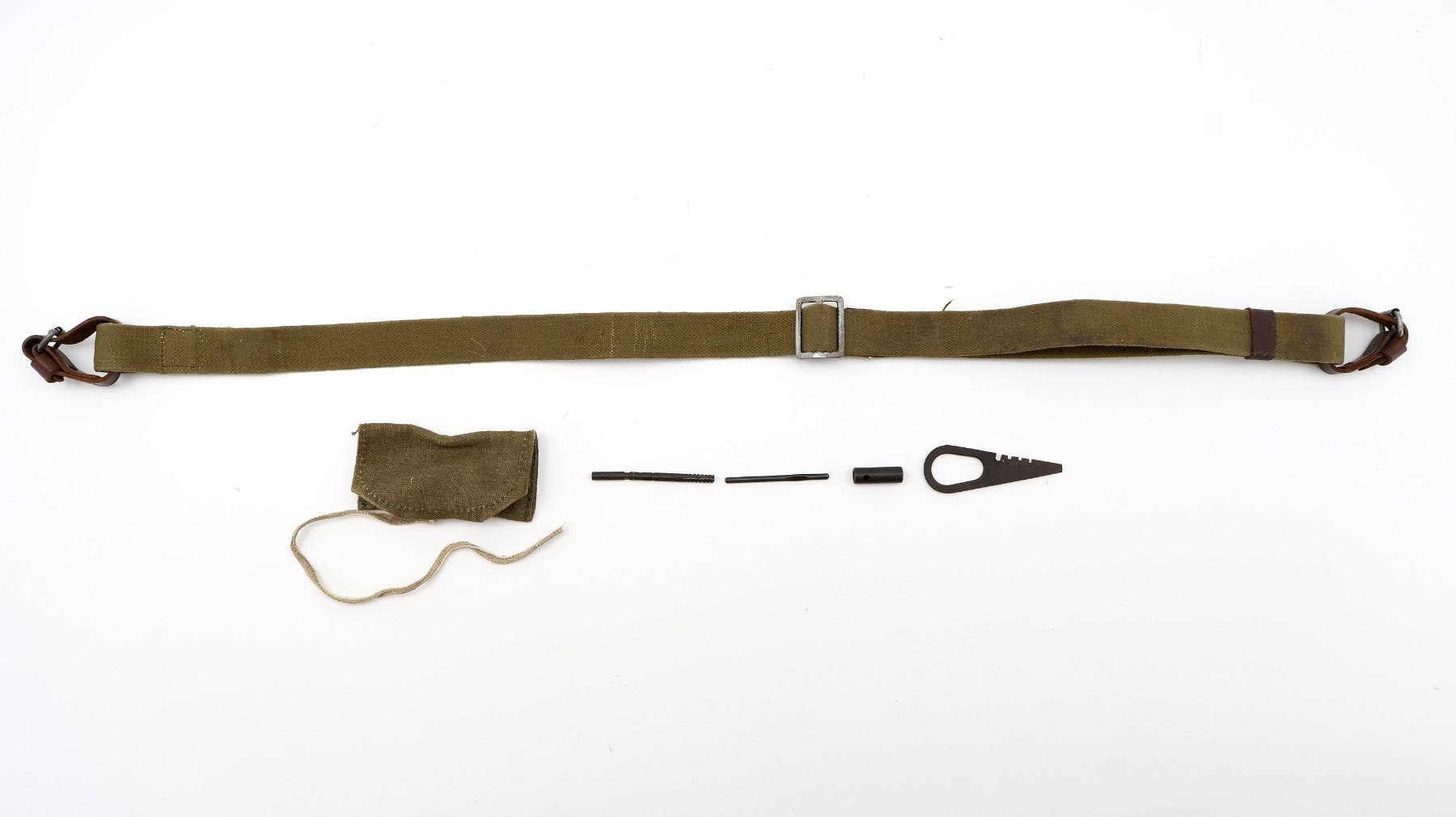 LOT INCLUDES; (1) MOSIN NAGANT CLEANING KIT WITH CANVAS POUCH, JAG, COMBO TOOL, WRENCH & (1) MOSIN NAGANT TAN CANVAS SLING WITH LEATHER STRAPS, METAL BUCKLES / FITTINGS, OVERALL LENGTH APPROX. 35.5", ADJUSTABLE. SEE PHOTOS.