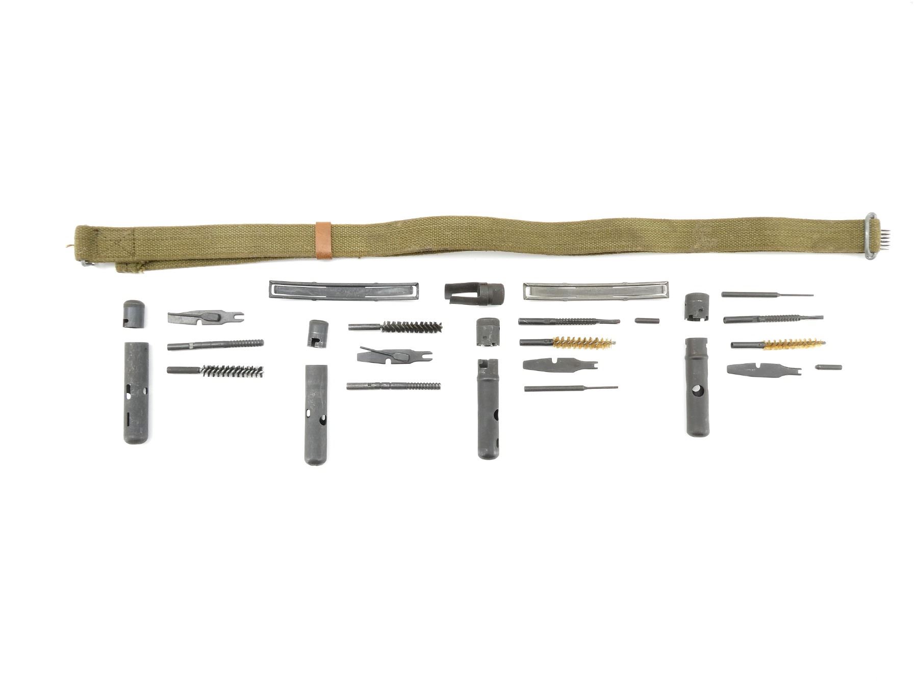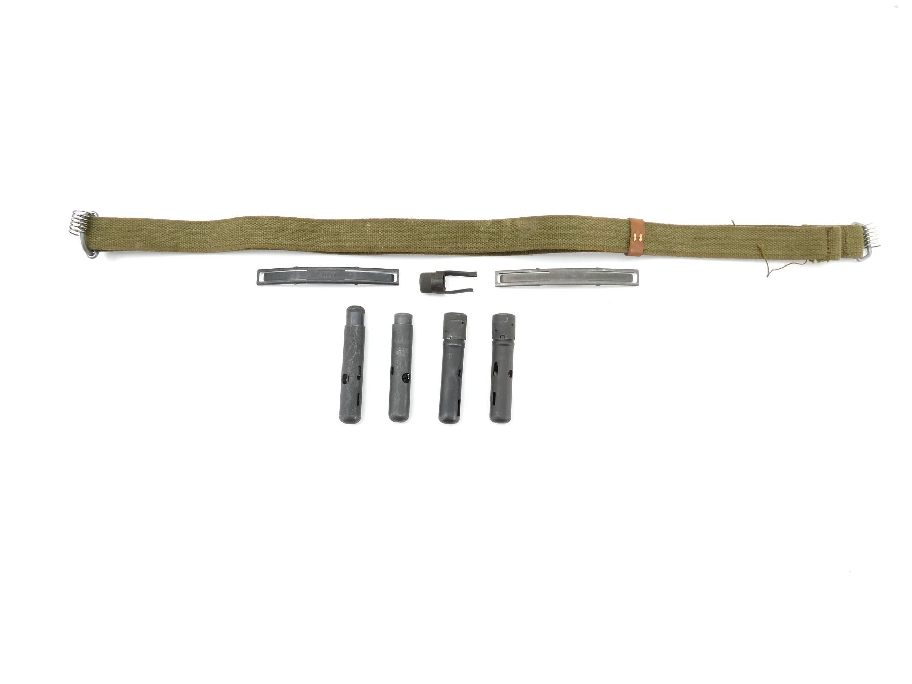 LOT INCLUDES; (1) GREEN CANVAS SKS SLING, NO VISIBLE MARKINGS, METAL FITTINGS, OVERALL LENGTH APPROX. 28", ADJUSTABLE, (4) SKS CLEANING KITS WITH JAGS, WIRE BRUSHES, COMBO TOOLS, PIN PUNCHES, ETC., (2) SKS STEEL 7.62X39MM, 10-RND STRIPPER CLIPS, VARIOUS MARKINGS & (1) SKS MUZZLE COVER. SEE PHOTOS.