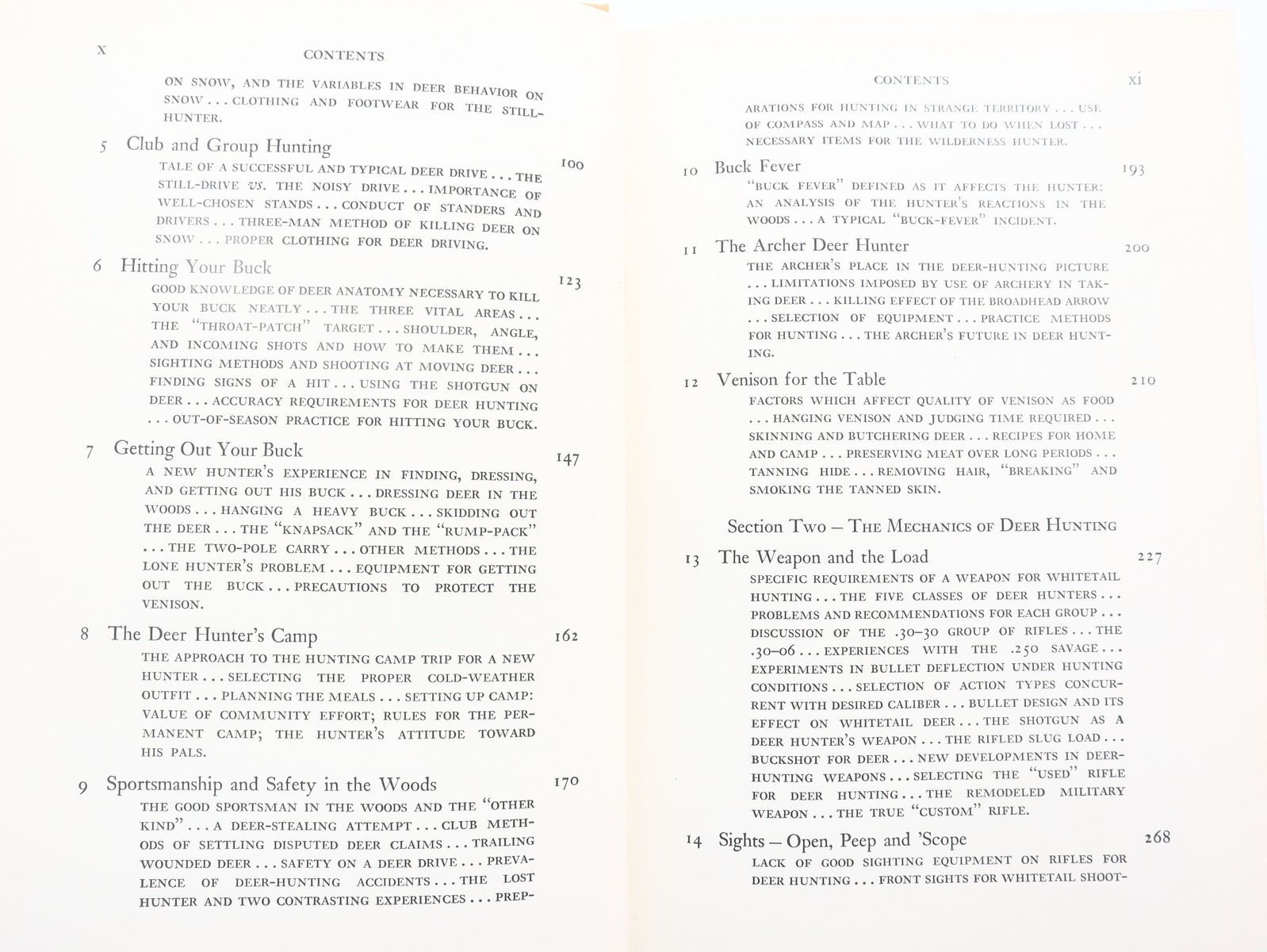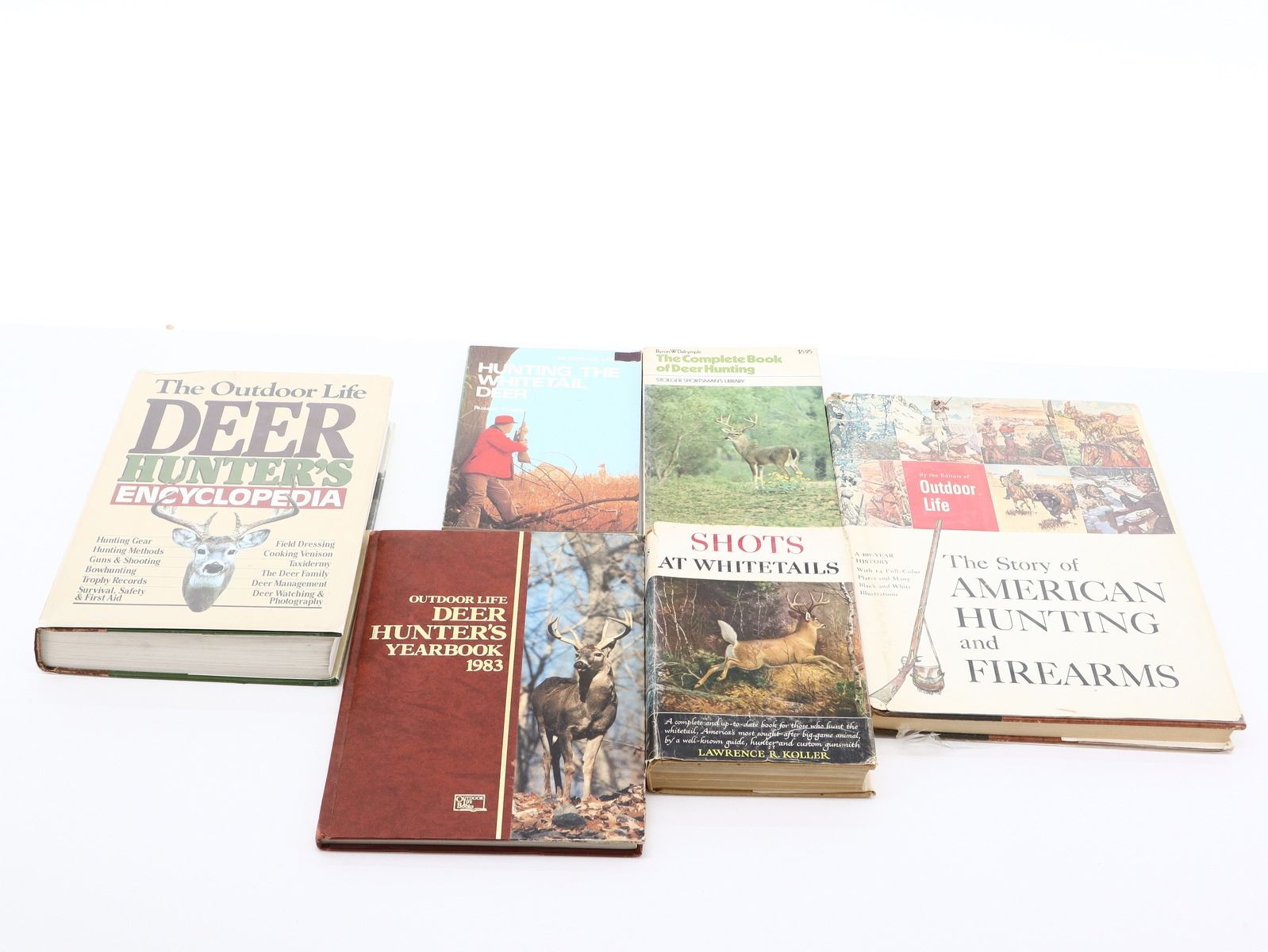 ASSORTED DEER HUNTING BOOK LOT. LOT INCLUDES; (1) "OUTDOOR LIFE DEER HUNTER'S ENCYCLOPEDIA", HARD COVER, ISBN: 0-943822-53-X, (1) "OUTDOOR LIFE DEER HUNTER'S YEARBOOK 1983", HARD COVER, ISBN: 0-943822-18-1, (1) "THE COMPLETE BOOK OF DEER HUNTING" BY BYRON W. DALRYMPLE, SOFT COVER, ISBN: 0-88317-050-7, (1) "SHOTS AT WHITETAILS" BY LAWRENCE R. KOLLER, HARD COVER, 1954 PRINT DATE, (1) "HUNTING THE WHITETAIL DEER" BY RUSSELL TINSLEY, SOFT COVER, ISBN: 0-943822-02-5 & (1) "OUTDOOR LIFE THE STORY OF THE AMERICAN HUNTER AND FIREARMS", HARD COVER, 1959 PRINT DATE. SEE PHOTOS.