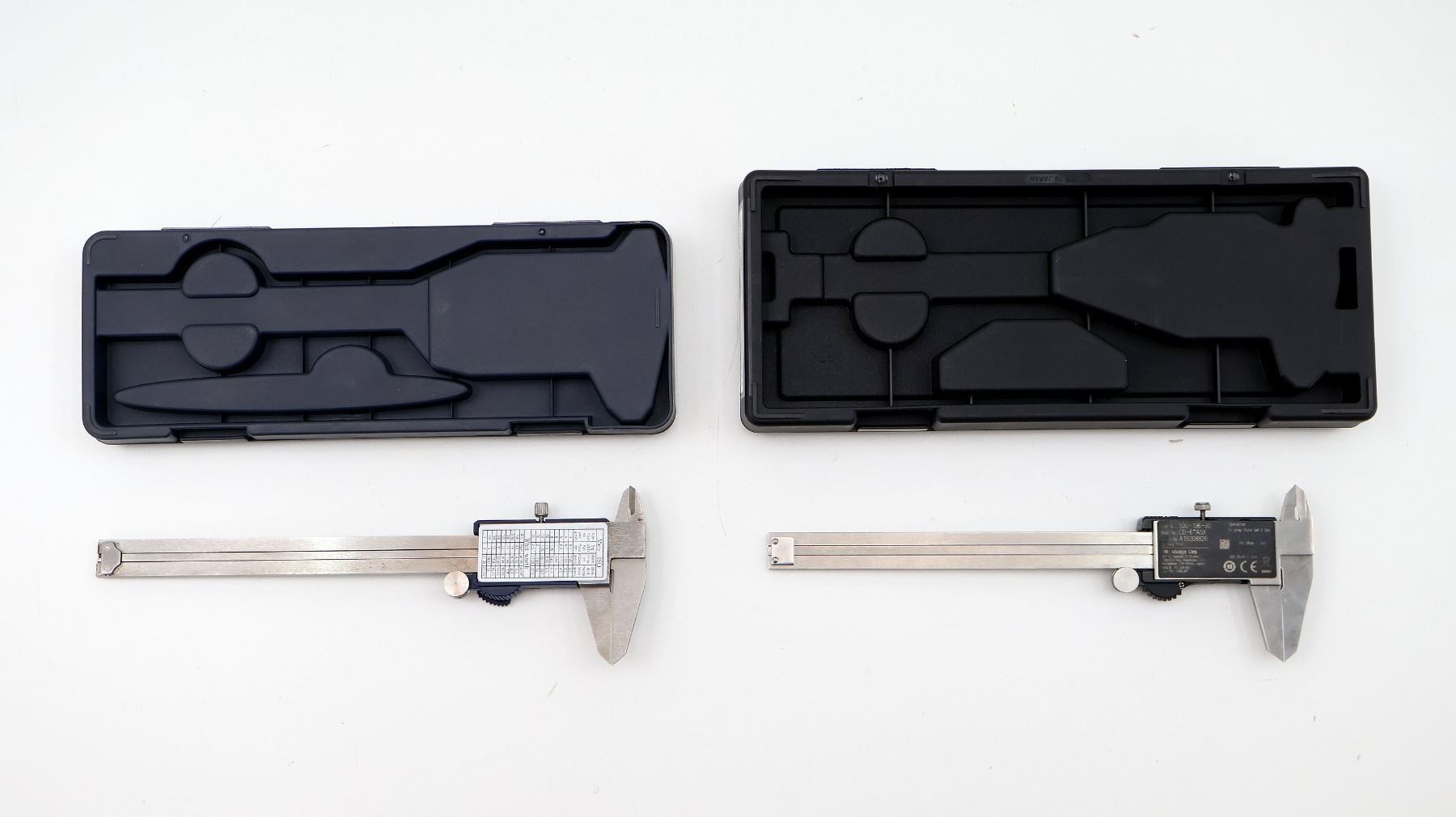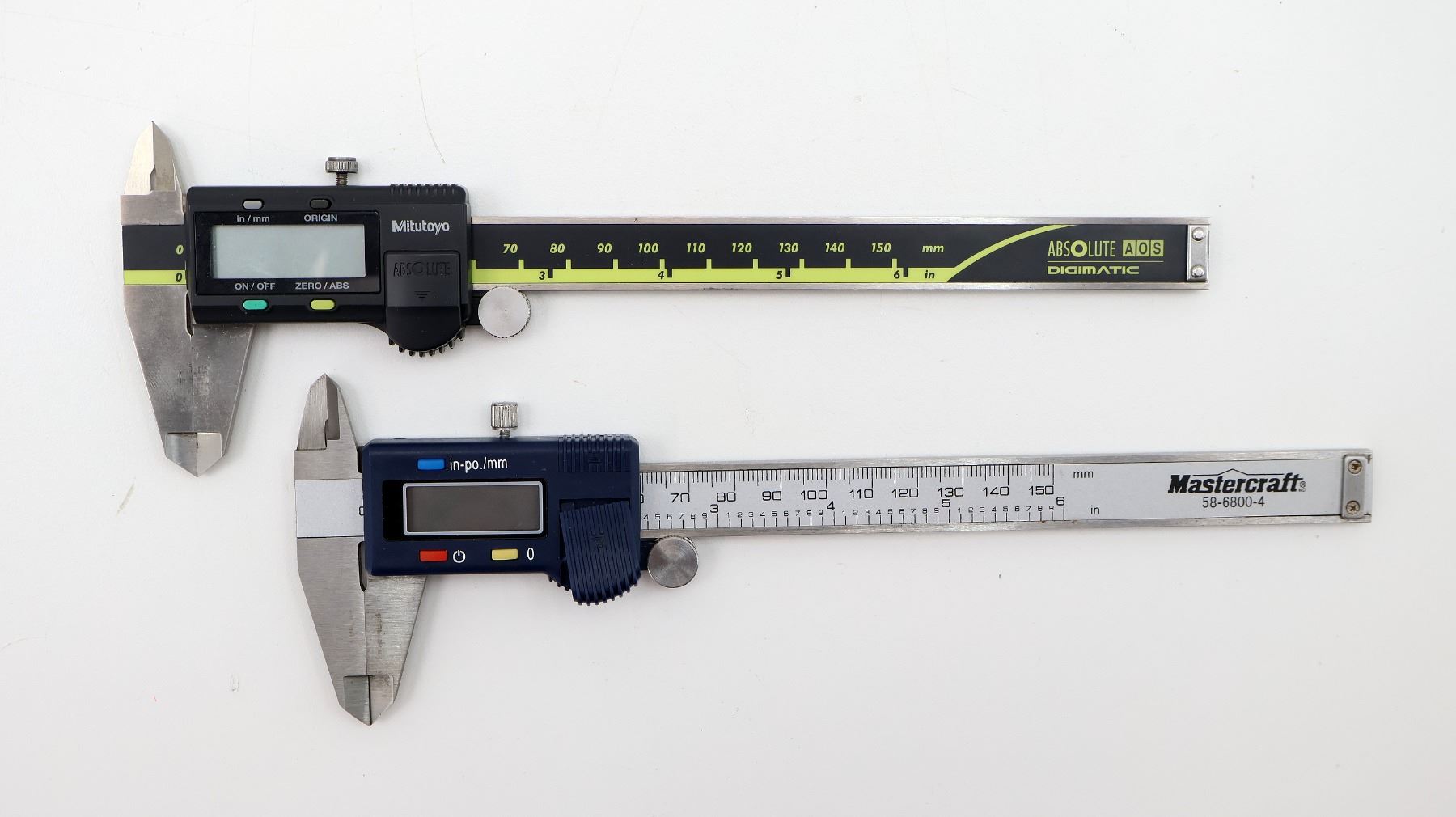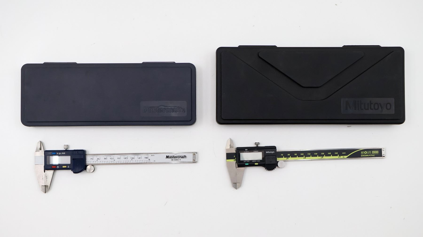 LOT INCLUDES; (1) MITUTOYO DIGITAL CALIPER (WORKS) WITH BLACK PLASTIC CASE, 0 TO 6", VARIOUS MARKINGS & (1) MASTERCRAFT DIGITAL CALIPER (WORKS) WITH BLUE PLASTIC CASE, 0 TO 6", VARIOUS MARKINGS. SEE PHOTOS.