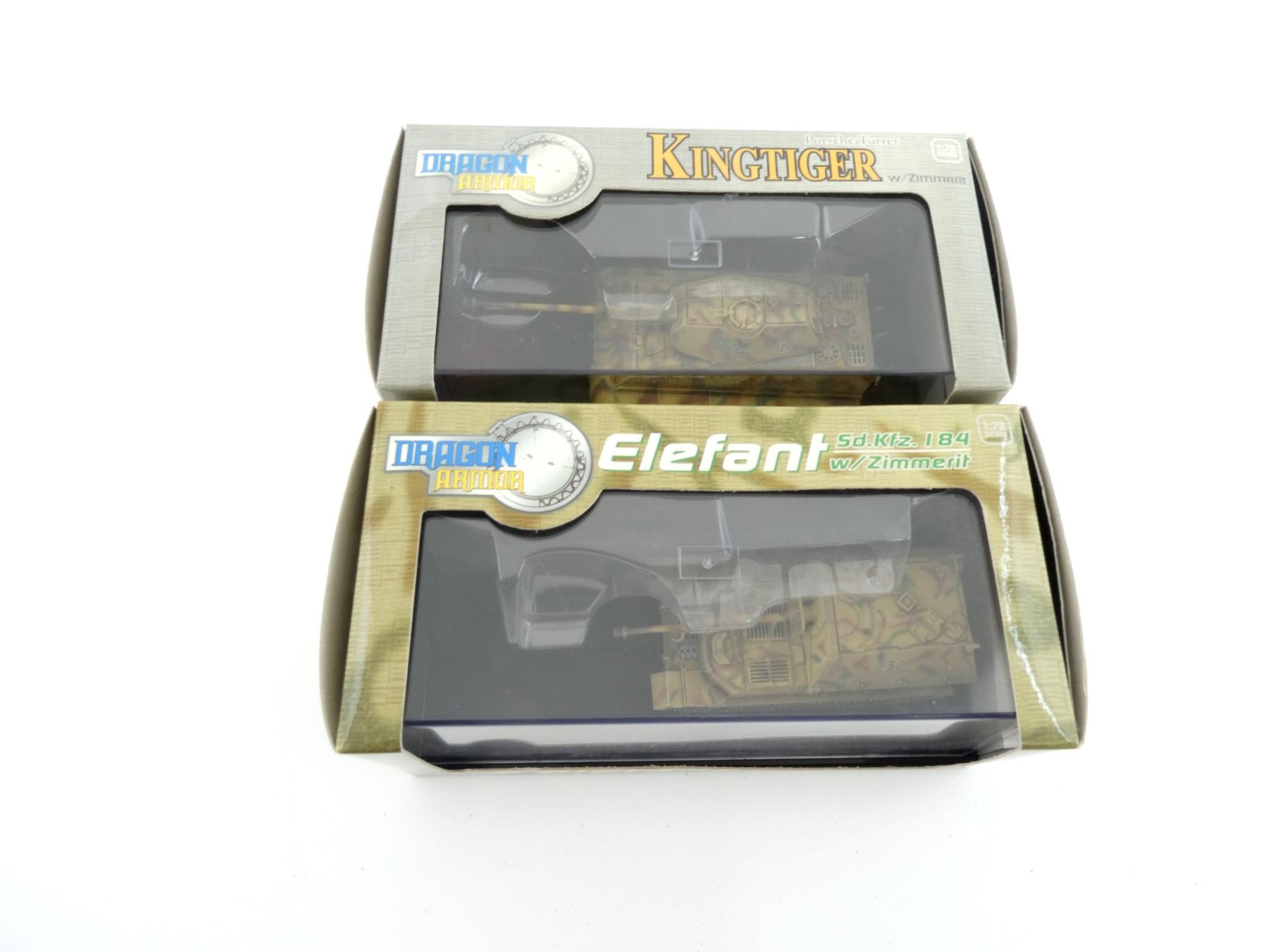 LOT INCLUDES; (1) DRAGON ARMOR GERMAN KINGTIGER PORSCHE TURRET SPZABT 501 NORMANDY 1944 MODEL TANK, 1:72 SCALE, APPEARS NEW OLD STOCK & (1) DRAGON ARMOR GERMAN ELEFANT SD.KFZ. 184 SPZJGABT 653 RUSSIA / POLAND 1944, MODEL TANK, 1:72 SCALE, APPEARS NEW OLD STOCK. SEE PHOTOS.