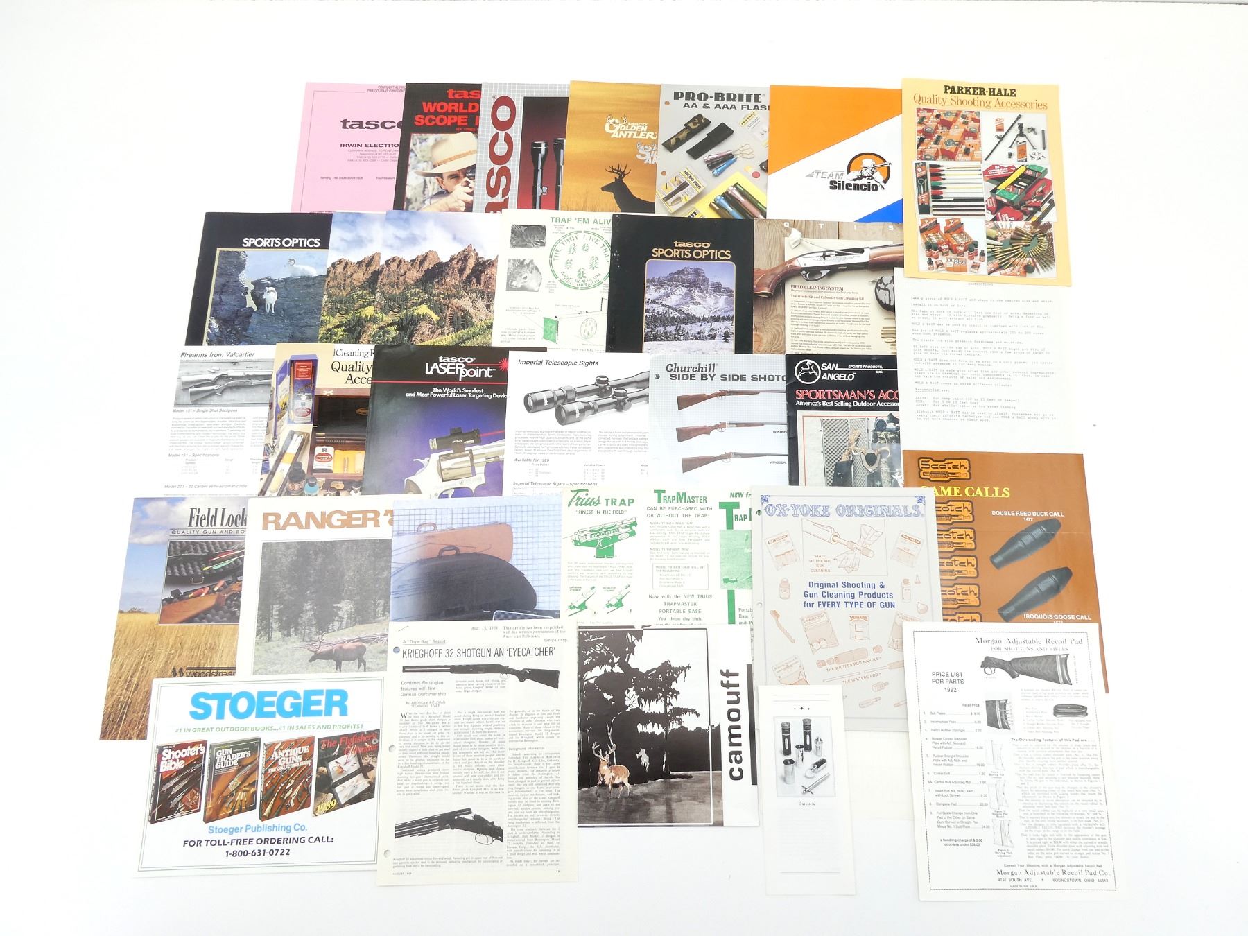 SOFT COVERS, LOT INCLUDES; (5) "TASCO SPORTS OPTICS" CATALOGUES, (1) "DAVLOCK" BROCHURE, (1) "PARKER-HALE QUALITY SHOOTING ACCESSORIES" BROCHURE, (1) "SPORTSMAN'S ACCESSORIES: AMERICA'S BEST SELLING OUTDOOR ACCESSORIES FOR OVER 30 YEARS" CATALOGUE, (1) "IMPERIAL TELESCOPIC SIGHTS" FLYER, (1) "GUN GUARD '93" CATALOGUE, (1) "OTIS FIELD CLEANING SYSTEM" FLYER, (1) "FIELD LOCKER QUALITY GUN AND BOW CASES" BROCHURE, (1) "A 'DOPE BAG' REPORT: KRIEGHOFF 32 SHOTGUN AN 'EYECATCHER'" ARTICLE, DATED AUGUST 15, 1969, (1) "MORGAN ADJUSTABLE RECOIL PAD FOR SHOTGUNS AND RIFLES" FLYER, (1) "CHURCHILL SIDE BY SIDE SHOTGUNS" FLYER, (1) "CAMOUFF" BROCHURE & PRICE LIST, (1) "RANGER '81" CATALOGUE, (1) "PRO-BRITE AA & AAA FLASHLIGHTS" FLYER, (1) "GAME CALLS DOUBLE REED DUCK CALL 1477" BROCHURE, (1) "TRAP 'EM ALIVE" FLYER, (1) "FIREARMS FROM VALCARTIER" FLYER, (1) "STOEGER #1 IN GREAT OUTDOOR BOOKS...#1 IN SALES AND PROFITS!" CATALOGUE, (1) "INTRODUCING THE TS SHELL CATCHERS" FLYER, (1) "TRIUS TRAP MASTER" FLYER, (1) "OX-YOKE ORIGINALS: ORIGINAL SHOOTING & GUN CLEANING PRODUCTS FOR EVERY TYPE OF GUN" CATALOGUE, & (1) "TEAM SILENCIO" CATALOGUE & PRICE LIST, ETC. SEE PHOTOS.