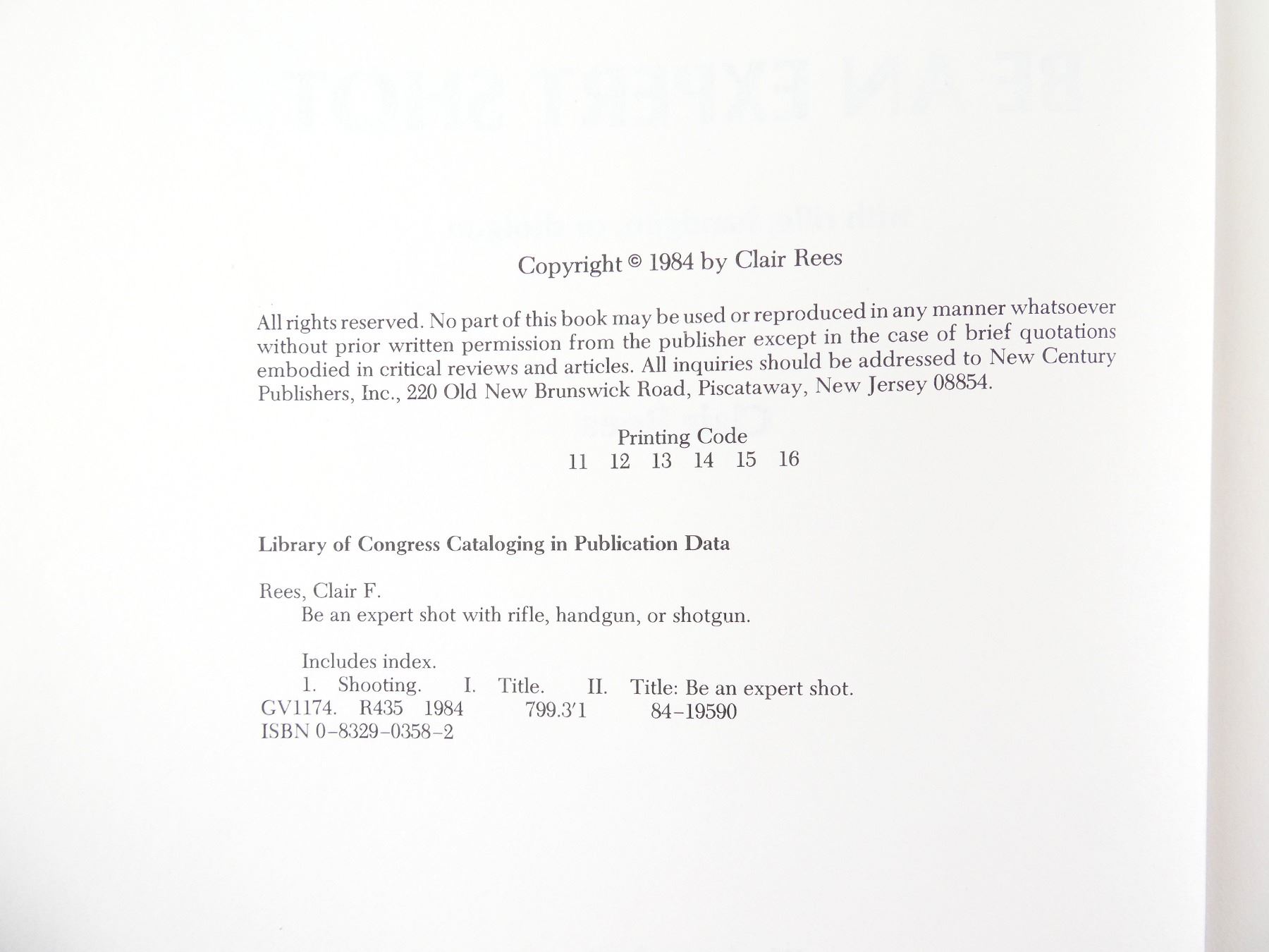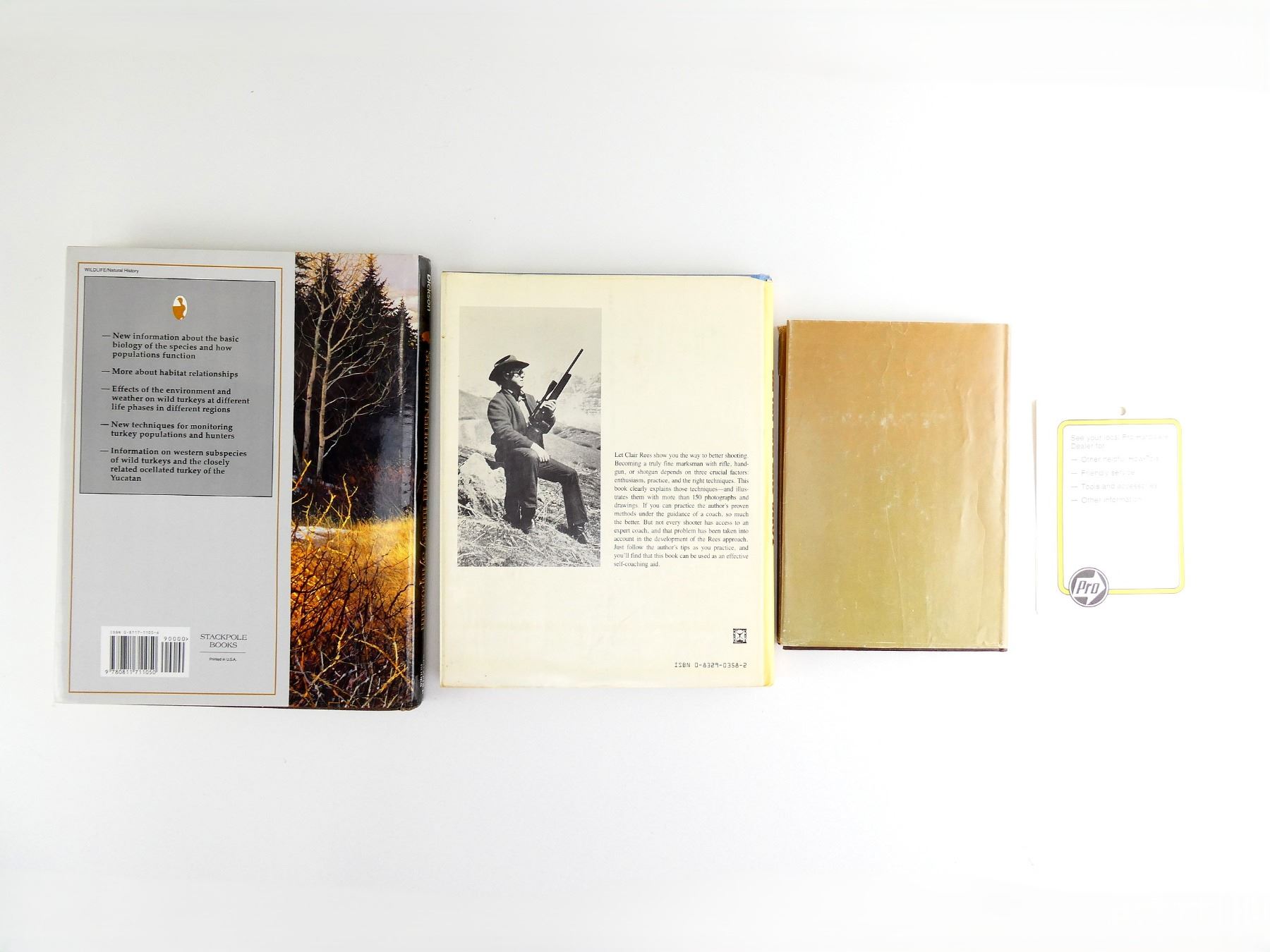 LOT INCLUDES; "BE AN EXPERT SHOT WITH RIFLE, HANDGUN, OR SHOTGUN" BOOK BY CLAIR REES, HARD COVER WITH DUST COVER, ISBN: 0-8329-0358-2, (1) "THE AMATEUR TAXIDERMIST" BOOK BY JEAN LABRIE, HARD COVER WITH DUST COVER, ISBN: 8055-1035-4, (1) "PROCEEDINGS OF THE SEVENTH NATIONAL WILD TURKEY SYMPOSIUM" BOOK, HARD COVER WITH DUST COVER, ISBN: 0-8117-1105-6 & (1) "HOW TO REDUCE BREAK-INS IN YOUR HOME" PAMPHLET. SEE PHOTOS.