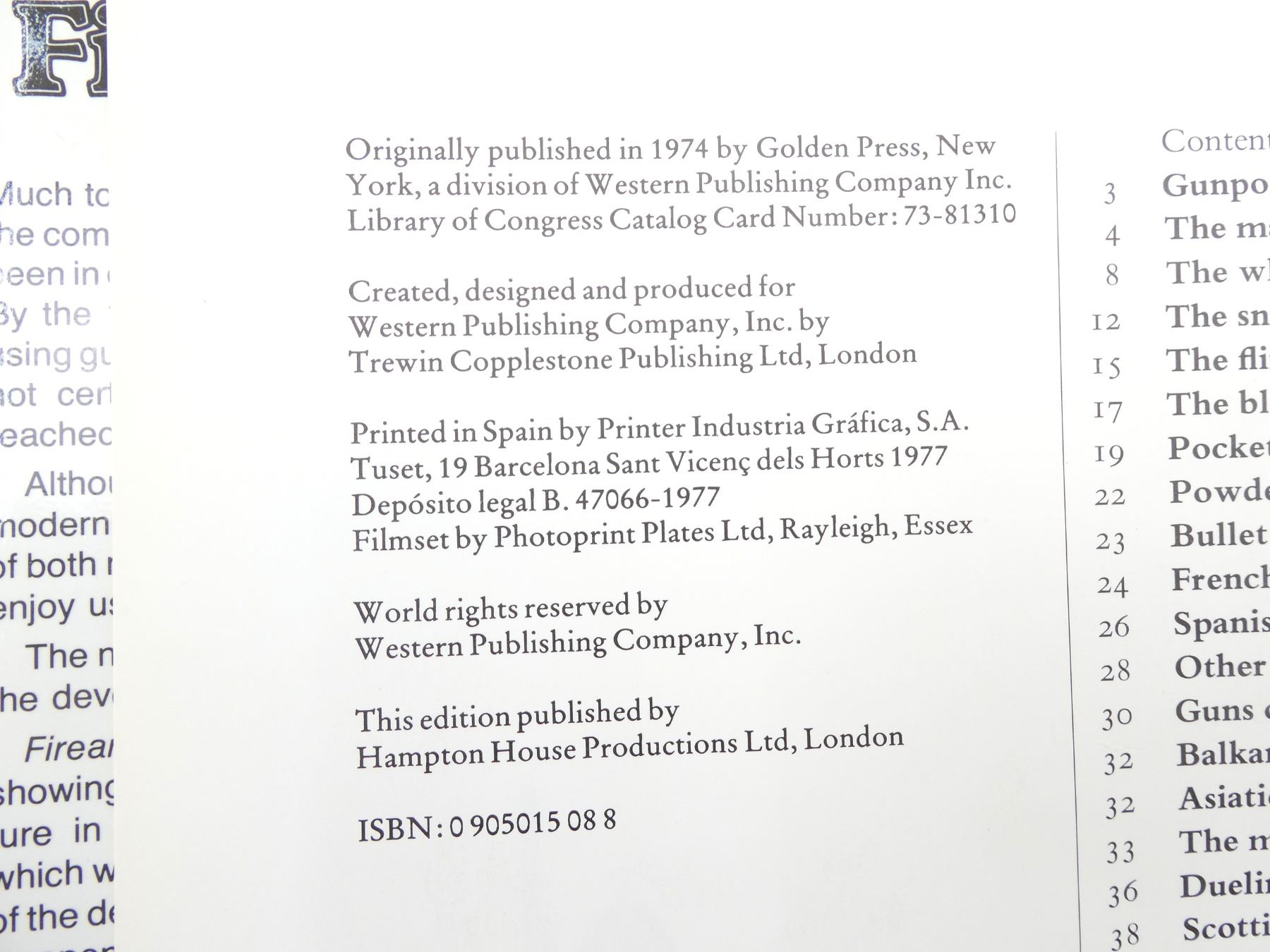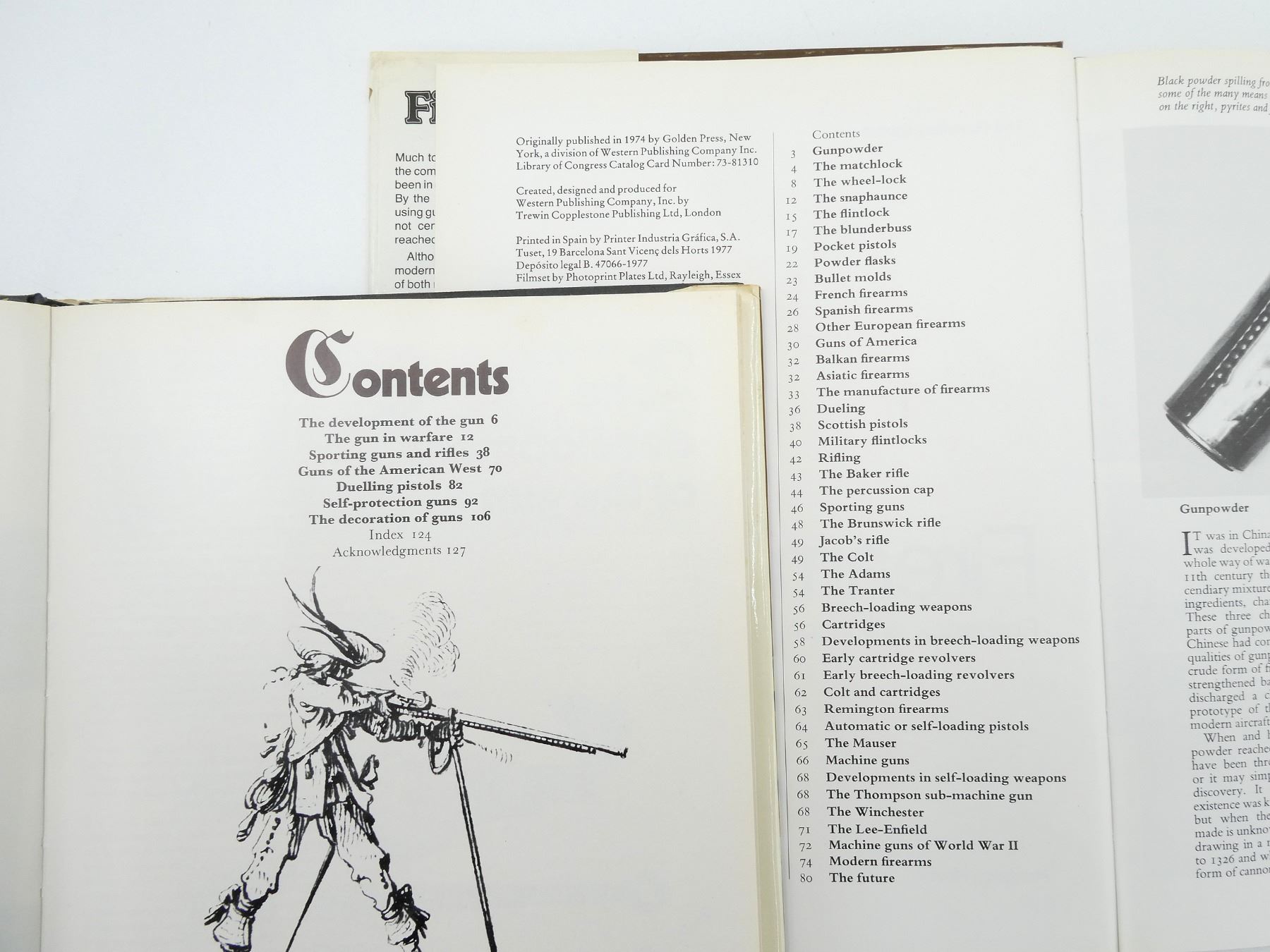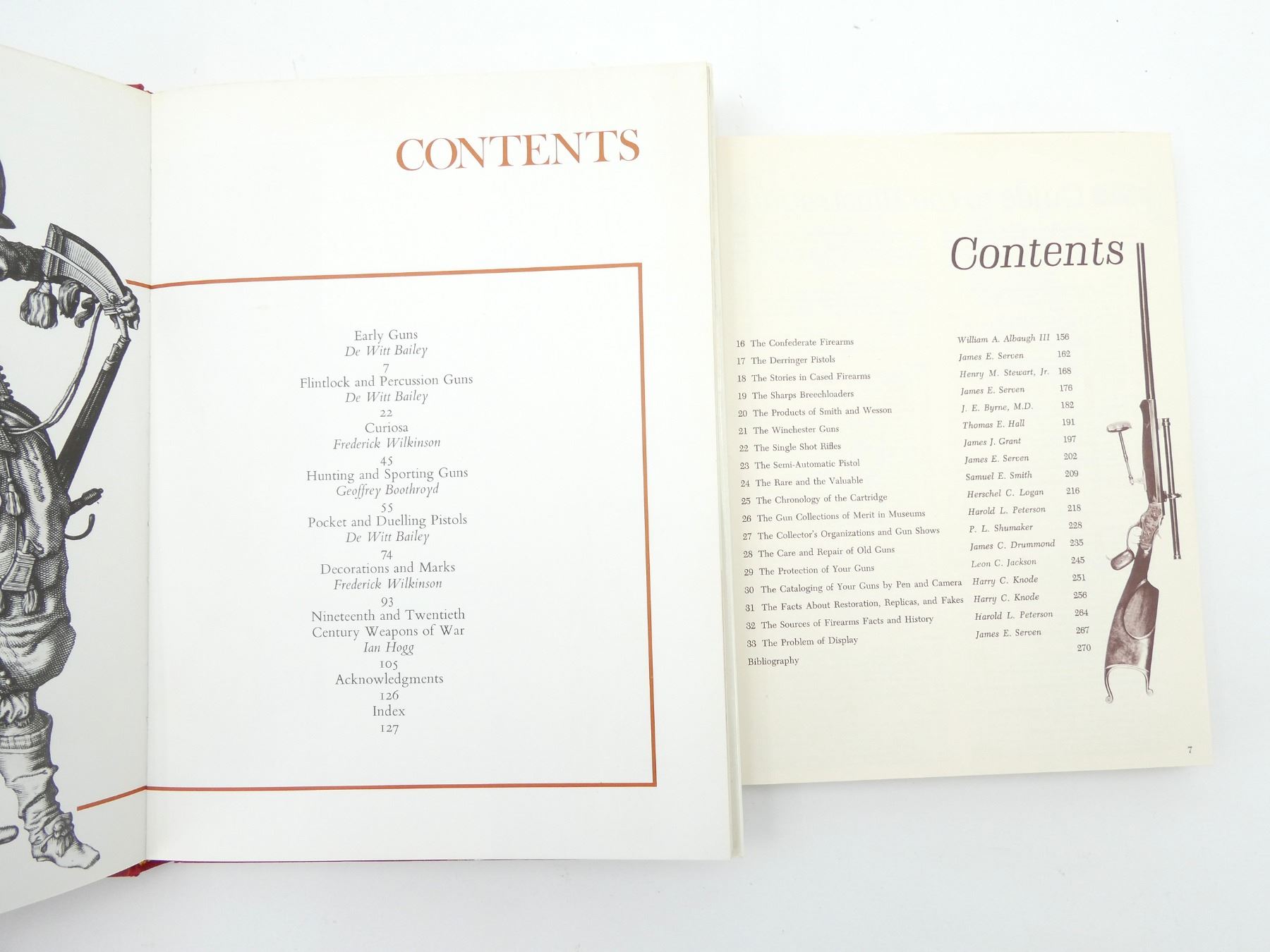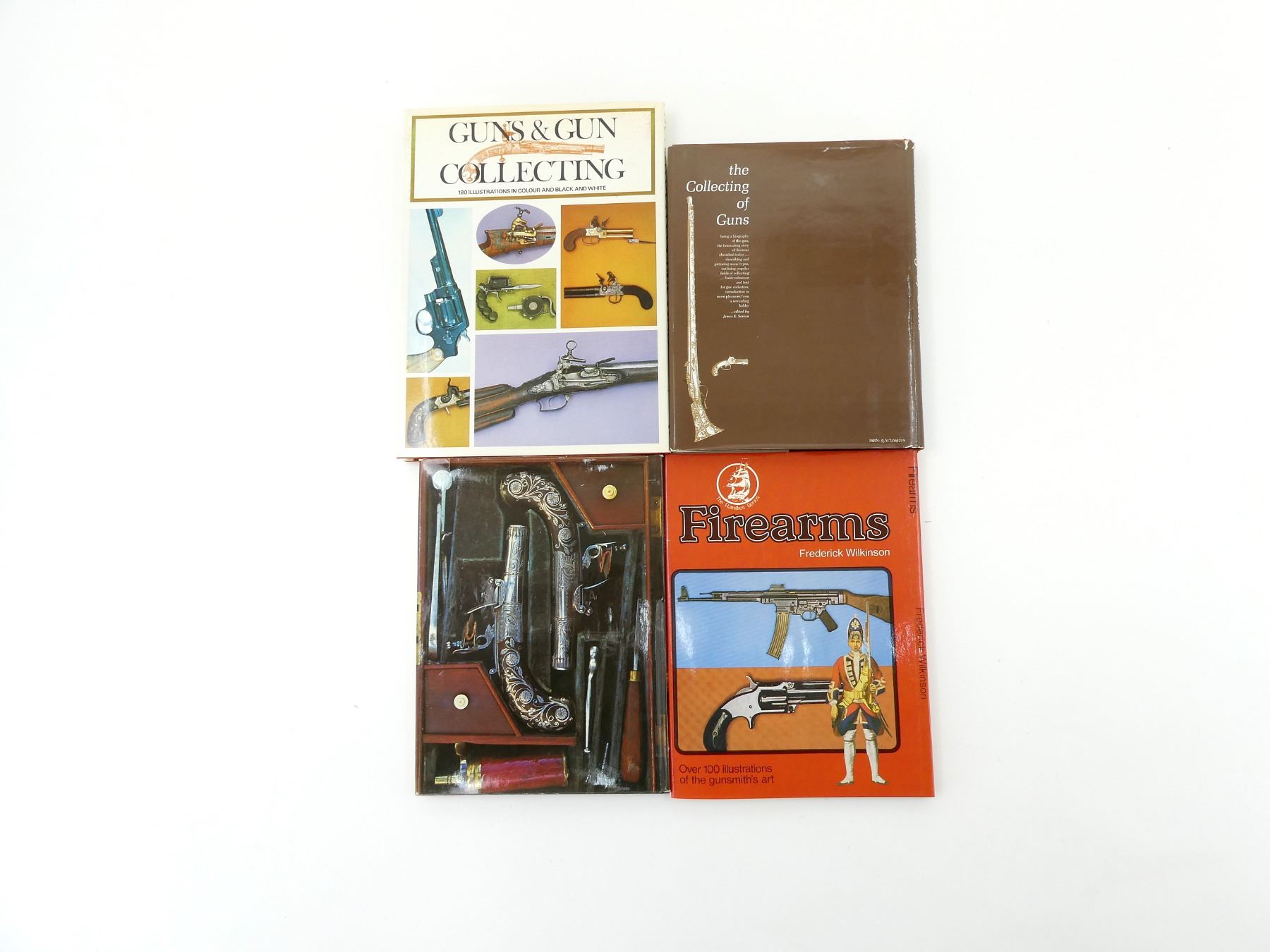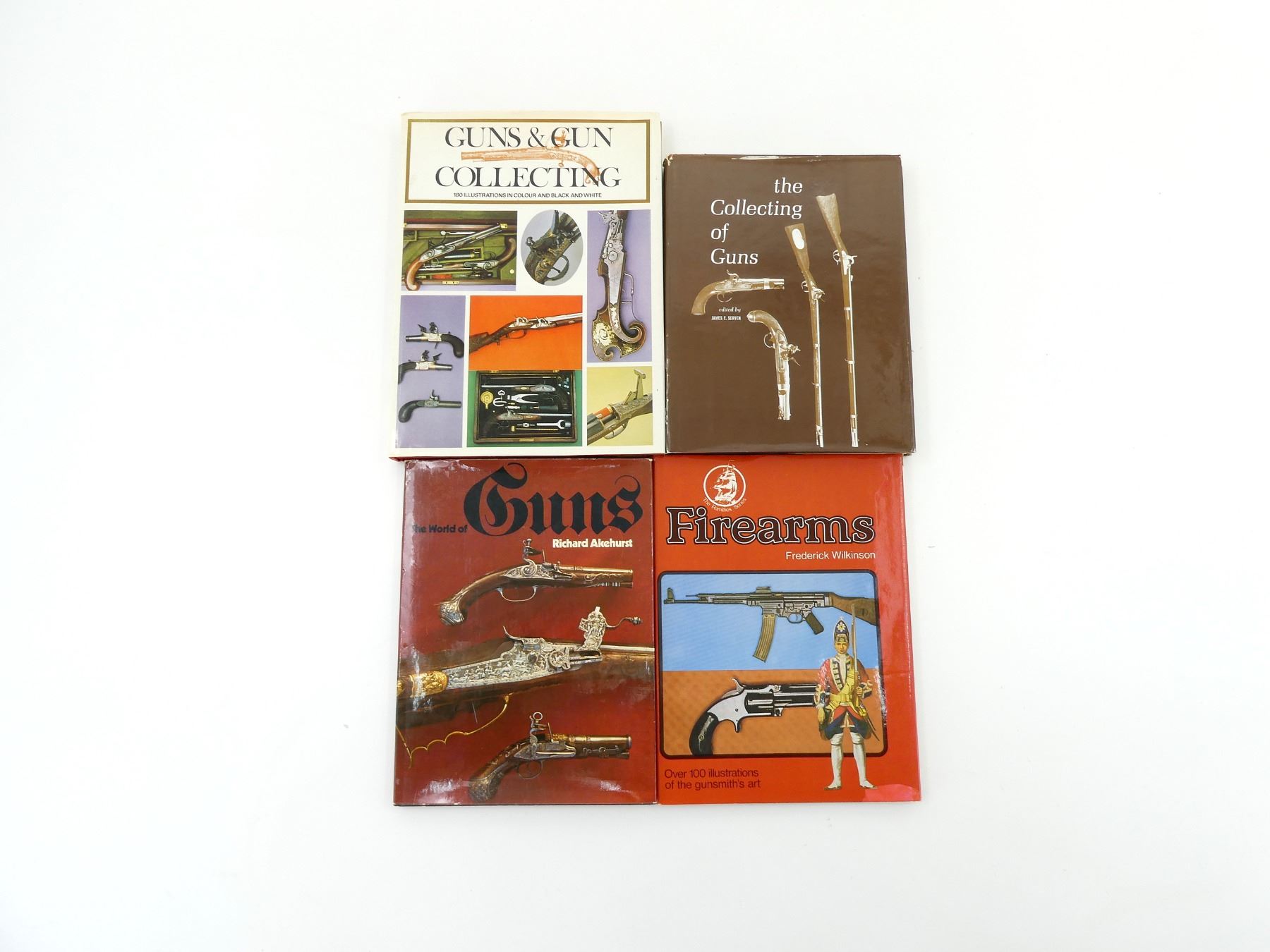 LOT INCLUDES; (1) "FIREARMS" BOOK BY FEDERICK WILKINSON, HARD COVER WITH DUST COVER, ISBN: 0-905015-08-8, (1) "THE WORLD OF GUNS" BOOK BY RICHARD AKEHURST, HARD COVER WITH DUST COVER, ISBN: 0-600-39236-8, (1) "THE COLLECTING OF GUNS" BOOK EDITED BY JAMES E. SEVEN, HARD COVER WITH DUST COVER, COPYRIGHT 1964 & (1) "GUN & GUN COLLECTING" BOOK BY DE WITT BILEY / IAN HOGG / GEOFFREY BOOTHROYD / FREDERICK WILKINSON, HARD COVER WITH DUST COVER, ISBN: 07064-0022-4. SEE PHOTOS.
