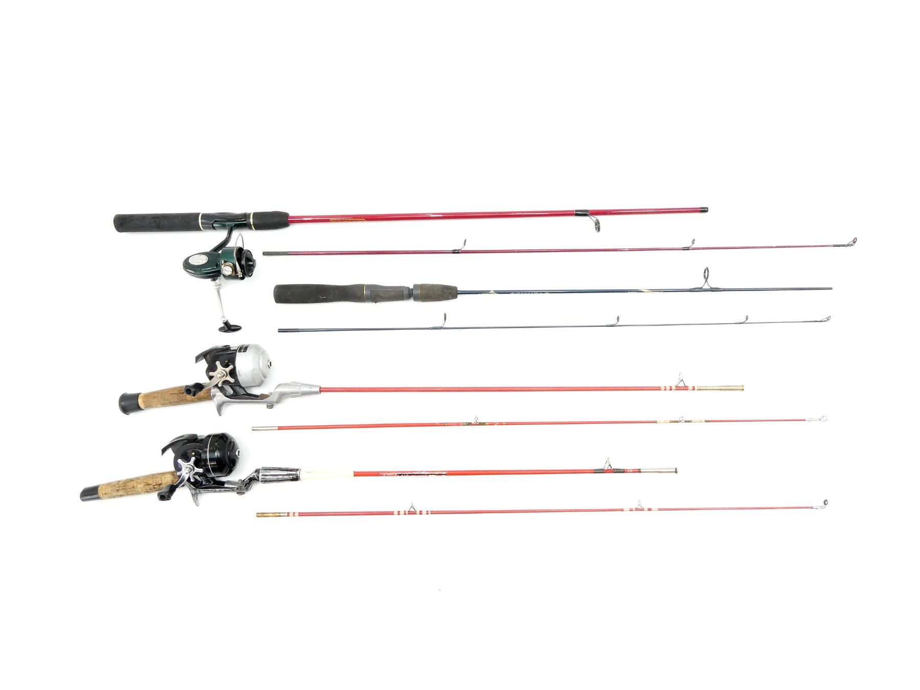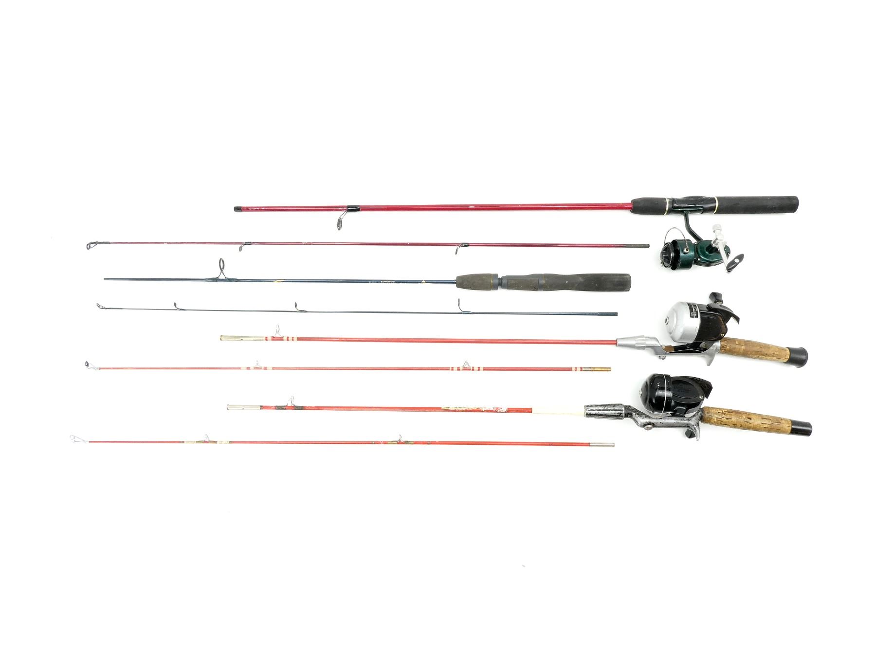 LOT INCLUDES; (4) ASSORTED FISHING RODS, THREE WITH REELS, VARIOUS MANUFACTURERS, OAL'S APPROX. 60.5"-66", UNTESTED, MAY BE INCOMPLETE OR MISSING PARTS, ETC. SEE PHOTOS.