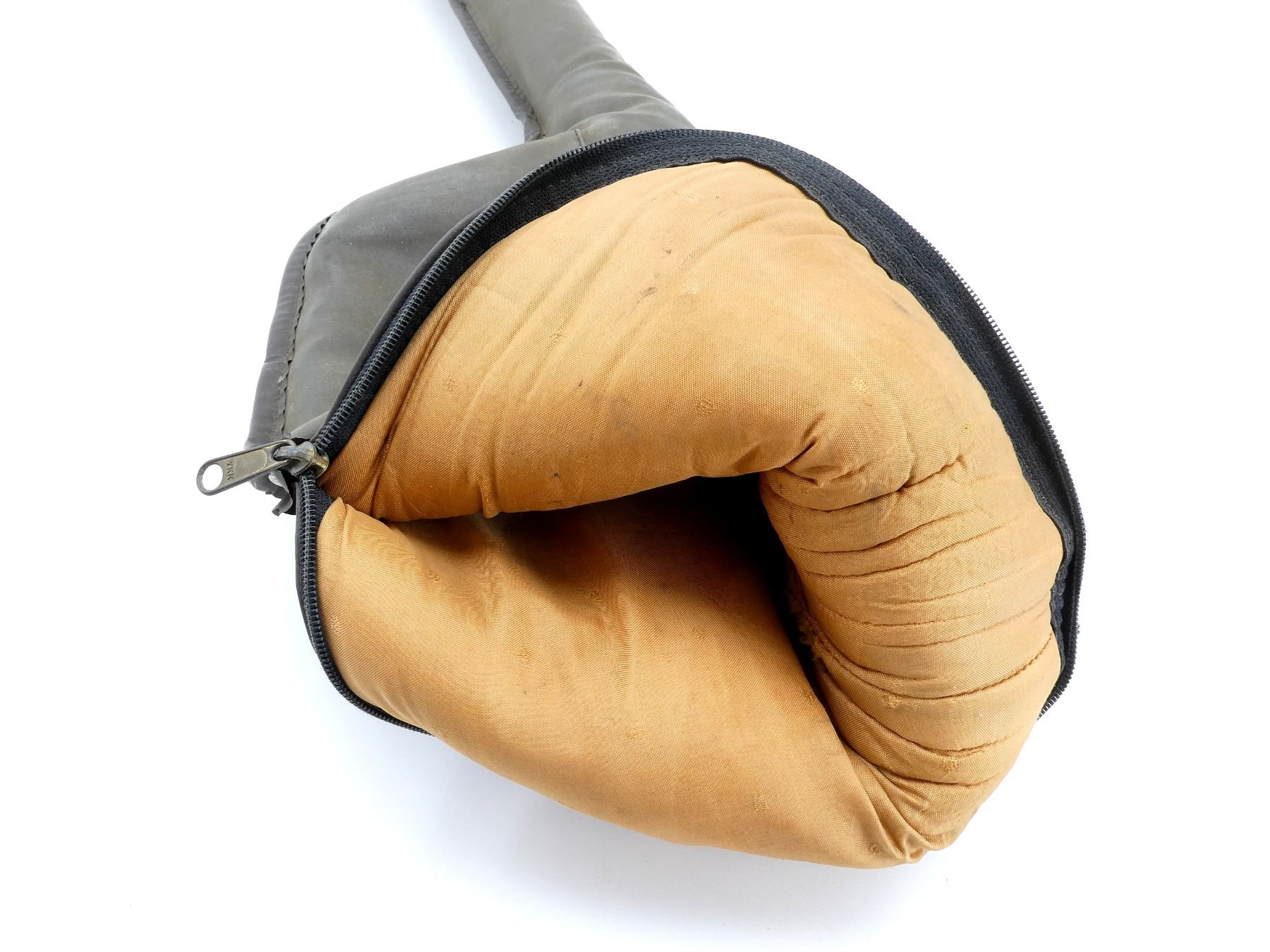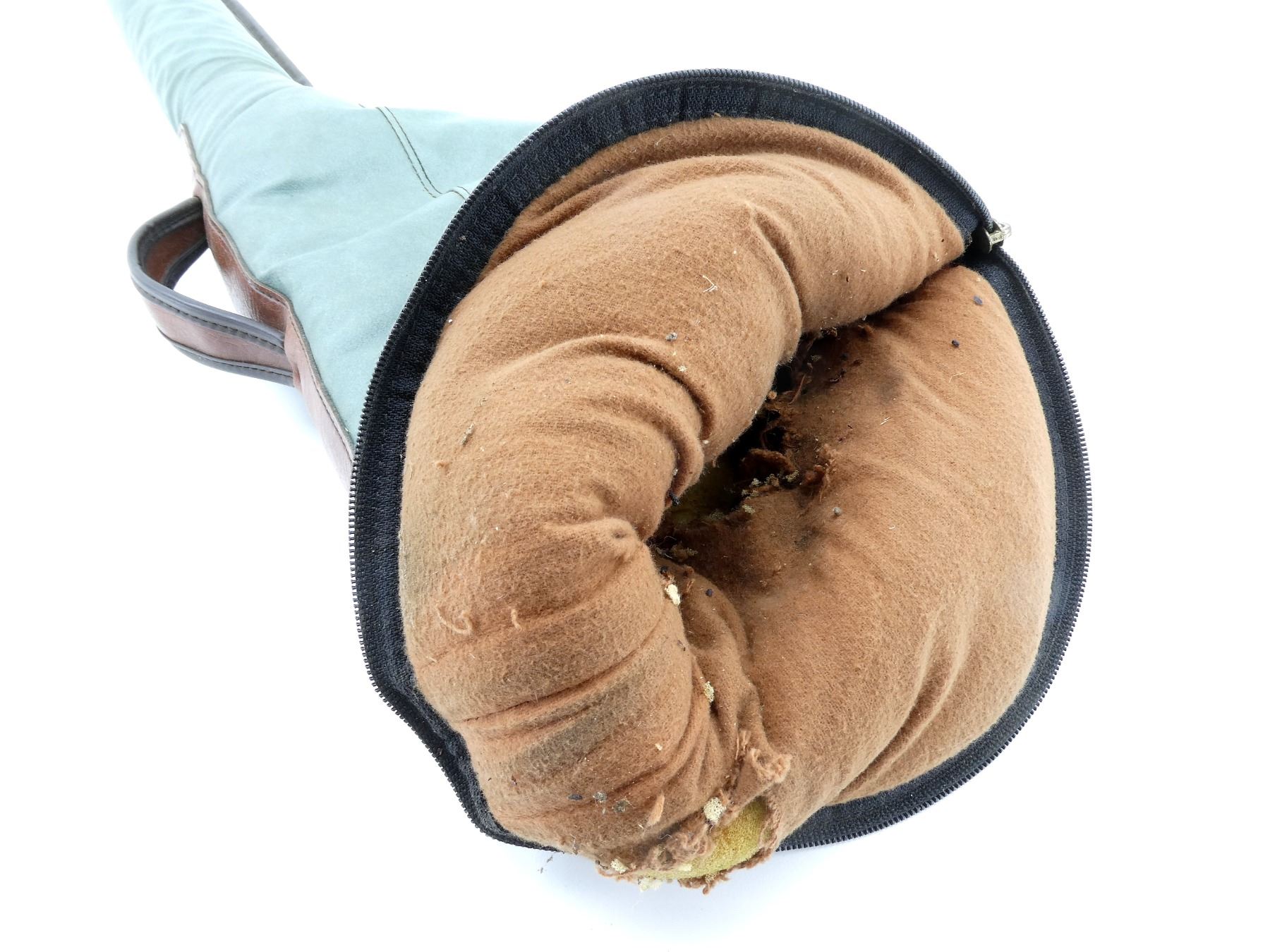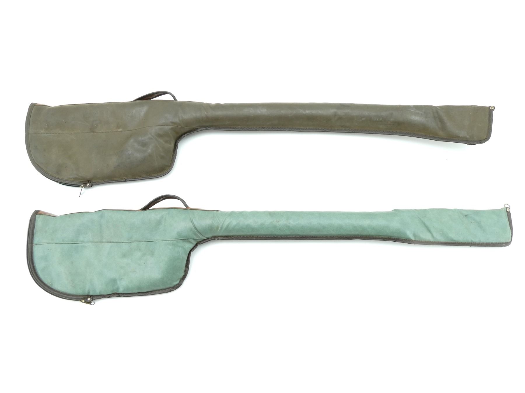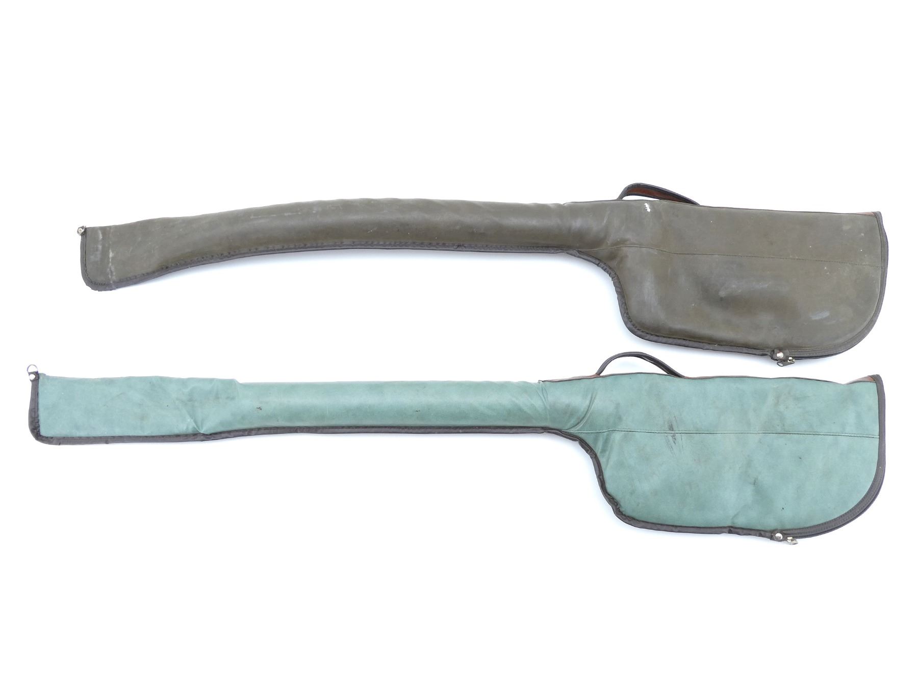 LOT INCLUDES; (2) UNKNOWN BROWN & GREEN LEATHER FISHING ROD TUBE-STYLE CASES, SOFT PADDED WITH HARD TUBE FOR PROTECTION, OVERALL LENGTH APPROX. 50". SEE PHOTOS.