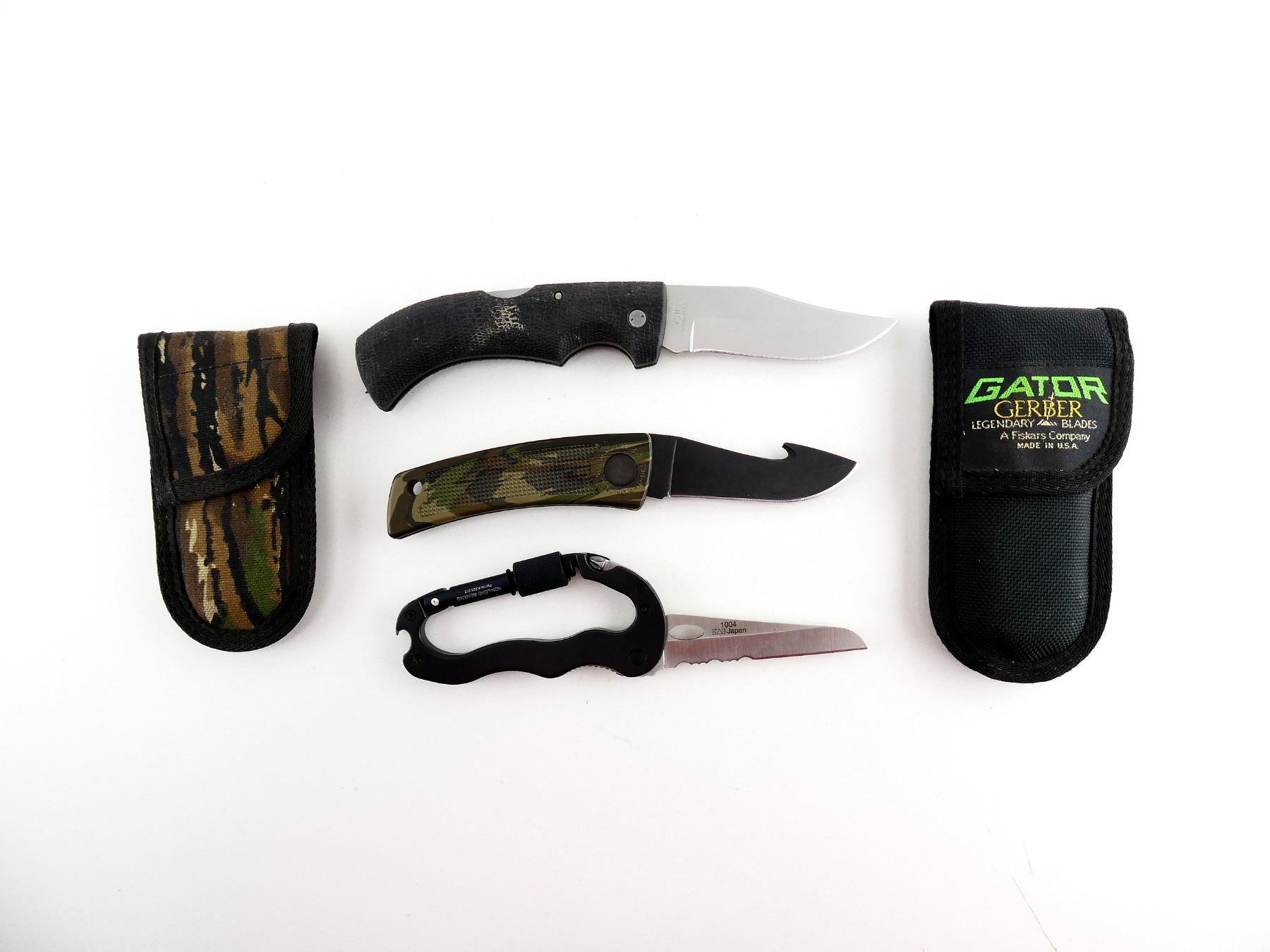LOT INCLUDES; (1) GERBER GATOR KNIFE, STEEL BLADE, MARKED "GERBER 650", ETC., RUBBER HANDLE, UNMARKED, SHOWS WEAR & TEAR / USE MARKS, BLADE OVERALL LENGTH APPROX. 4", OVERALL LENGTH APPROX. 8.75", WITH BLACK NYLON SHEATH, MARKED "GATOR", ETC., (1) GERBER BOLT ACTION KNIFE, STEEL BLADE WITH GUT HOOK, MARKED "GERBER", CAMO POLYMER HANDLE, MARKED "GERBER BOLT ACTION", ETC., SHOWS LIGHT WEAR & TEAR / USE MARKS, BLADE OVERALL LENGTH APPROX. 3.25", OVERALL LENGTH APPROX. 7.5", WITH CAMO NYLON SHEATH, UNMARKED & (1) NATIONAL GEOGRAPHIC MULTI-FUNCTION CARABINER, STEEL BLADE, MARKED "KERSHAW", ETC., METAL HANDLE, MARKED "NATIONAL GEOGRAPHIC", WITH SCREW HEADS & CAN OPENER, ETC., SHOWS LIGHT WEAR & TEAR / USE MARKS, BLADE OVERALL LENGTH APPROX. 3.25", OVERALL LENGTH APPROX. 4.25". SEE PHOTOS.