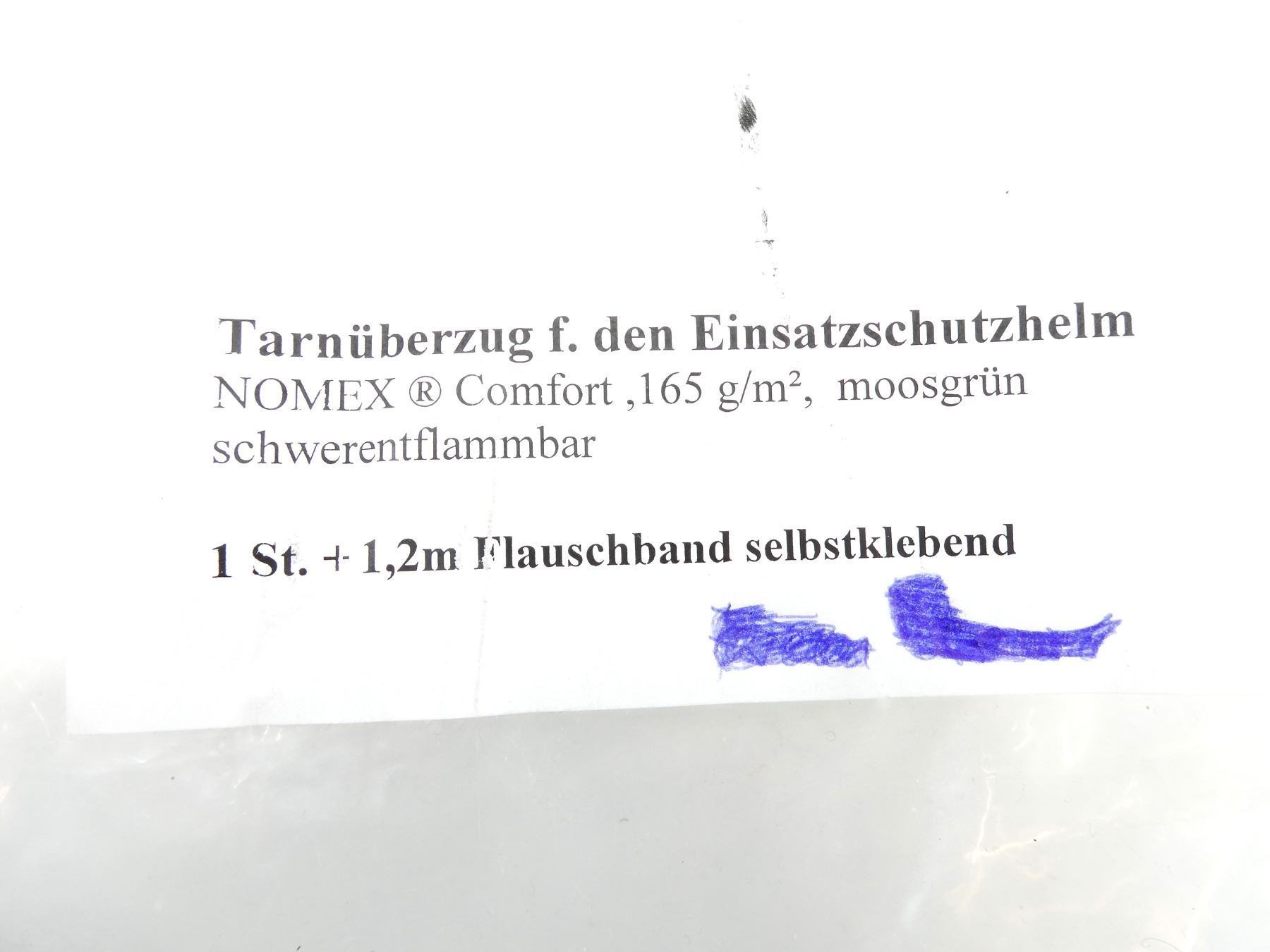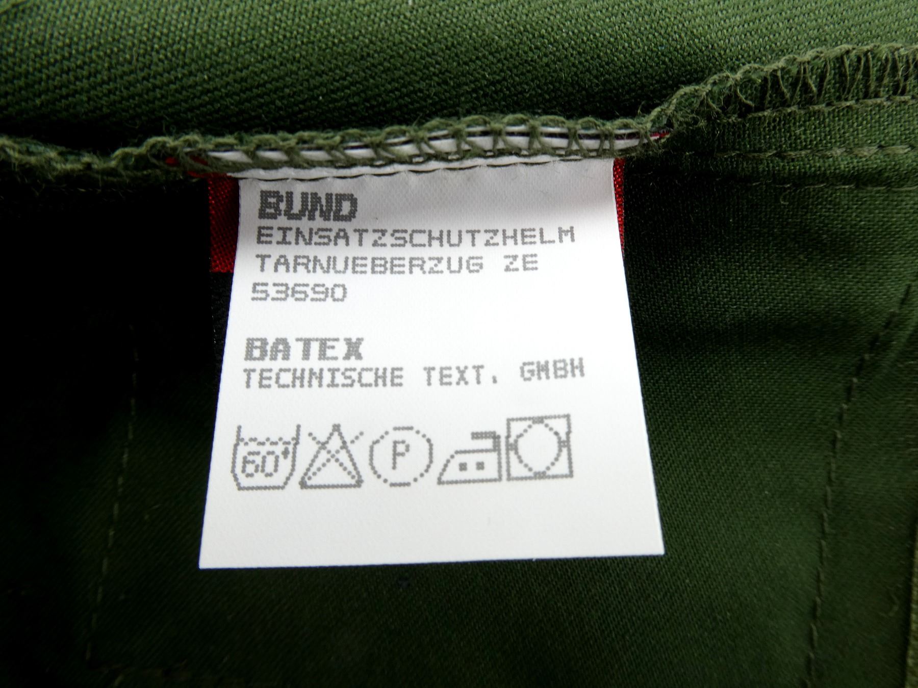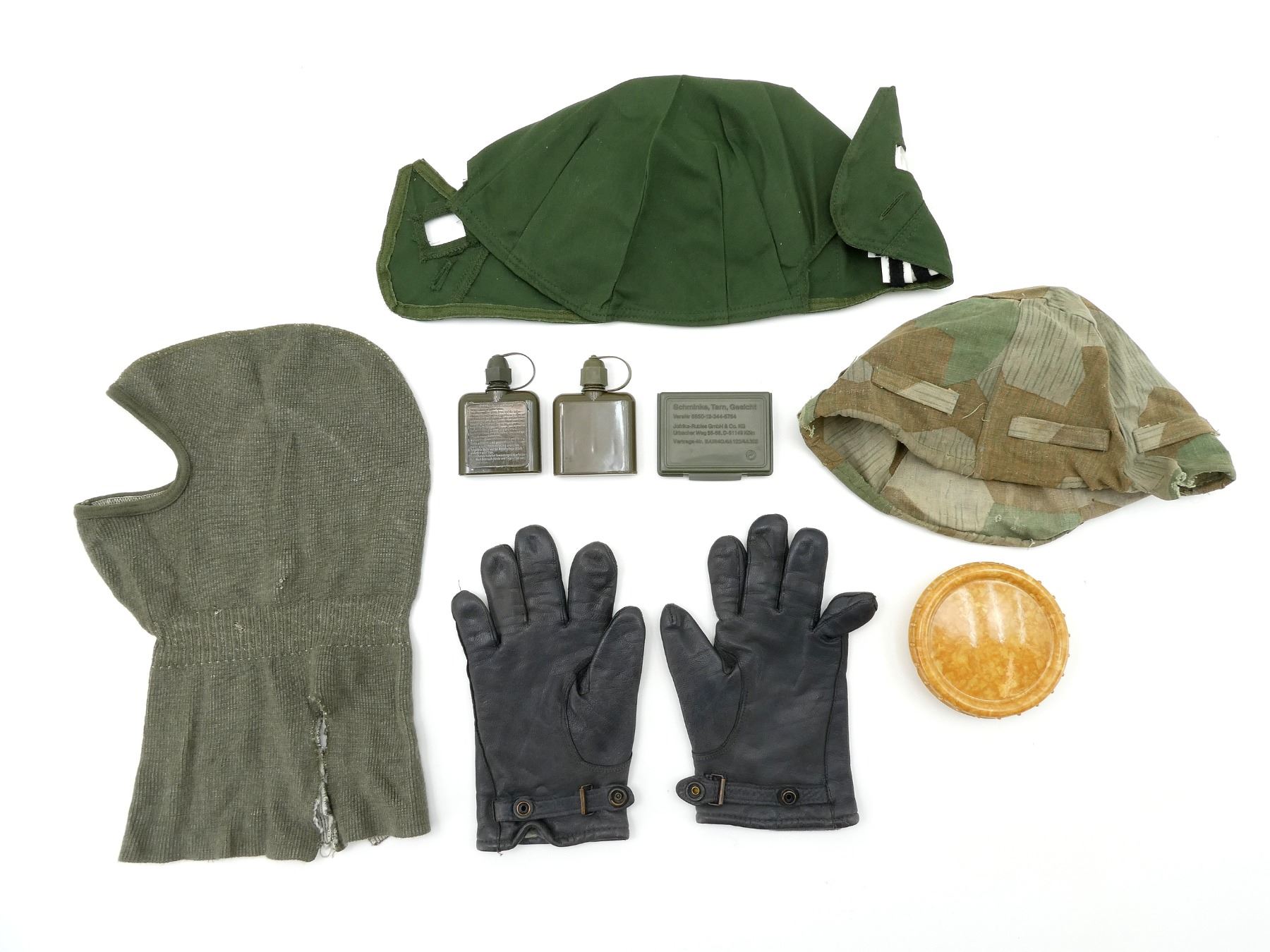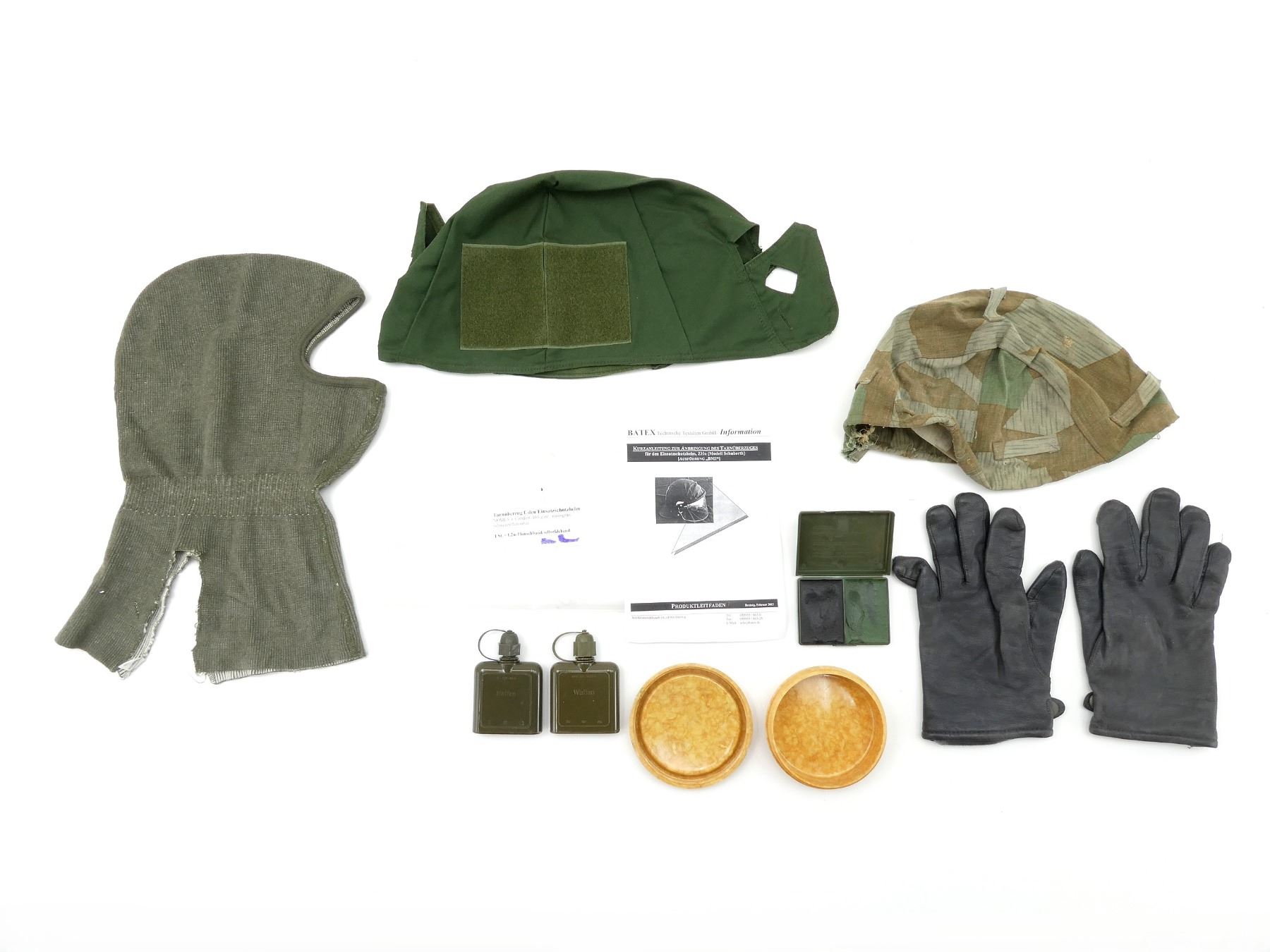 LOT INCLUDES; (1) BUNDESWEHR HEAD WARMER (KOPFHAUBE) WORN UNDER STEEL HELMET, LABEL MARKED: "NITZSCHE, 7/88, H 0107" ETC., SHOWS AGE / WEAR, (1) BUNDESWEHR ENLISTED MAN'S PAIR OF LEATHER GLOVES, GREY, LABEL MARKED: "10 10/02 2708H", WOOL / FELT LINED, SHOWS AGE / WEAR, (1) GREEN COVER FOR THE FLAME-RETARDANT PROTECTIVE HELMET, COMES WITH INSTRUCTIONAL SHEET, LABEL ON COVER MARKED: "BUND, EINSATZSCHUTZHELM, TARNUEBERZUG ZE, 53690, BATEX, TECHNISCHE TEXT, GMBH", "NOMEX", ETC., VELCRO EDGES, COMES WITH STRIP OF VELCRO BACKING, (1) REPRODUCTION GERMAN ARMY CAMO HELMET COVER, NO VISIBLE MARKINGS, SHOWS AGE / WEAR, (1) BUNDESWEHR FAT / BUTTER DISH, TAN PLASTIC CONSTRUCTION, MARKED: "BGS" ON THE BOTTOM, APPROX. 4 3/8" DIA., (2) GREEN PLASTIC RIFLE OILERS, ONE MARKED: "6850-12-120-0815, WAFFEN, STR 1957 P51", OTHER MARKED: "12-120-0815, WAFFEN, PSL, 62" ETC. & (1) FACE PAINT KIT, GREEN PLASTIC CONTAINER, MARKED: "SCHMINKE, TARN, GESICHT, VERSNR 6850-12-344-5764" ETC. SEE PHOTOS.