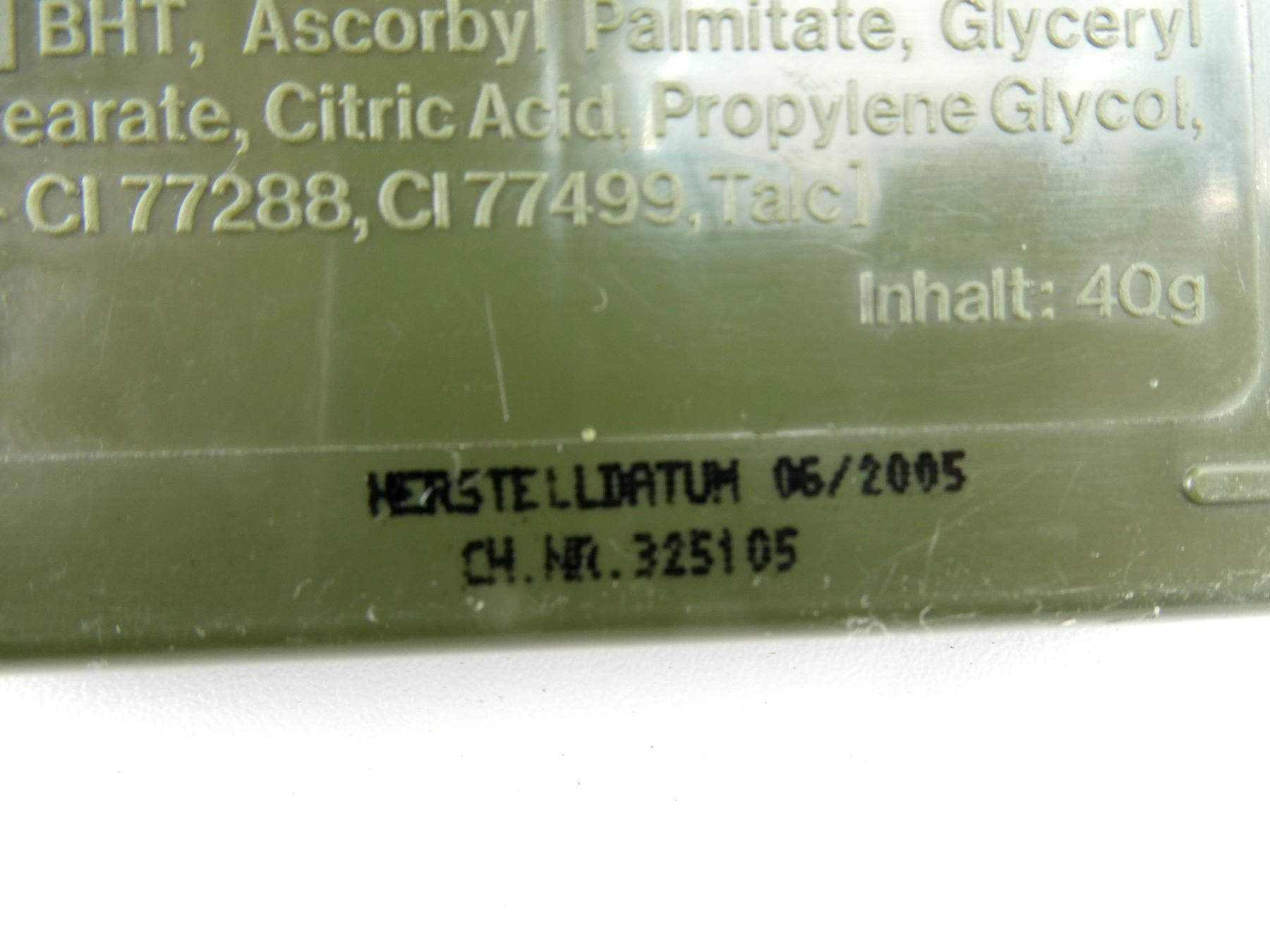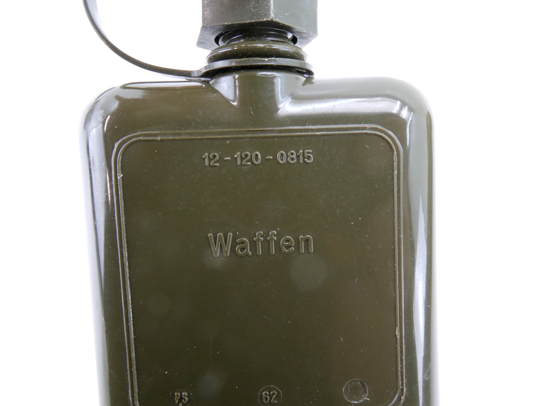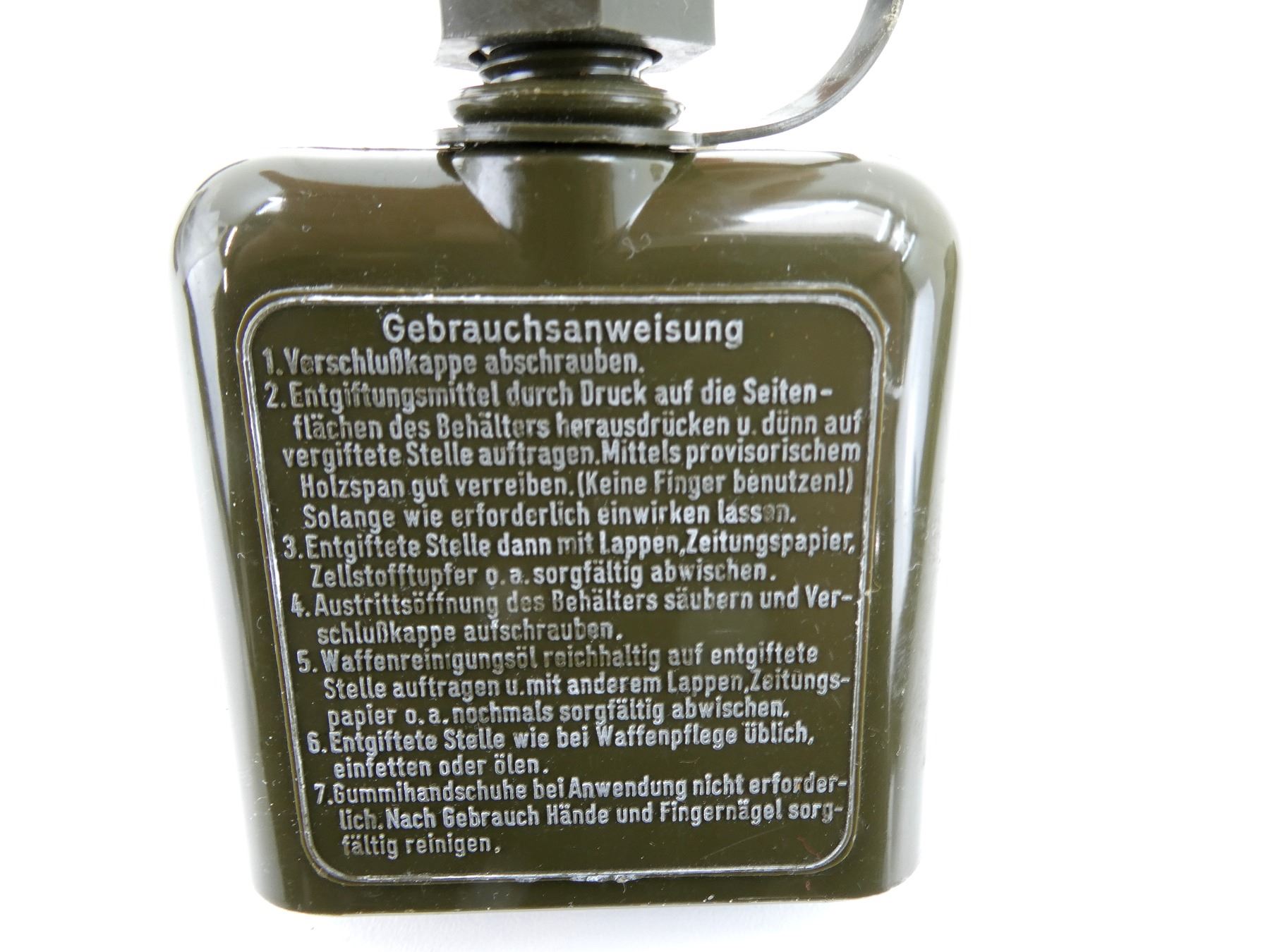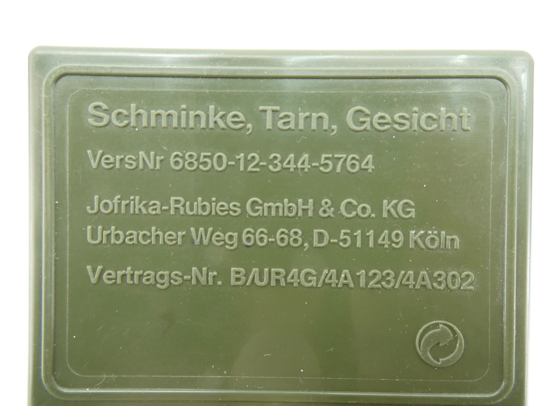 LOT INCLUDES; (1) BUNDESWEHR HEAD WARMER (KOPFHAUBE) WORN UNDER STEEL HELMET, LABEL MARKED: "NITZSCHE, 7/88, H 0107" ETC., SHOWS AGE / WEAR, (1) BUNDESWEHR ENLISTED MAN'S PAIR OF LEATHER GLOVES, GREY, LABEL MARKED: "10 10/02 2708H", WOOL / FELT LINED, SHOWS AGE / WEAR, (1) GREEN COVER FOR THE FLAME-RETARDANT PROTECTIVE HELMET, COMES WITH INSTRUCTIONAL SHEET, LABEL ON COVER MARKED: "BUND, EINSATZSCHUTZHELM, TARNUEBERZUG ZE, 53690, BATEX, TECHNISCHE TEXT, GMBH", "NOMEX", ETC., VELCRO EDGES, COMES WITH STRIP OF VELCRO BACKING, (1) REPRODUCTION GERMAN ARMY CAMO HELMET COVER, NO VISIBLE MARKINGS, SHOWS AGE / WEAR, (1) BUNDESWEHR FAT / BUTTER DISH, TAN PLASTIC CONSTRUCTION, MARKED: "BGS" ON THE BOTTOM, APPROX. 4 3/8" DIA., (2) GREEN PLASTIC RIFLE OILERS, ONE MARKED: "6850-12-120-0815, WAFFEN, STR 1957 P51", OTHER MARKED: "12-120-0815, WAFFEN, PSL, 62" ETC. & (1) FACE PAINT KIT, GREEN PLASTIC CONTAINER, MARKED: "SCHMINKE, TARN, GESICHT, VERSNR 6850-12-344-5764" ETC. SEE PHOTOS.