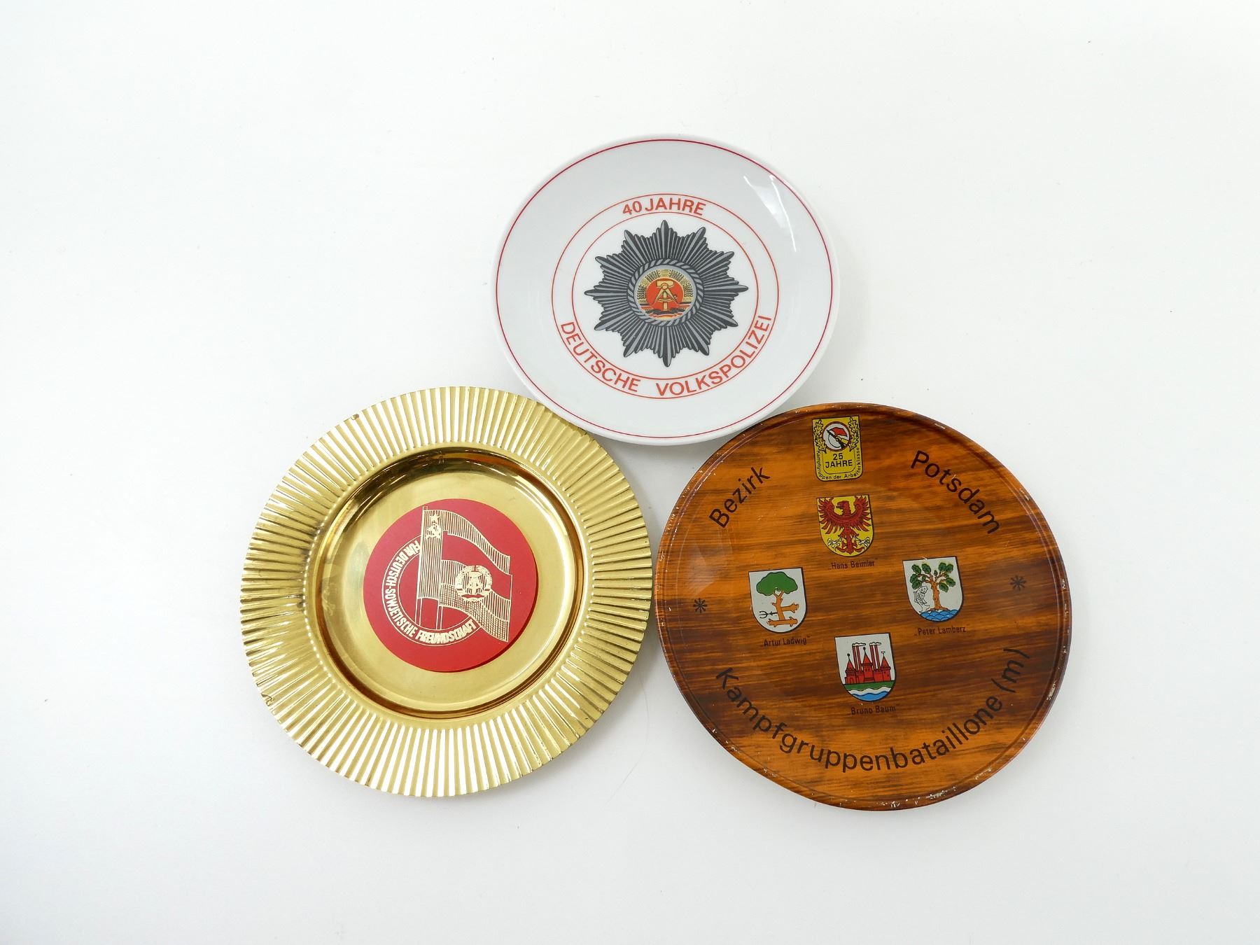 LOT INCLUDES; (1) EAST GERMAN POLICE COMMEMORATIVE PLATE, MARKED: "40 JAHRE, DEUTSCHE VOLKSPOLIZEI (40 YEARS GERMAN PEOPLE'S POLICE)" WITH EAST GERMAN POLICE SYMBOL, MAKER'S MARK ON BACK OF PLATE, APPROX. 7 5/8" DIA., (1) EAST GERMAN COMMEMORATIVE BRASS WITH RED CENTER WALL PLATE, RED CENTER MARKED: "FUR DEUTSCH-SOWJETISCHE FREUNDSCHAFT (FOR GERMAN-SOVIET FRIENDSHIP)", HANGER ON BACK, NO VISIBLE MAKER'S MARK, APPROX. 8.25" DIA. & (1) EAST GERMAN MAGNETIC METAL COMMEMORATIVE PLATE WITH WOOD LIKE PATTERN, MARKED: "BEZIRK, POTSDAM, KAMPFGRUPPENBATAILLONE (M) (DISTRICT POTSDAM COMBAT GROUP BATTALIONS)", TOP CREST MARKED: "25 YEARS OF THE WORKERS' COMBAT GROUPS", HANS BEIMLER CREST, ARTUR LADWIG CREST, PETER LAMBERZ CREST & BRUNO BAUM CREST, NO VISIBLE MAKER'S MARKS, APPROX. 8 1/8" DIA. SEE PHOTOS.