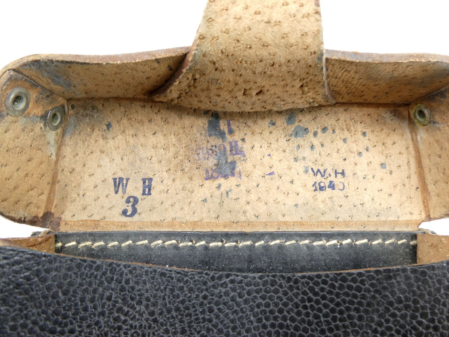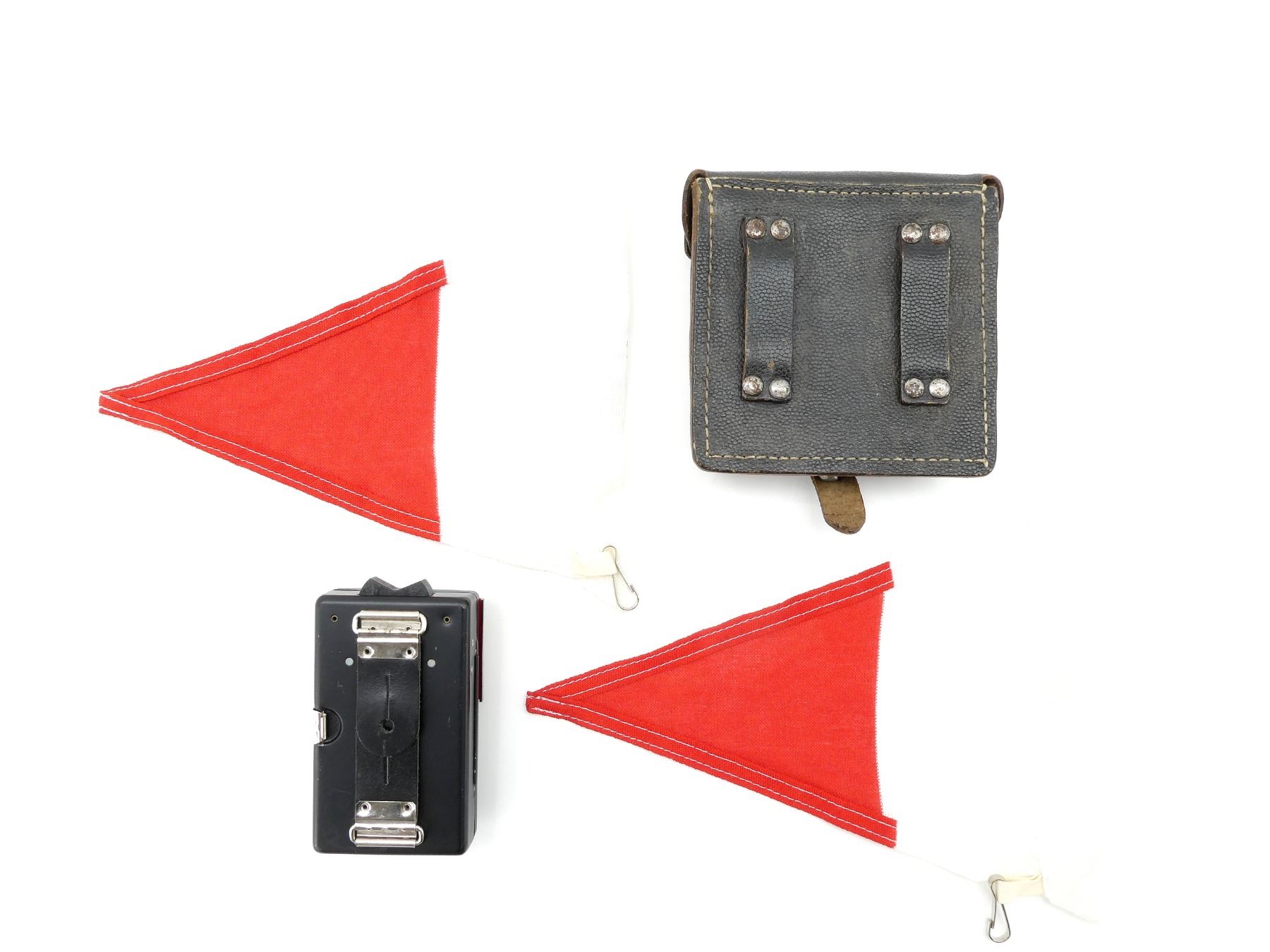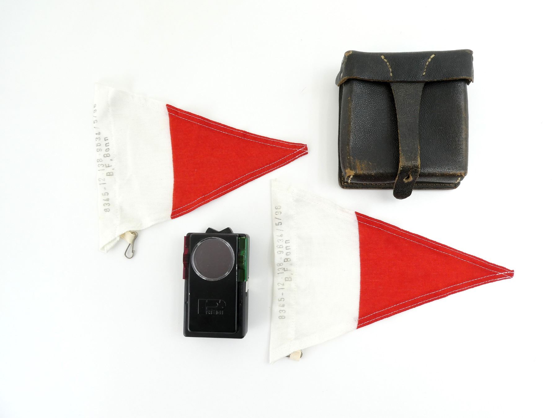 LOT INCLUDES; (1) BLACK PEBBLED LEATHER AMMO POUCH, CONSIGNOR STATES: "WWII GERMAN TOOL POUCH FOR AN MG 15", INK STAMPED: "WH" OVER "3", "W.H" OVER "1940" & VARIOUS OTHER FAINT / UN-CLEAR MARKINGS, STEEL FITTINGS, TWO BELT LOOPS, SHOWS AGE / WEAR, (2) GERMAN NAVY (BUNDESMARINE) SIGNAL FLAGS, BOTH MARKED: "8345-12-138-9634 / 5 / 96, B.F. BONN", BOTH HAVE STRAP WITH METAL HOOK, APPROX. 10.5" X 8 3/8" & (1) UNKNOWN MILITARY FLASHLIGHT, BLACK PAINTED STEEL FLASHLIGHT, UN-TESTED, ONE BULB INSTALLED, LENS INTACT, TWO SELECTOR SWITCHES TO RAISE COLOURED FILTERS, GREEN / RED FILTERS, INTACT, SWITCHES MOVE / WORK, BLACK LEATHER TABS TO FIT ON BELT, FRONT MARKED: "PREMI". SEE PHOTOS.