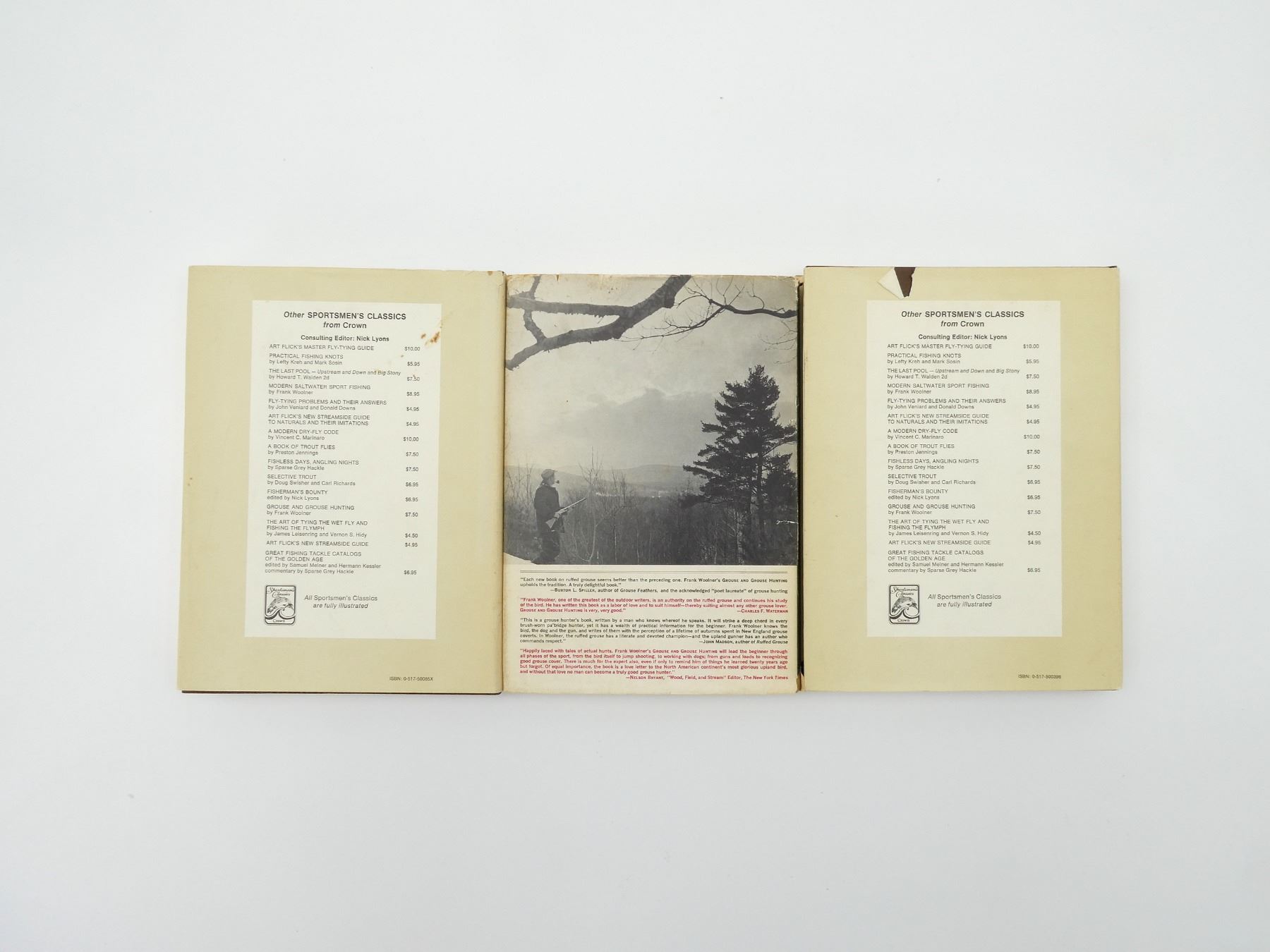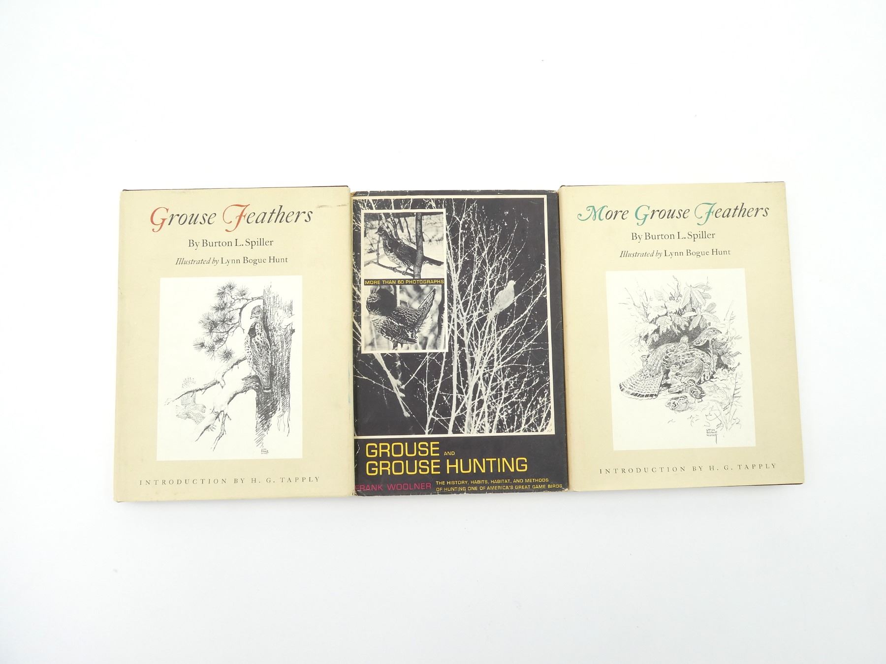 LOT INCLUDES; "GROUSE FEATHERS" BOOK BY BURTON L. SPILLER, HARD COVER WITH DUST COVER, ISBN: 0-517-50085X, (1) "MORE GROUSE FEATHERS" BY BURTON L. SPILLER, HARD COVER WITH DUST COVER, ISBN: 0-517-500396 & (1) "GROUSE AND GROUSE HUNTING" BOOK BY FRANK WOOLNER, HARD COVER WITH DUST COVER, COPYRIGHT 1970. SEE PHOTOS.