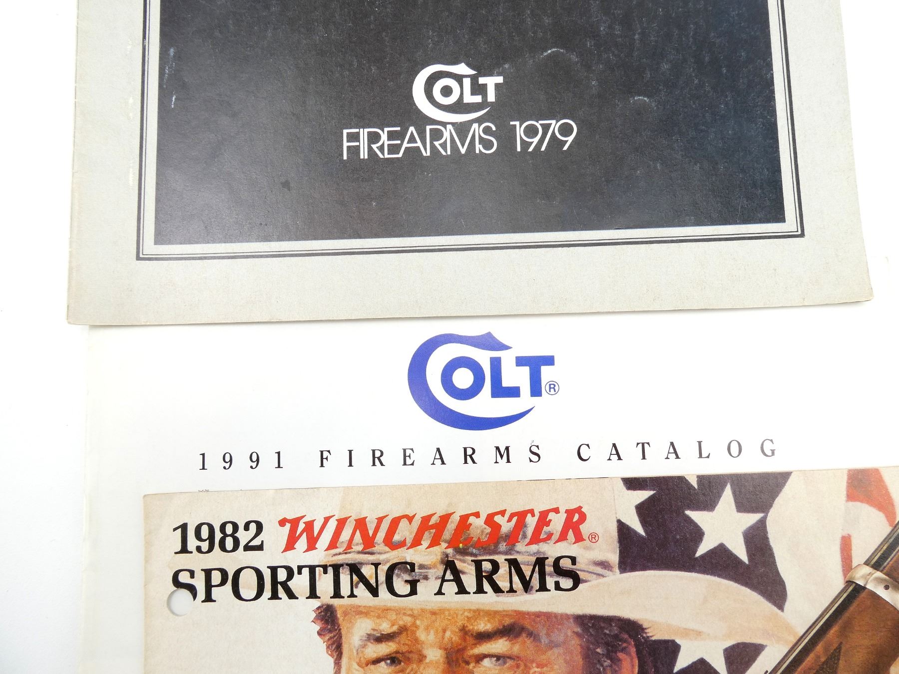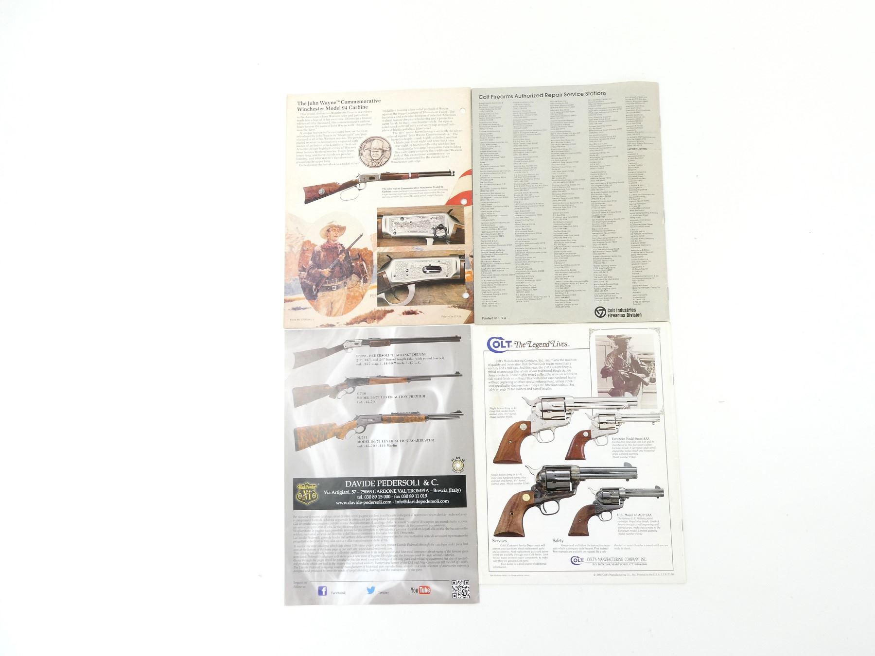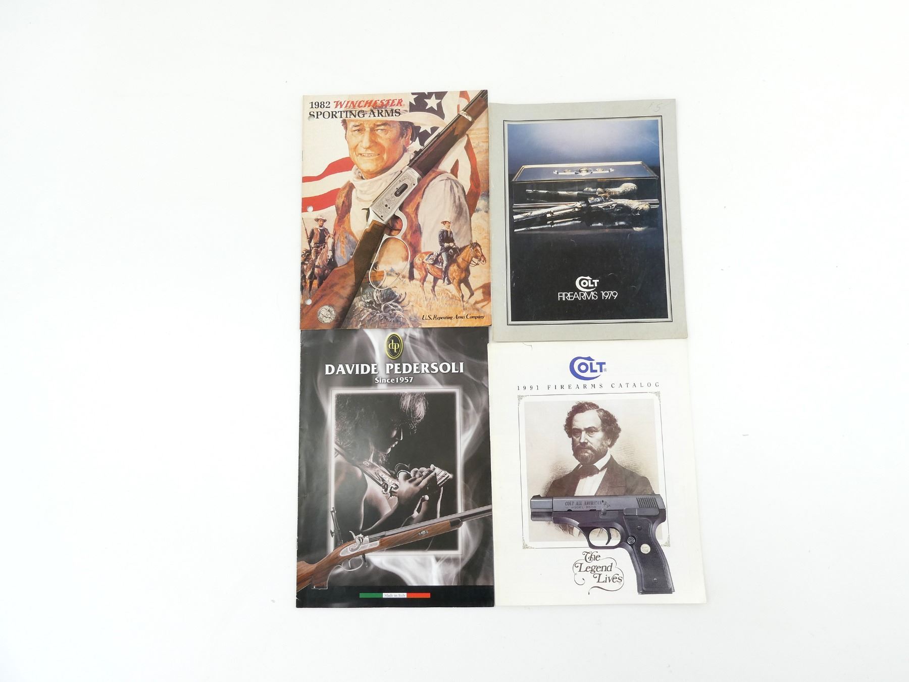 LOT INCLUDES; (1) "DAVID PEDERSOLI, SINCE 1957" CATALOGUE, (1) "1982 WINCHESTER SPORTING ARMS" CATALOGUE, (1) "COLT FIREARMS 1979" CATALOGUE & (1) "COLT 1991 FIREARMS CATALOG, THE LEGEND LIVES" CATALOGUE. SEE PHOTOS.