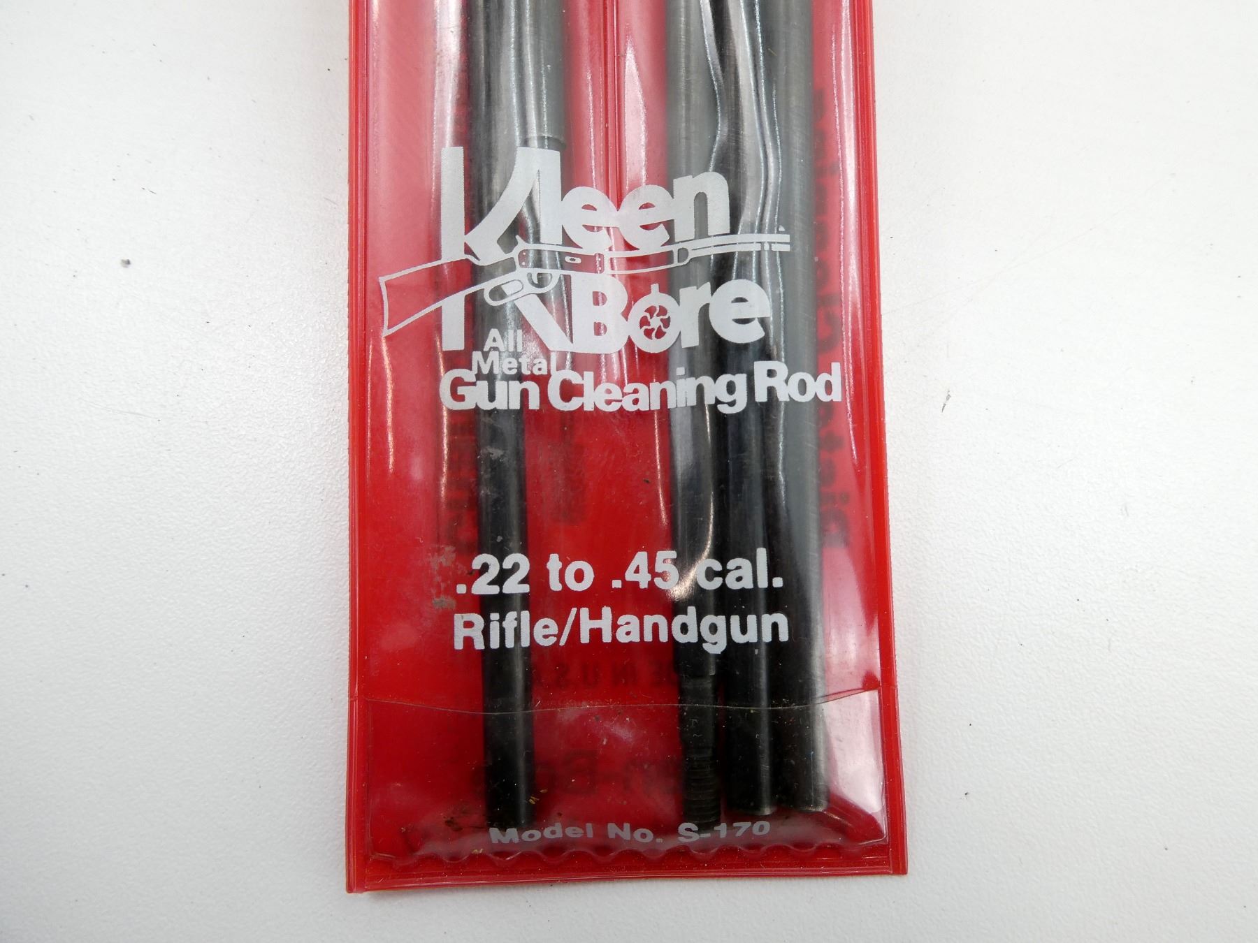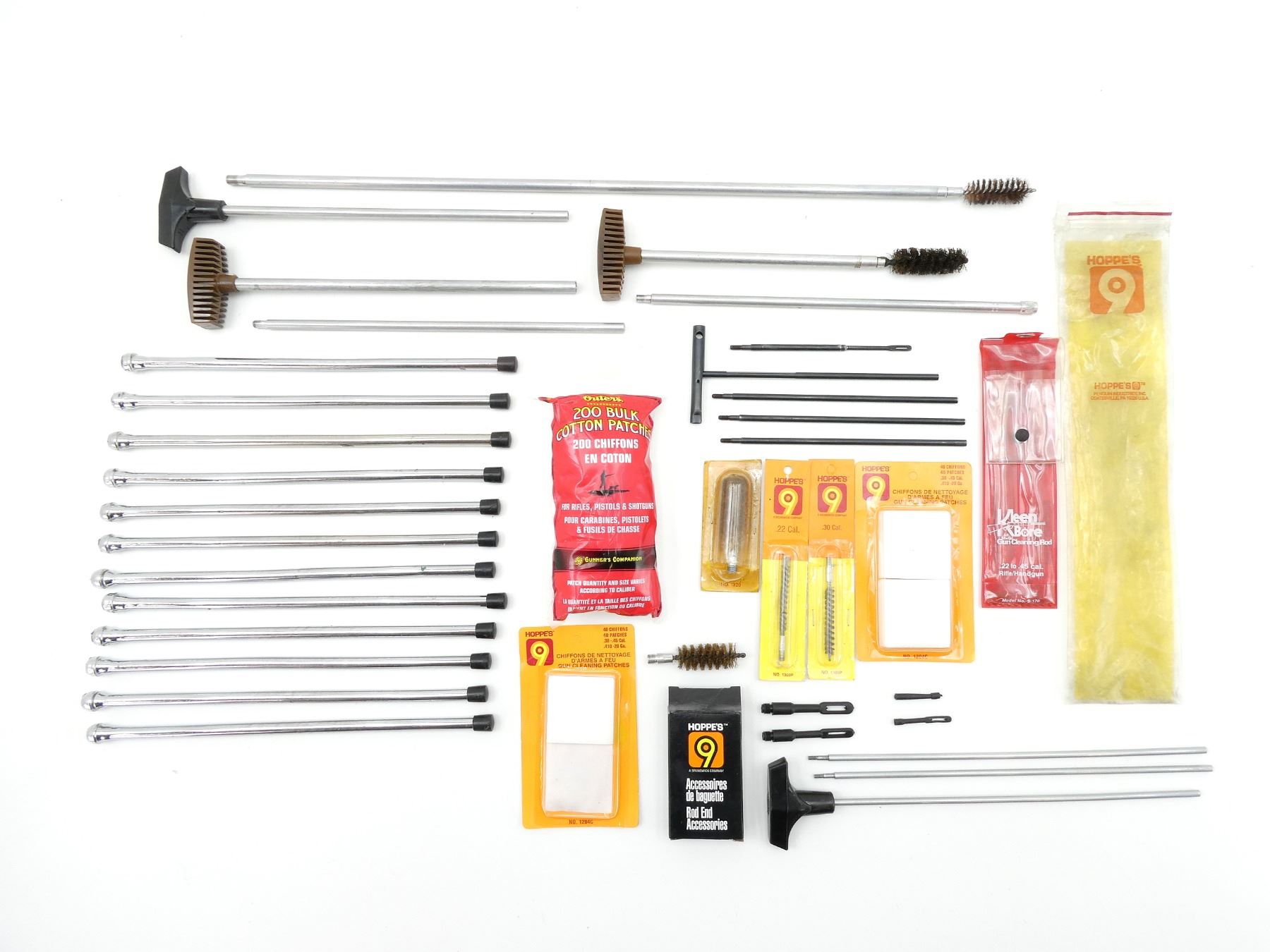 LOT INCLUDES; (2) OUTERS CLEANING ROD, (2) HOPPE'S CLEANING ROD, (1) KLEEN BORE GUN CLEANING ROD, MODEL #: S-170, FITS .22 TO .45 CAL., (1) HOPPE'S .22 CAL. CLEANING BRUSH, ITEM #: 1303P, IN ORIGINAL PACKAGING (OPENED), (1) HOPPE'S .30 CAL. CLEANING BRUSH, ITEM #: 1305P, IN ORIGINAL PACKAGING (OPENED), (2) PACK OF 40 HOPPE'S PATCHES, NEW OLD STOCK, SEALED IN ORIGINAL PACKAGING & (1) OUTERS 200 BULK COTTON PATCHES, APPEARS NEW OLD STOCK, IN ORIGINAL PACKAGING, ETC. SEE PHOTOS.