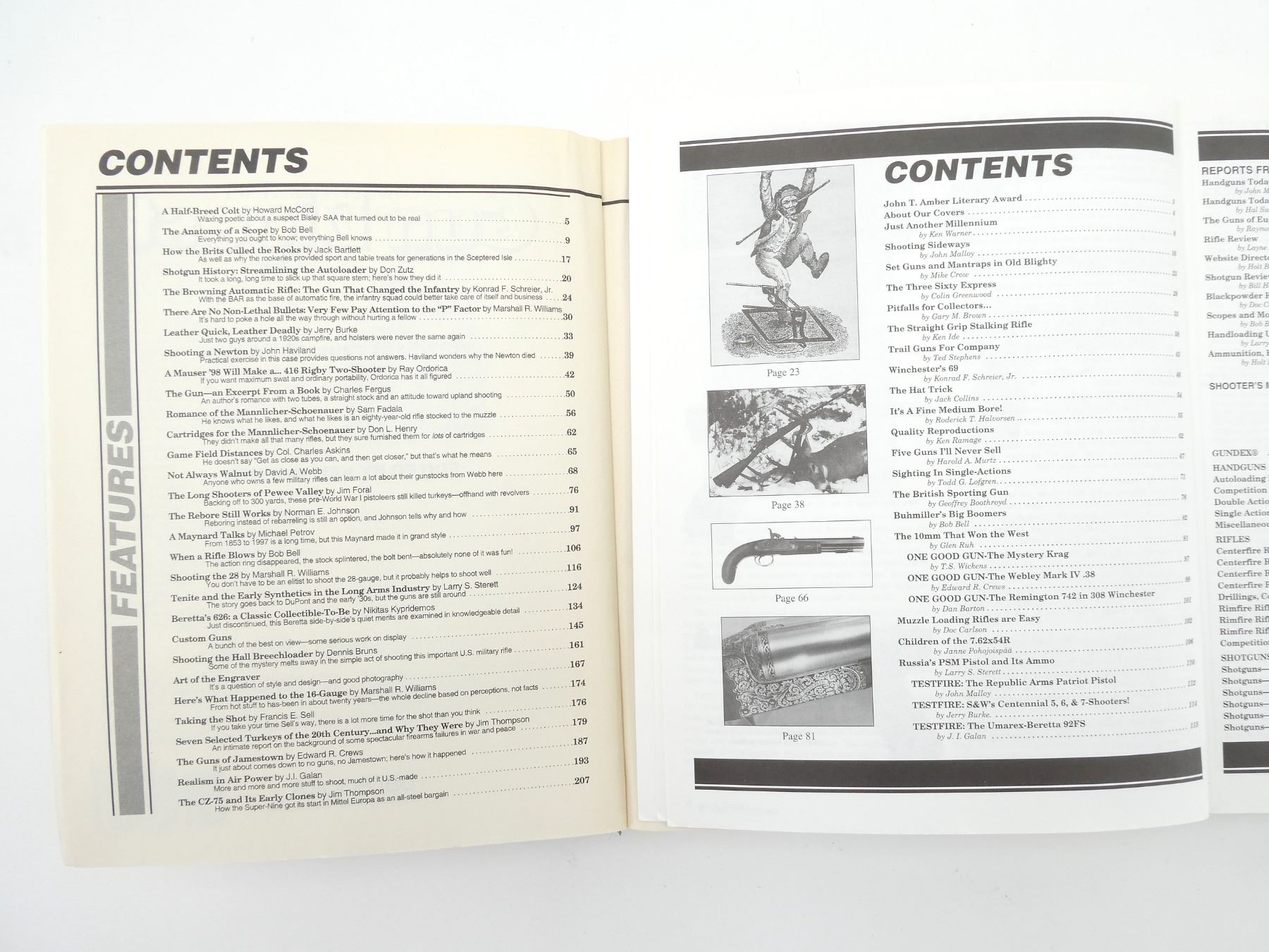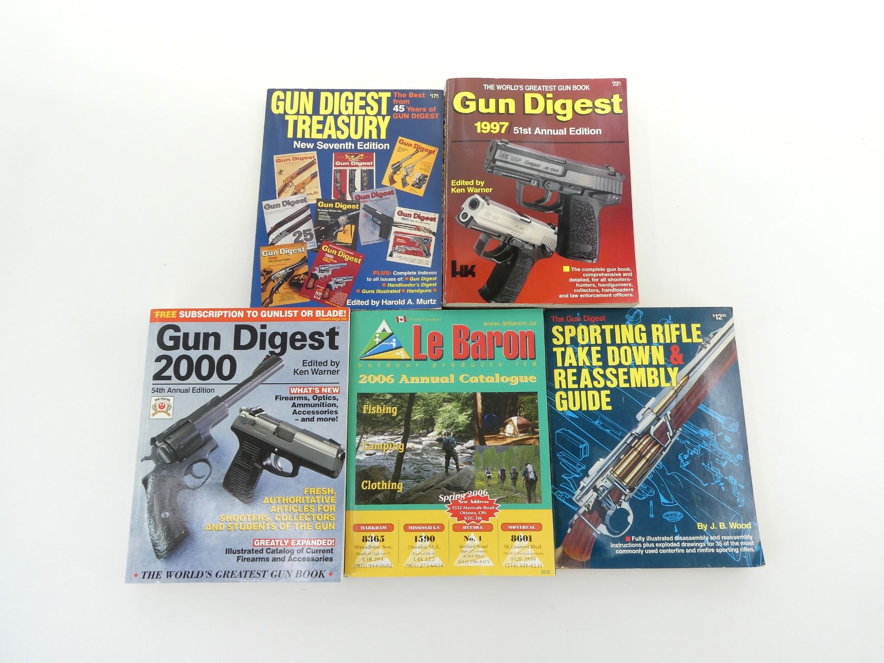 LOT INCLUDES; (1) "THE GUN DIGEST SPORTING RIFLE TAKE DOWN & REASSEMBLY GUIDE", BY J. B. WOOD, SOFT COVER, ISBN: 0-910676-36-4, (1) "GUN DIGEST TREASURY", SEVENTH EDITION, EDITED BY HAROLD A. MURTZ, SOFT COVER, ISBN: 0-87349-156-4, (1) "GUN DIGEST 1997", 51ST ANNUAL EDITION, EDITED BY KEN WARNER, SOFT COVER, ISBN: 0-87349-181-5, (1) "GUN DIGEST 2000", 54TH ANNUAL EDITION, EDITED BY KEN WARNER, SOFT COVER, ISBN: 0-87341-752-6 & (1) "LE BARON 2006 ANNUAL CATALOGUE", BY LE BARON OUTDOOR PRODUCTS LTD., SOFT COVER. SEE PHOTOS.