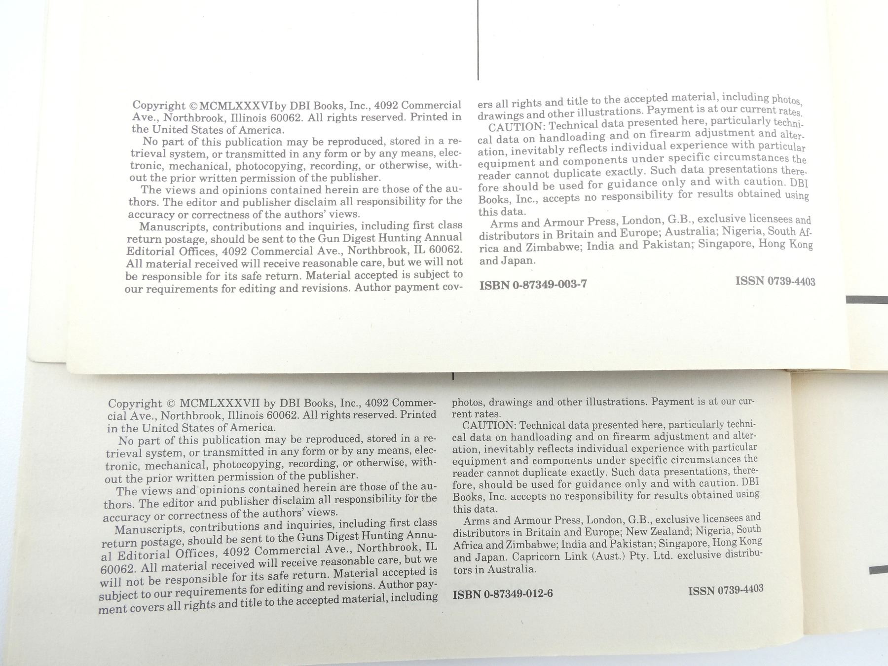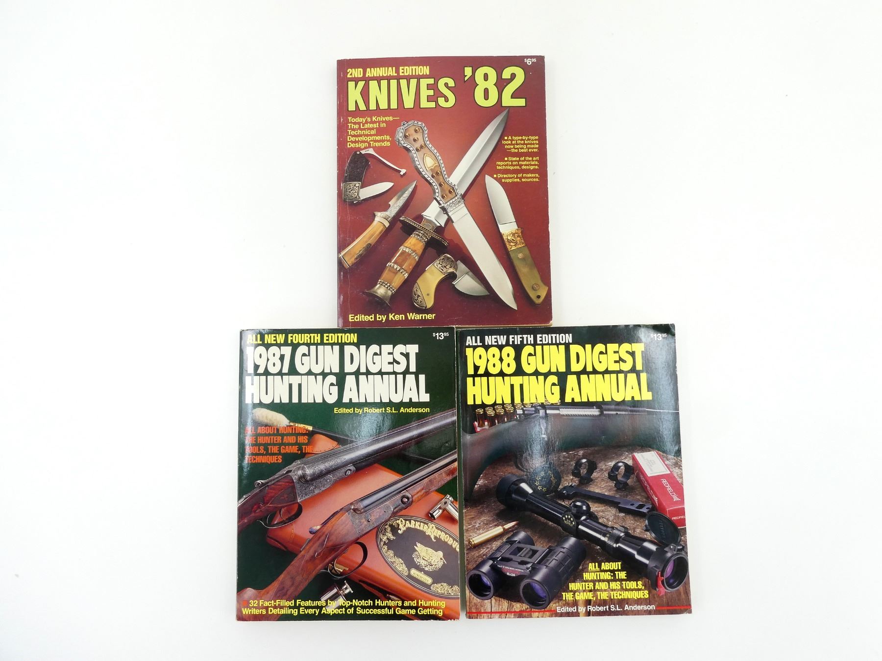 LOT INCLUDES; (1) "FOURTH EDITION 1987 GUN DIGEST HUNTING ANNUAL", EDITED BY ROBERT S.L. ANDERSON, SOFT COVER, ISBN: 0-87349-003-7, (1) "FIFTH EDITION 1988 GUN DIGEST HUNTING ANNUAL", EDITED BY ROBERT S.L. ANDERSON, SOFT COVER, ISBN: 0-87349-012-6 & (1) "2ND ANNUAL EDITION KNIVES '82", EDITED BY KEN WARNER, SOFT COVER, ISBN: 0-910676-34-8. SEE PHOTOS.