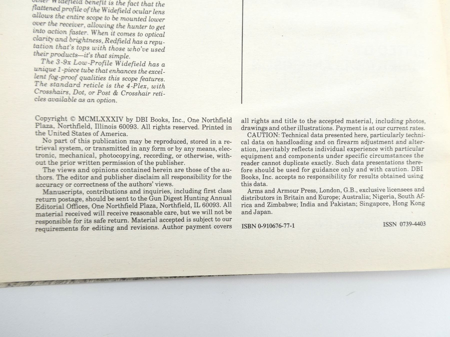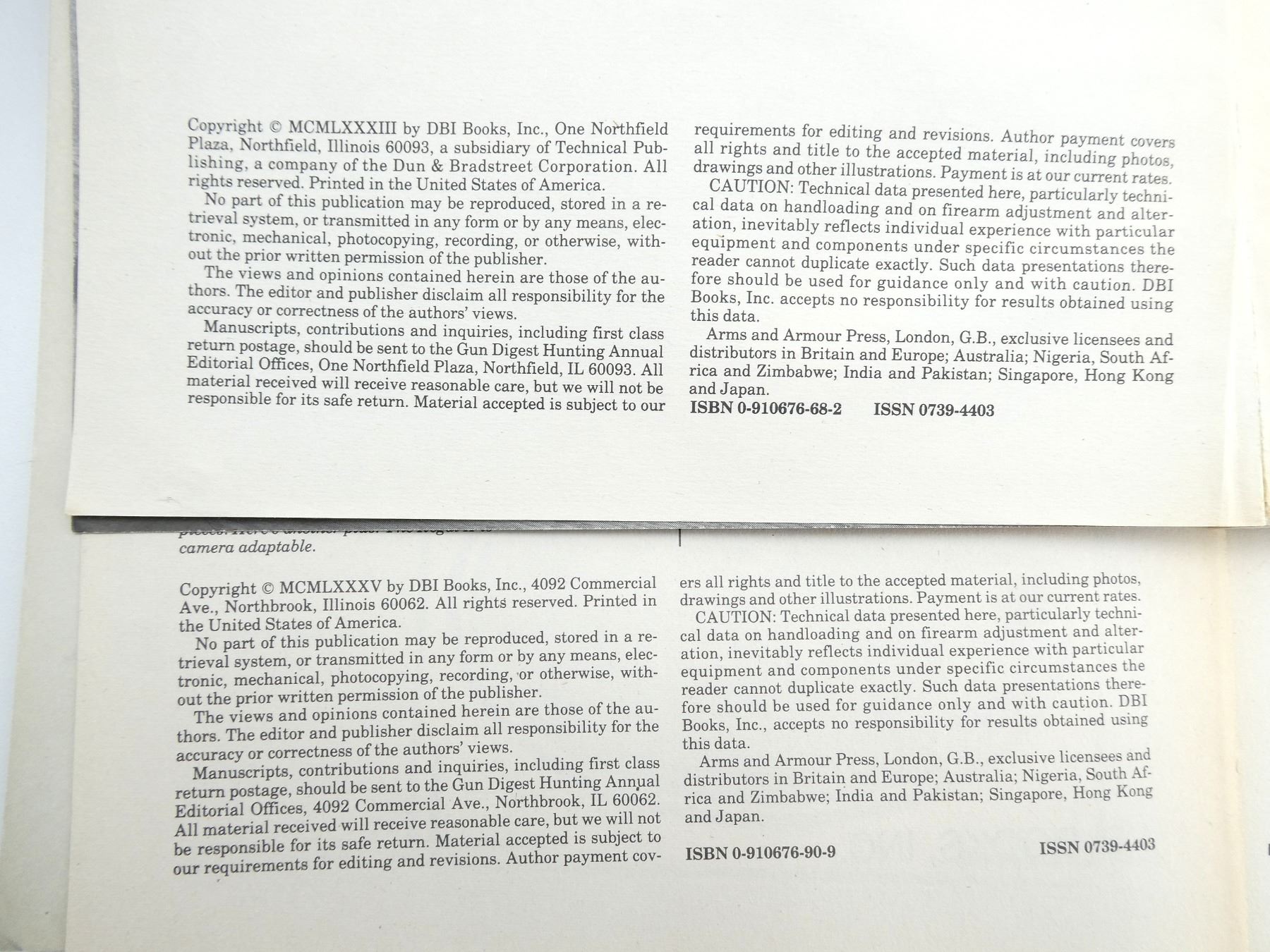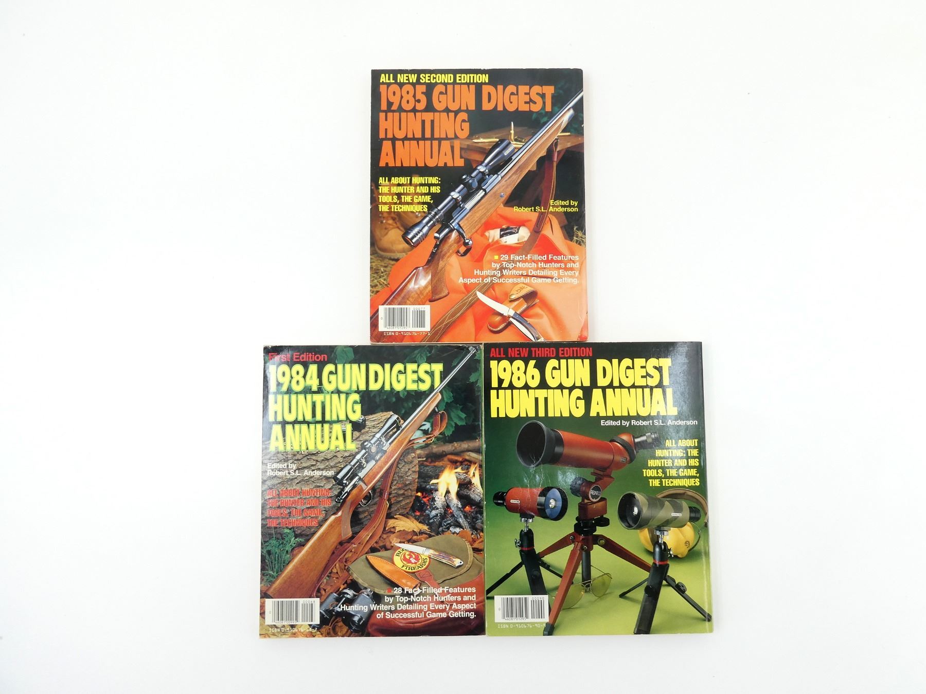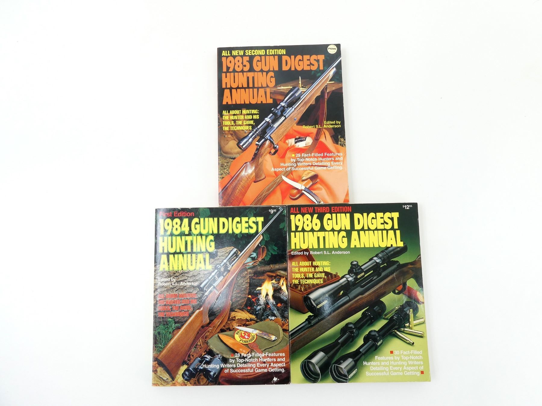 LOT INCLUDES; (1) "FIRST EDITION 1984 GUN DIGEST HUNTING ANNUAL", EDITED BY ROBERT S.L. ANDERSON, SOFT COVER, ISBN: 0-910676-68-2, (1) "SECOND EDITION 1985 GUN DIGEST HUNTING ANNUAL", EDITED BY ROBERT S.L. ANDERSON, SOFT COVER, ISBN: 0-910676-77-1 & (1) "THIRD EDITION 1986 GUN DIGEST HUNTING ANNUAL", EDITED BY ROBERT S.L. ANDERSON, SOFT COVER, ISBN: 0-910676-90-9. SEE PHOTOS.