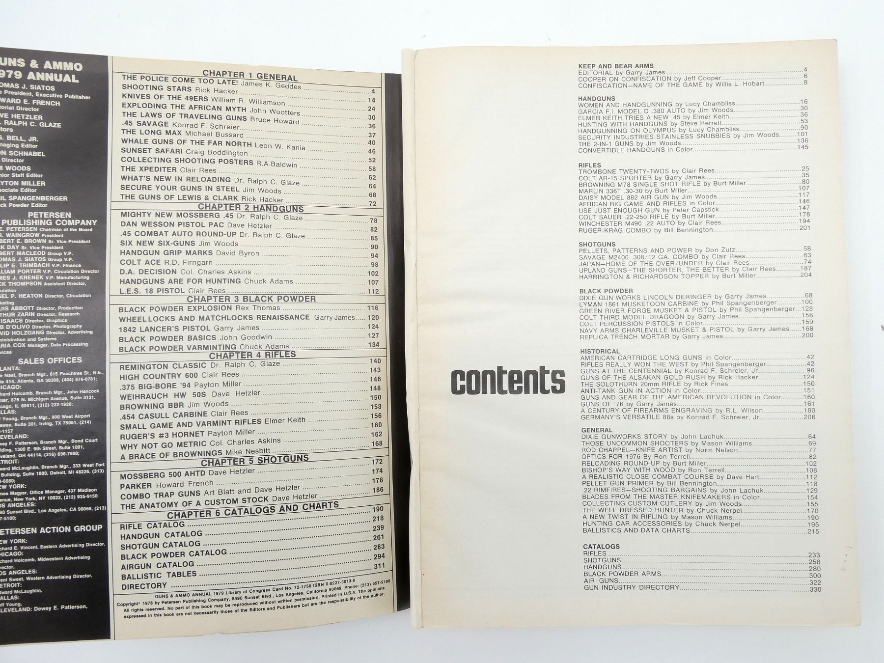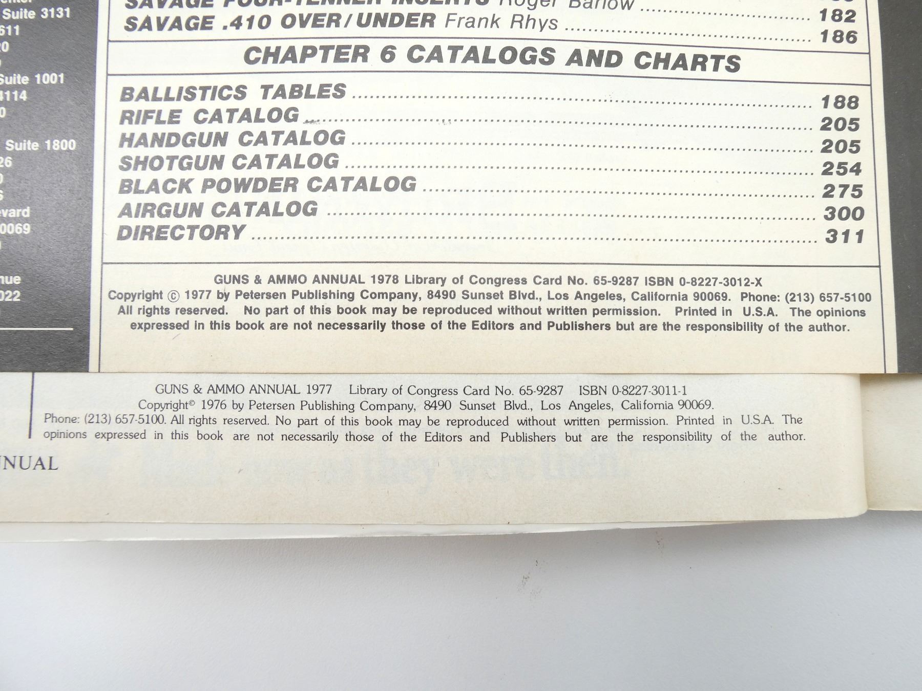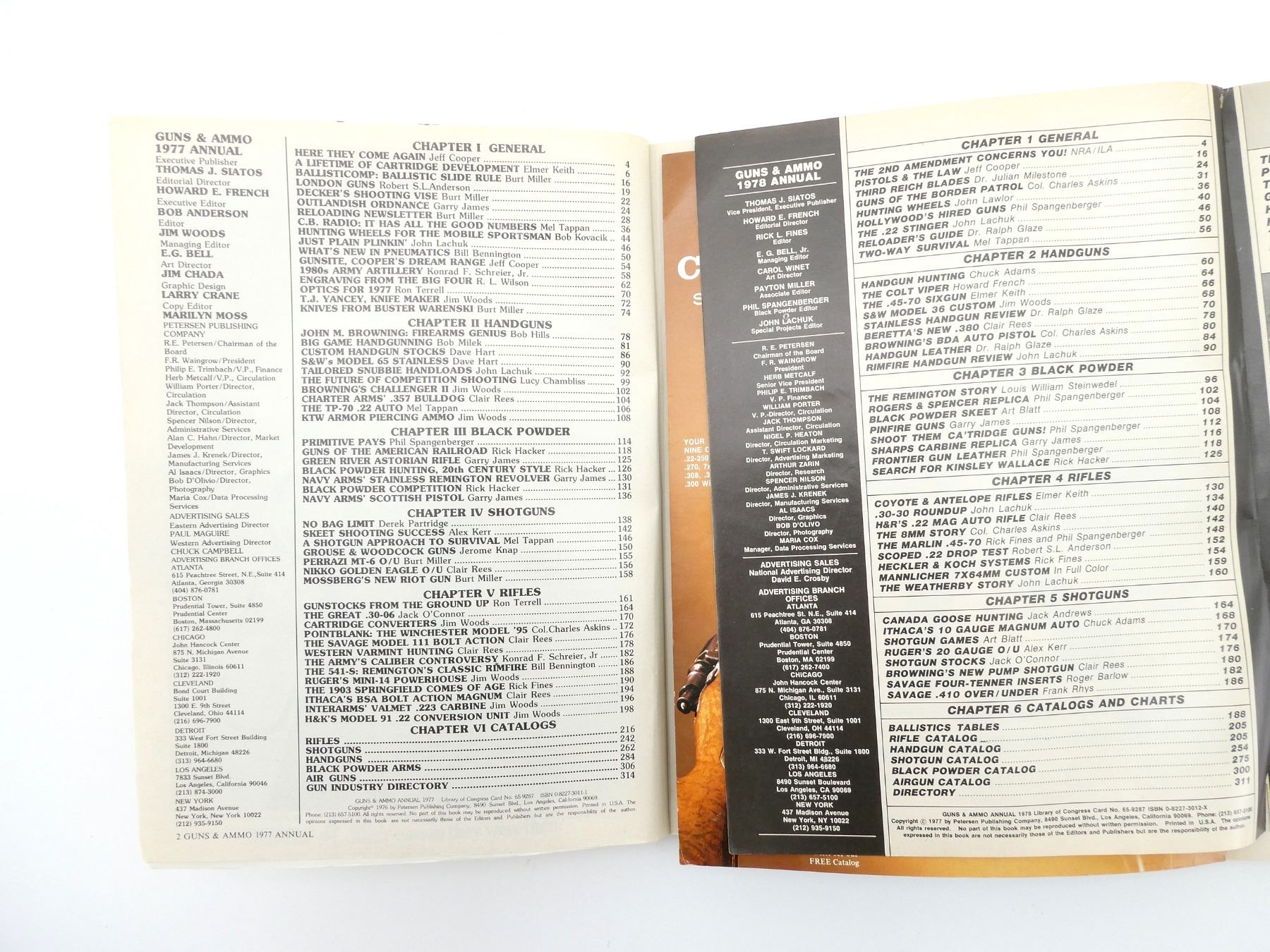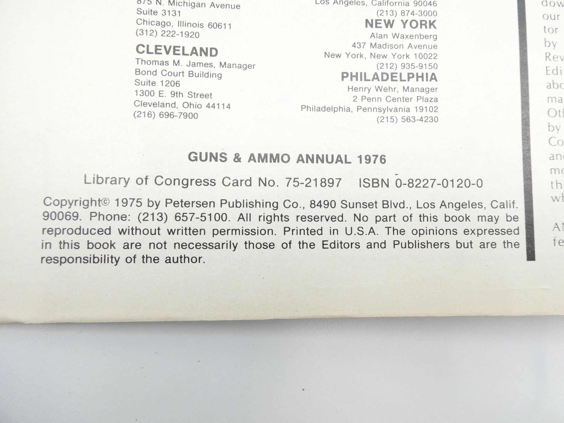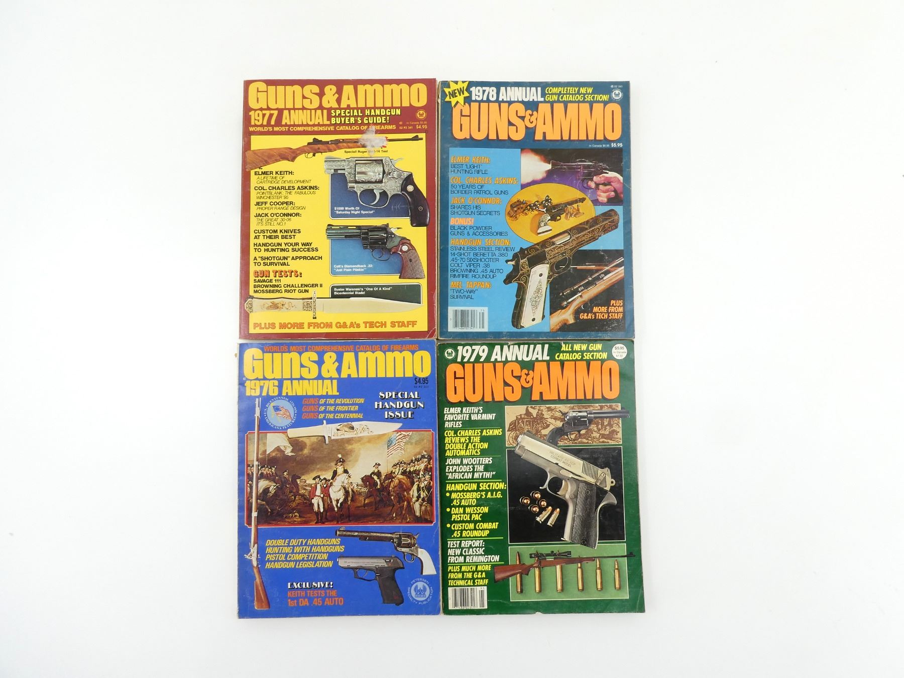 LOT INCLUDES; (4) "GUNS & AMMO ANNUAL" CATALOGUES DATED 1976 TO 1979, BY PETERSEN PUBLISHING COMPANY, SOFT COVERS, SERIES NOT COMPLETE / SOME ISSUES MISSING / MAY CONTAIN DUPLICATES. SEE PHOTOS.