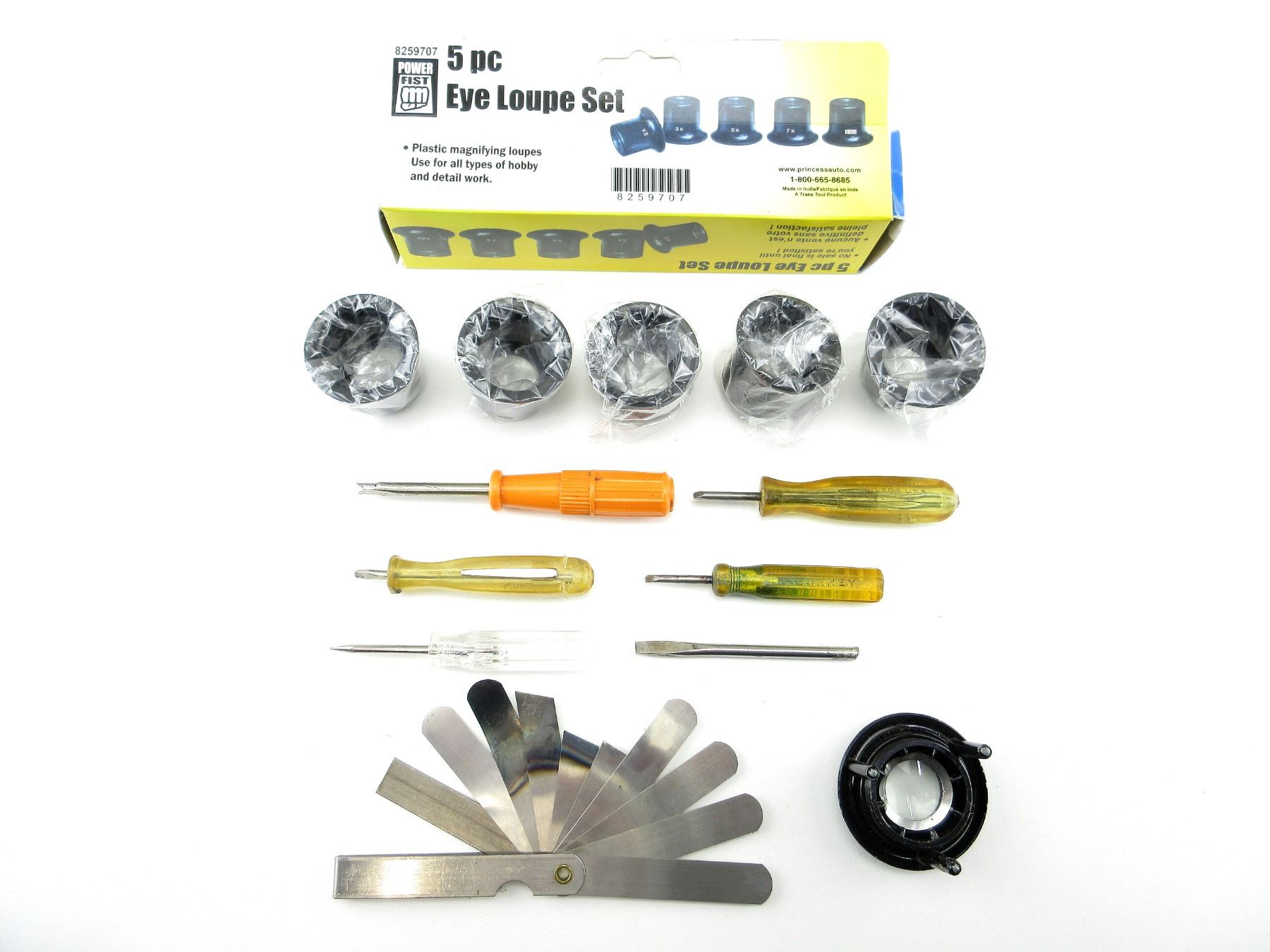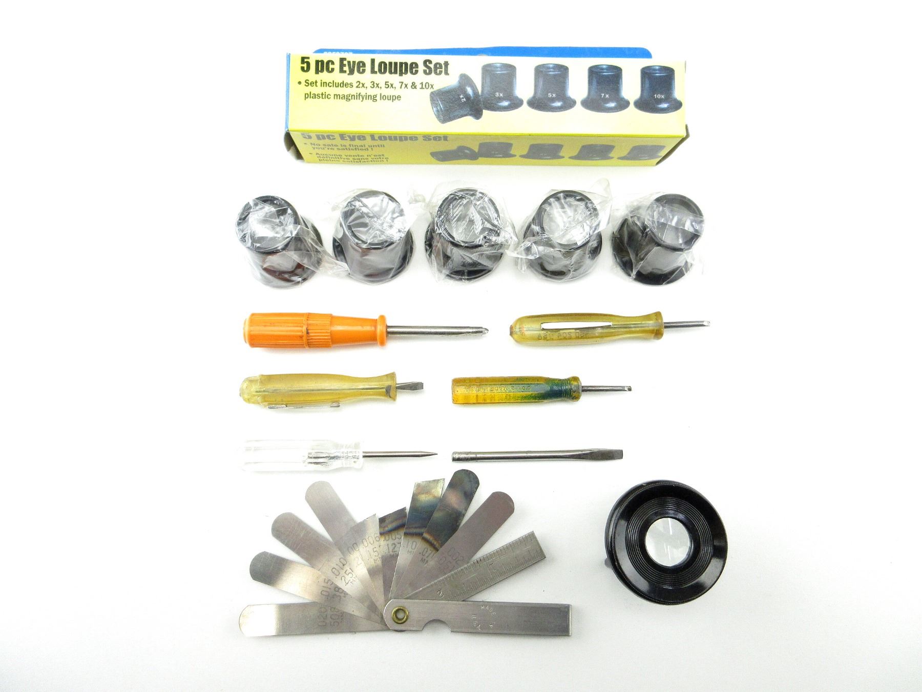 LOT INCLUDES; (6) ASSORTED SCREW DRIVERS, (1) 5-PC EYE LOUPE SET, IN ORIGINAL PACKAGING, (1) UNKNOWN EYE LOUPE, (1) UNKNOWN FEELER GAUGE, ETC. SEE PHOTOS.