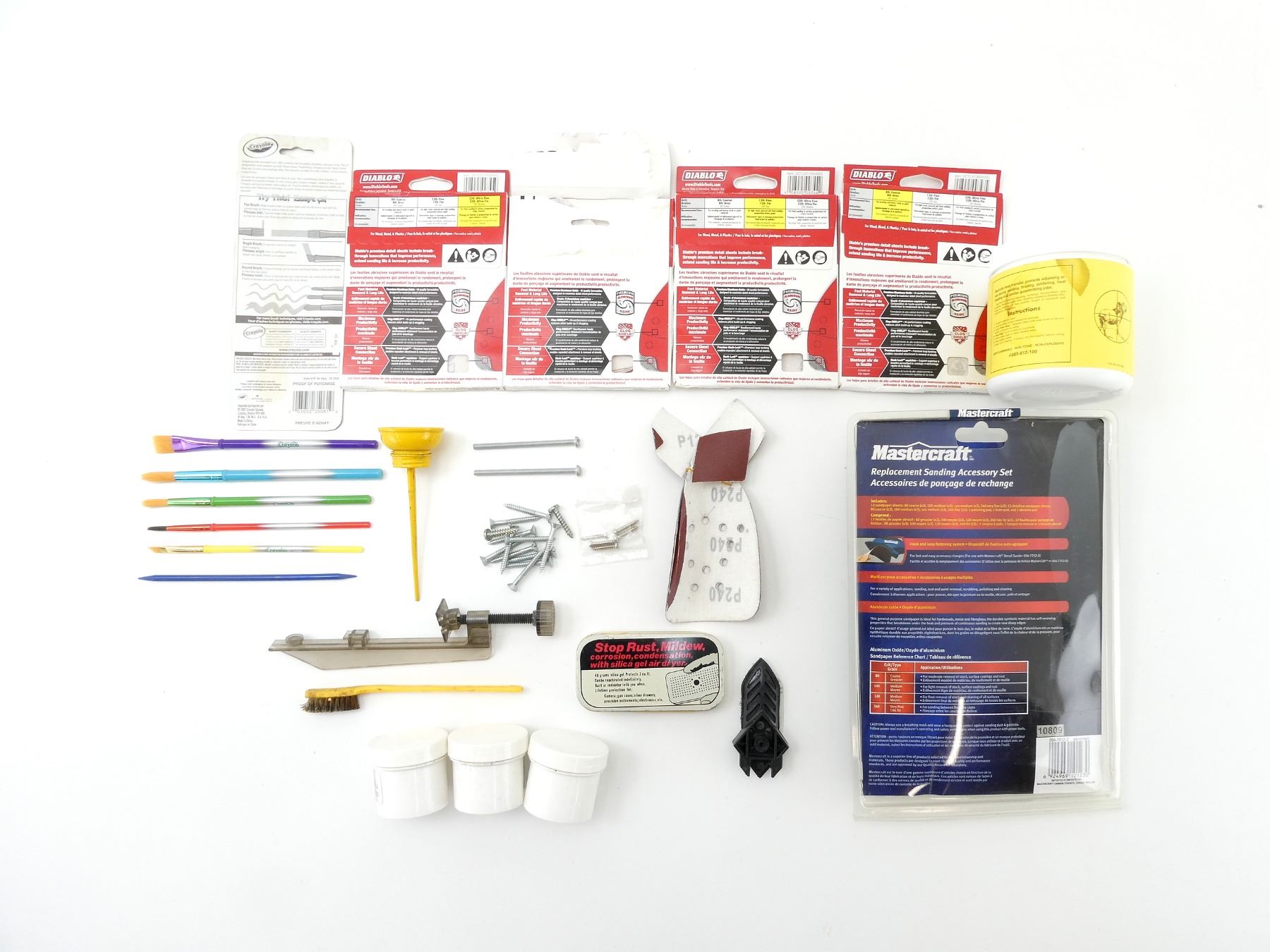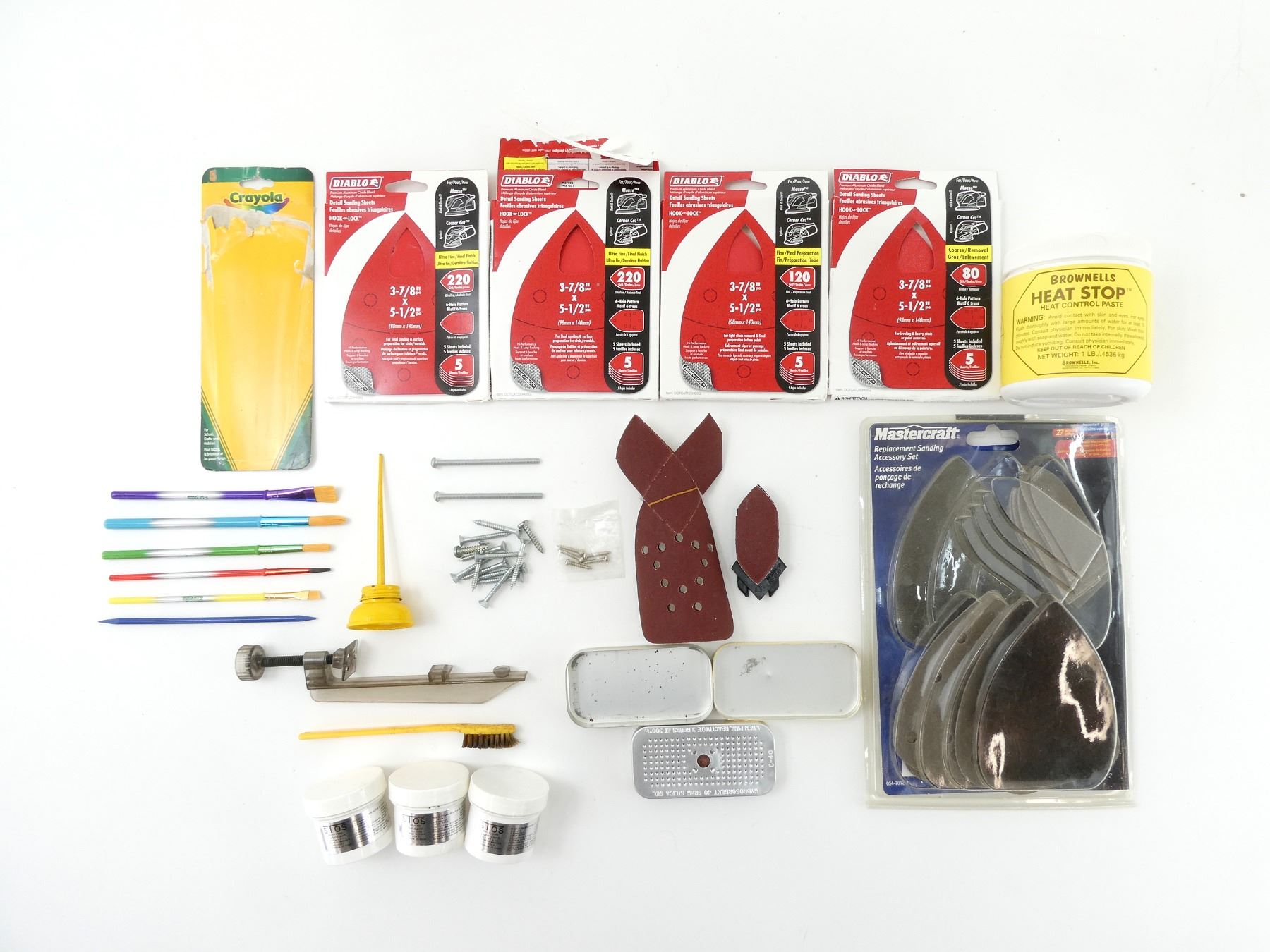 LOT INCLUDES; (4) PACKS OF DIABLO DETAIL SANDING SHEETS, 3 7/8" X 5.5", ULTRA FINE, 220 GRIT, MAY NOT BE COMPLETE / PIECES MAY BE MISSING, (1) MASTERCRAFT REPLACEMENT SANDING ACCESSORY SET, ASSORTED GRITS, MAY NOT BE COMPLETE / PIECES MAY BE MISSING, (1) SMALL OILER/LUBRICATOR, (1) 40 GRAMS SILICA GEL, (1) BROWNELL'S HEAT STOP, MAY NOT BE COMPLETE / PIECES MAY BE MISSING & (3) STOS MULTI-PURPOSE LUBRICANT, MAY NOT BE COMPLETE / PIECES MAY BE MISSING, ETC. SEE PHOTOS.